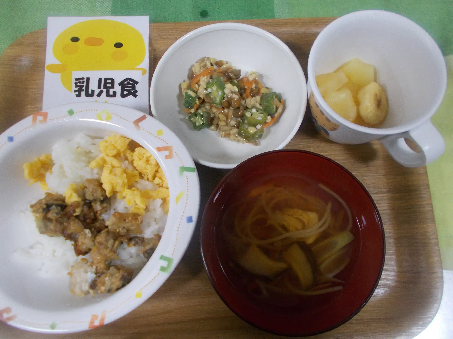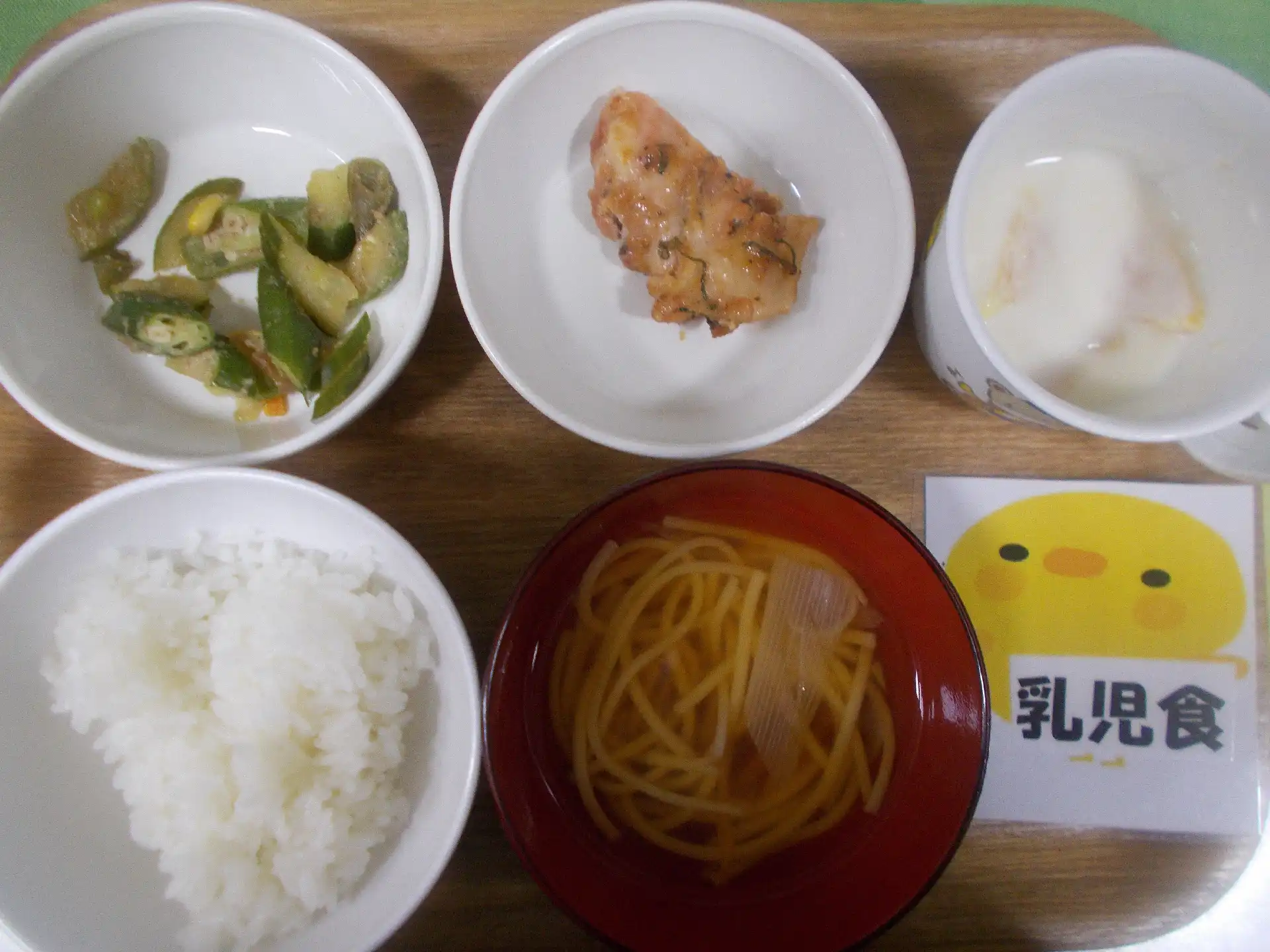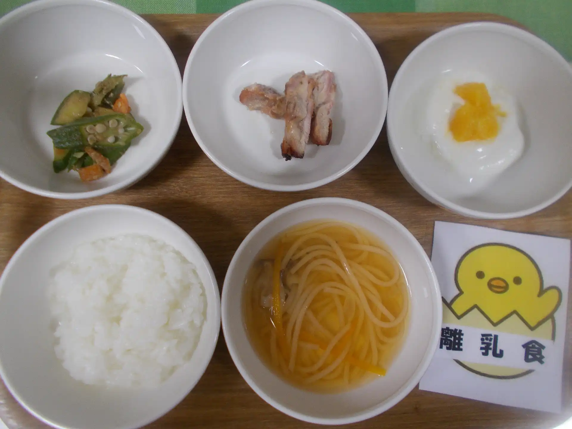 給食 | 刻み秋刀魚のかば焼き丼、ねばねば野菜の胡麻和え、そうめん汁、フルーツポンチ 離乳:乳児と同じ | ||