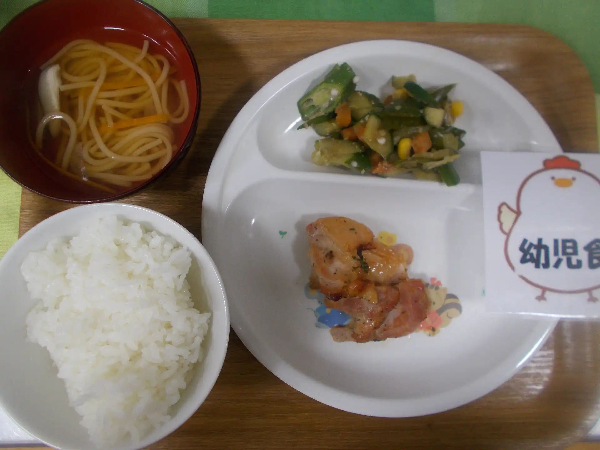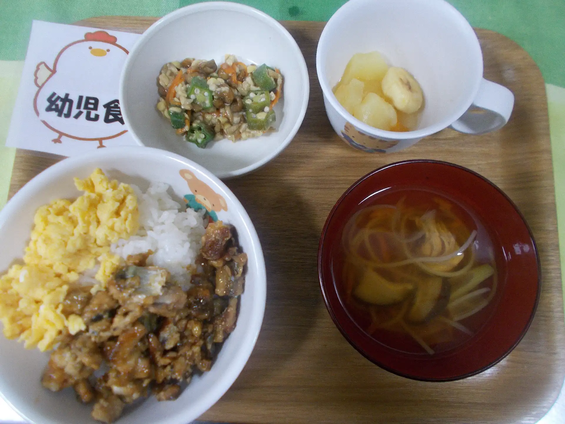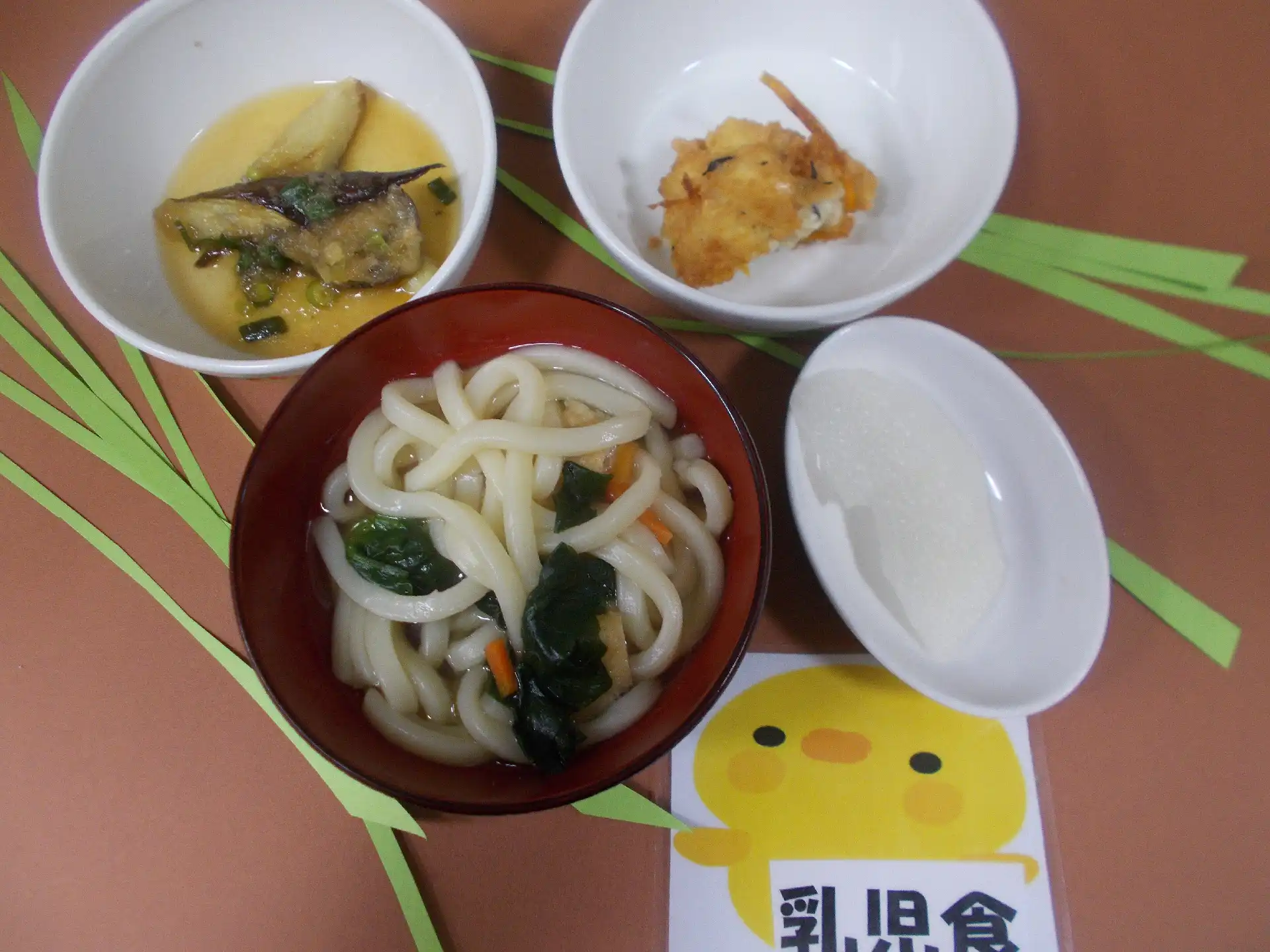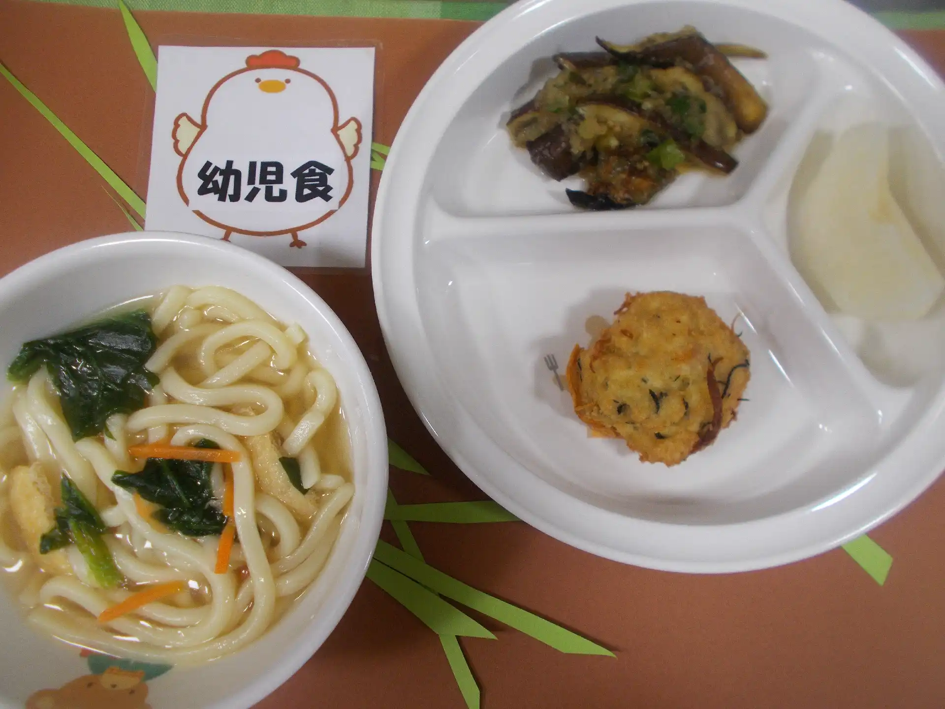 給食 | 刻み秋刀魚のかば焼き丼、ねばねば野菜の胡麻和え、そうめん汁、フルーツポンチ 離乳:乳児と同じ | ||