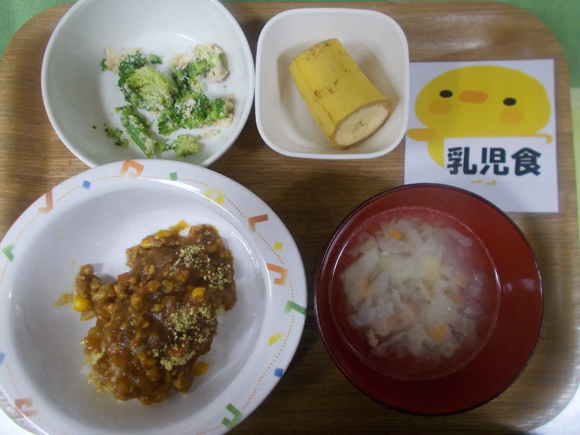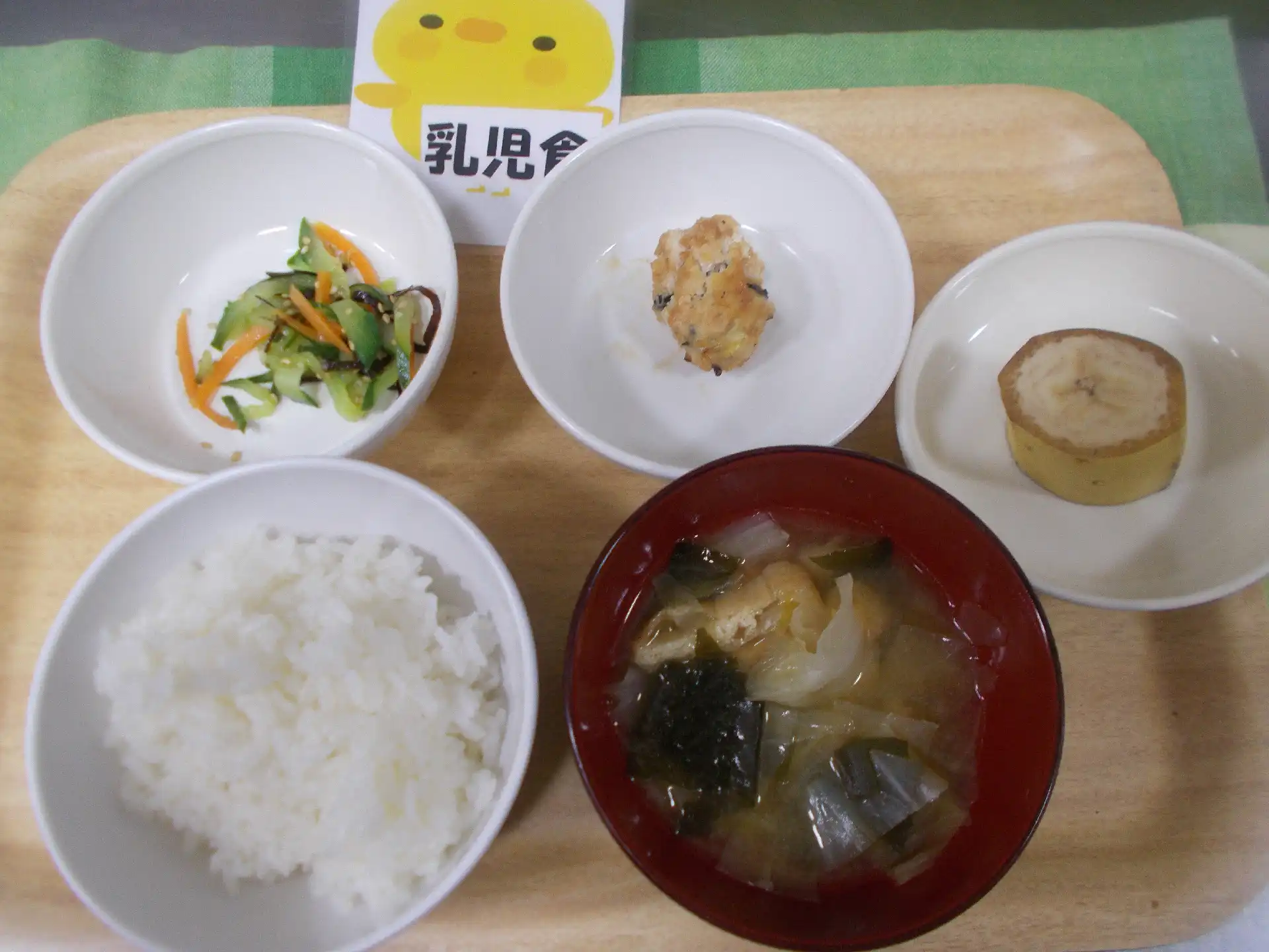 給食 | ご飯、照り焼きつくね、きゅうりの昆布和え、みそ汁、バナナ 離乳食:乳児と同じ | ||