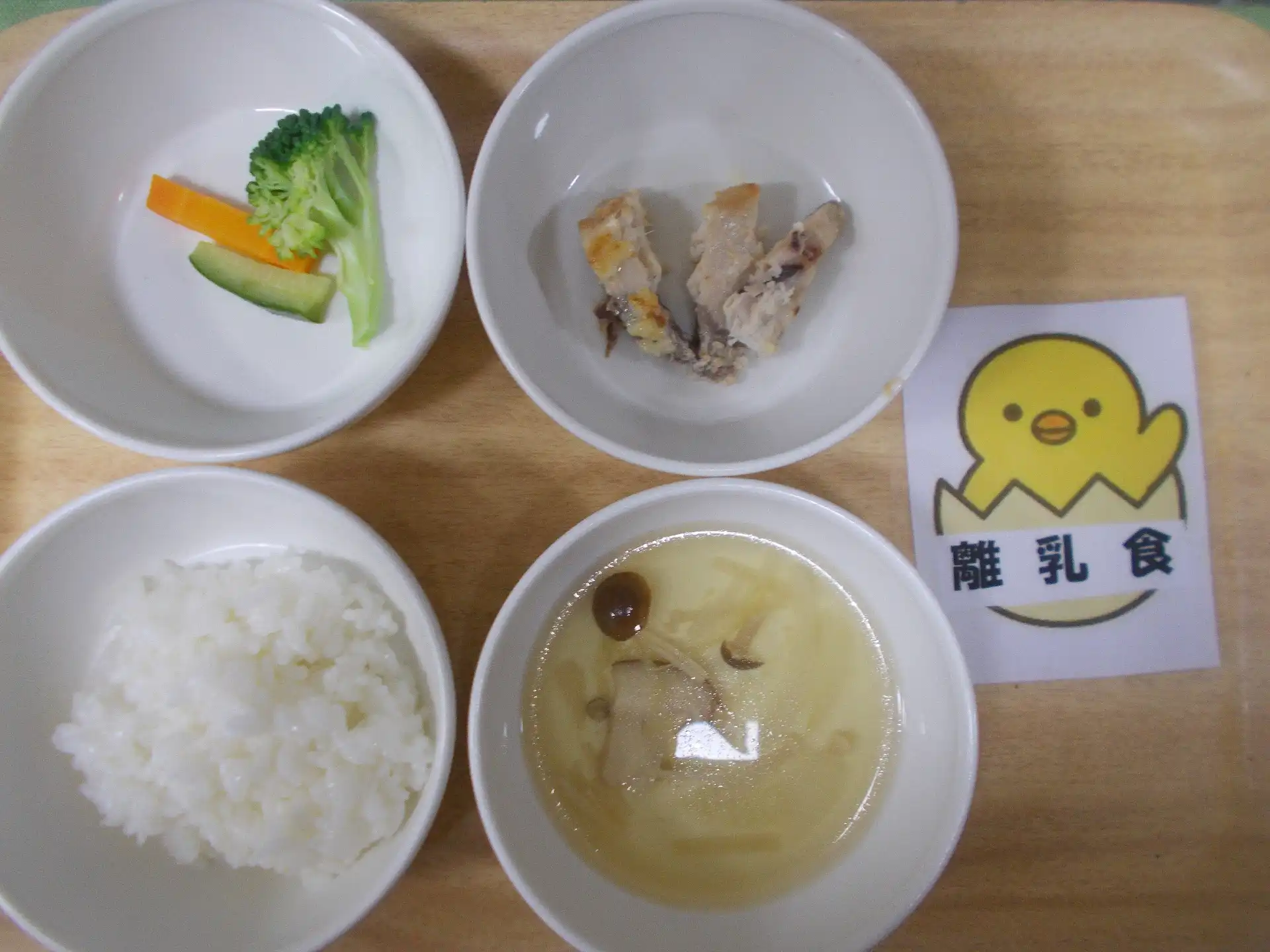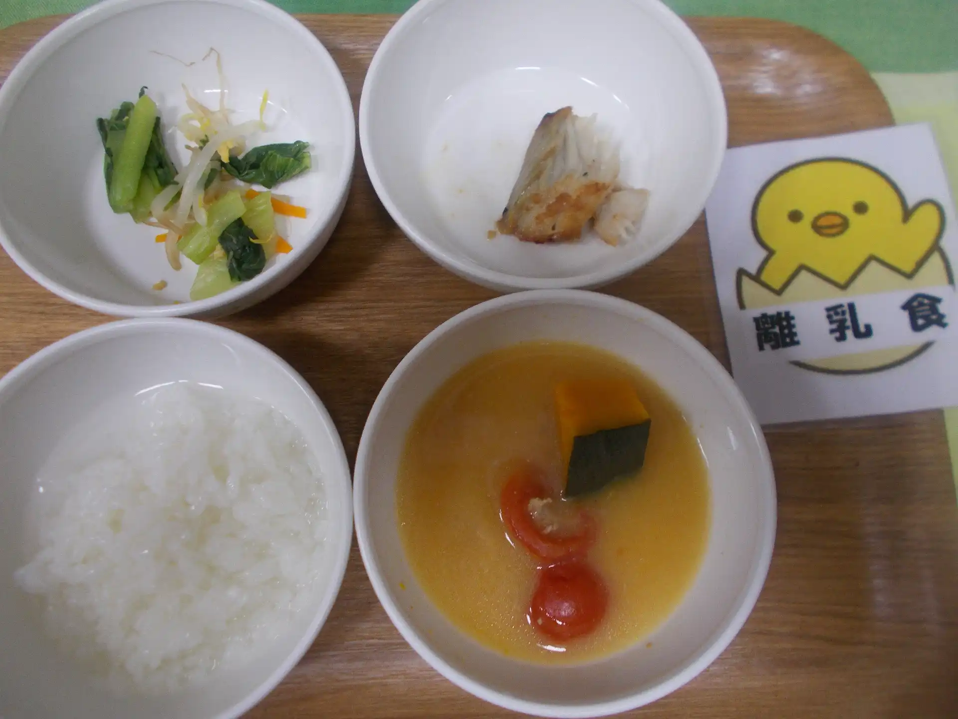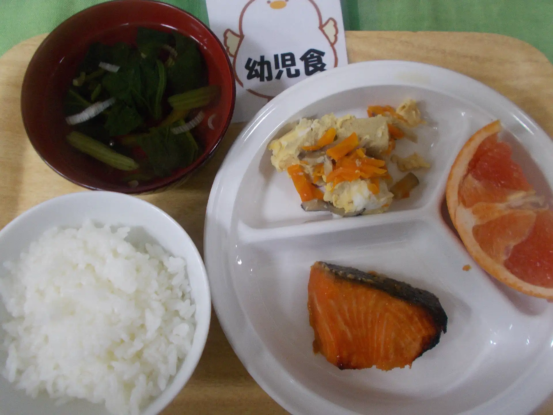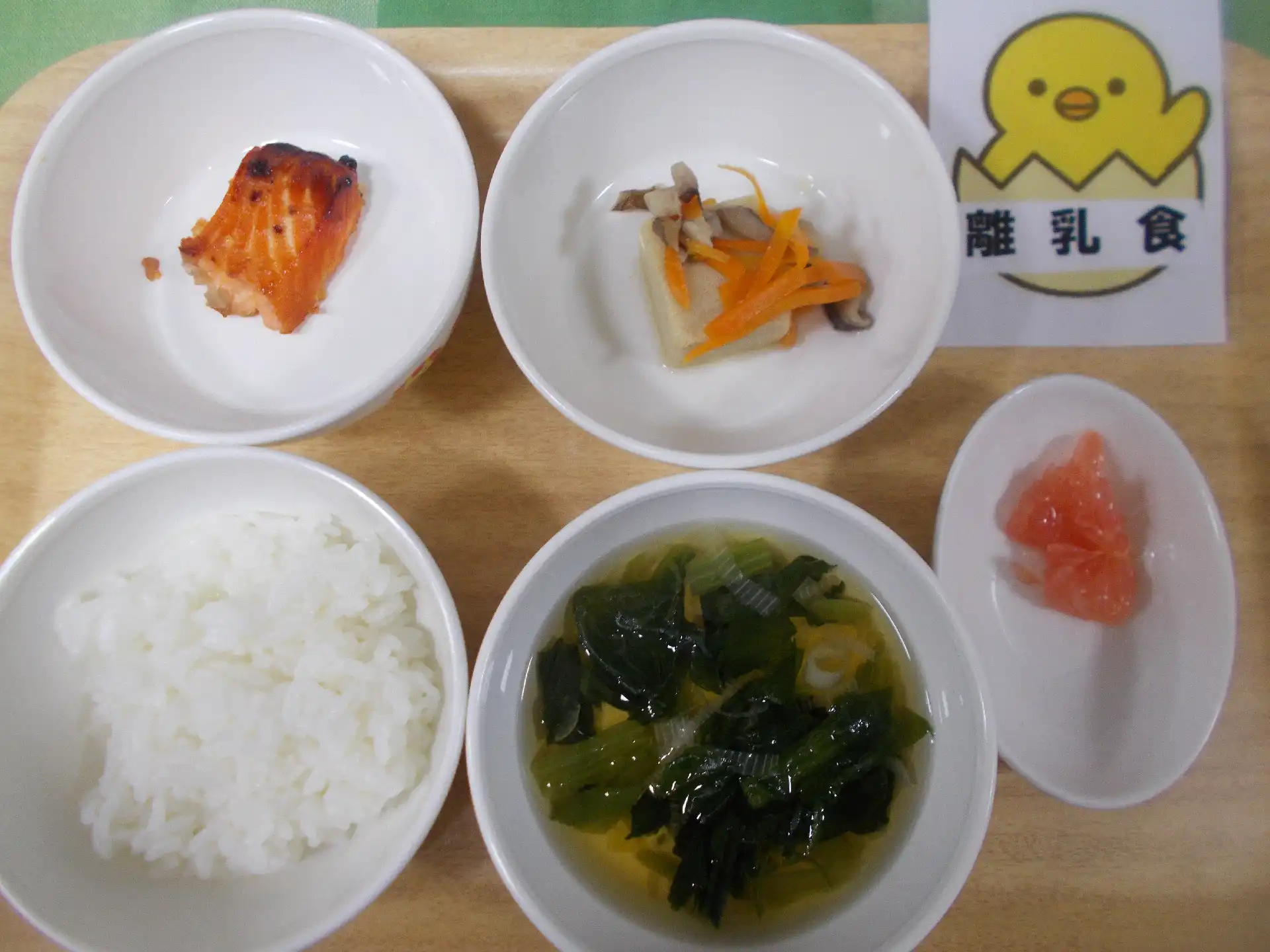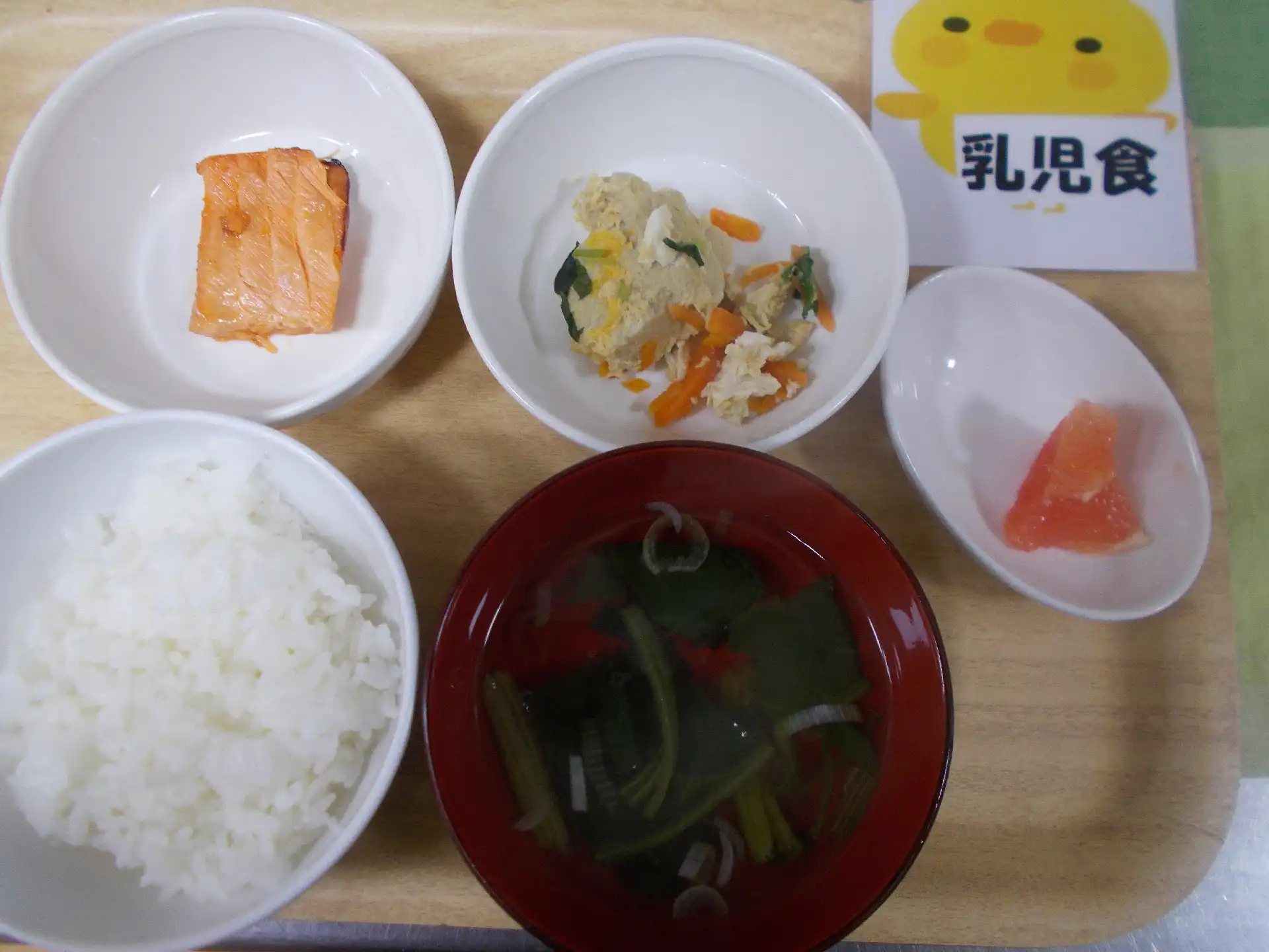 給食 | ご飯、鮭の西京焼き、凍り豆腐のふわふわ煮、すまし汁、グレープフルーツ 離乳:乳児と同じ | ||