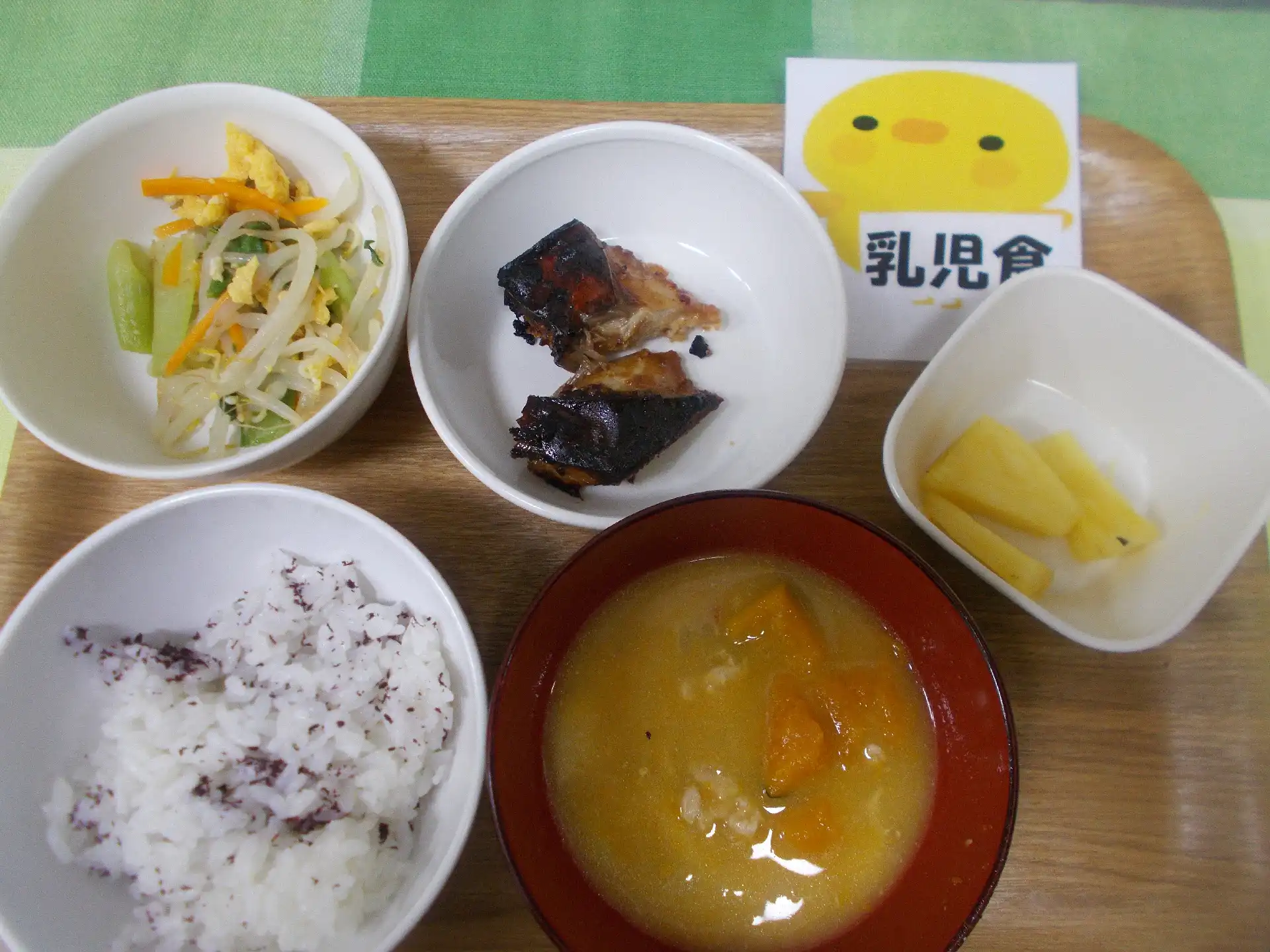 給食 | ふりかけご飯、サバの焼きおろし、炒り豆腐、豚汁、りんご 離乳完了食:乳児と同じ | ||