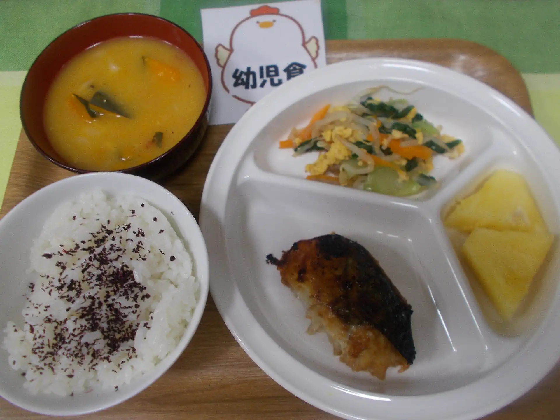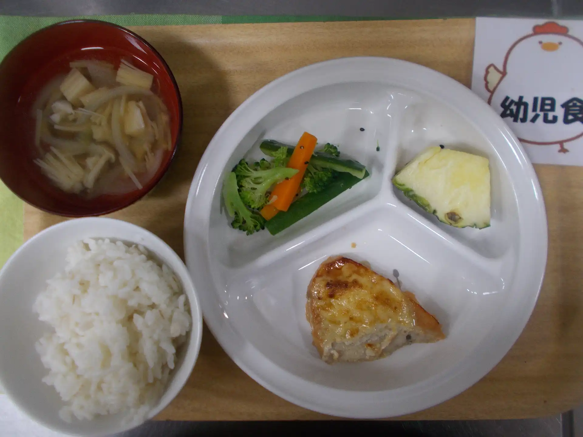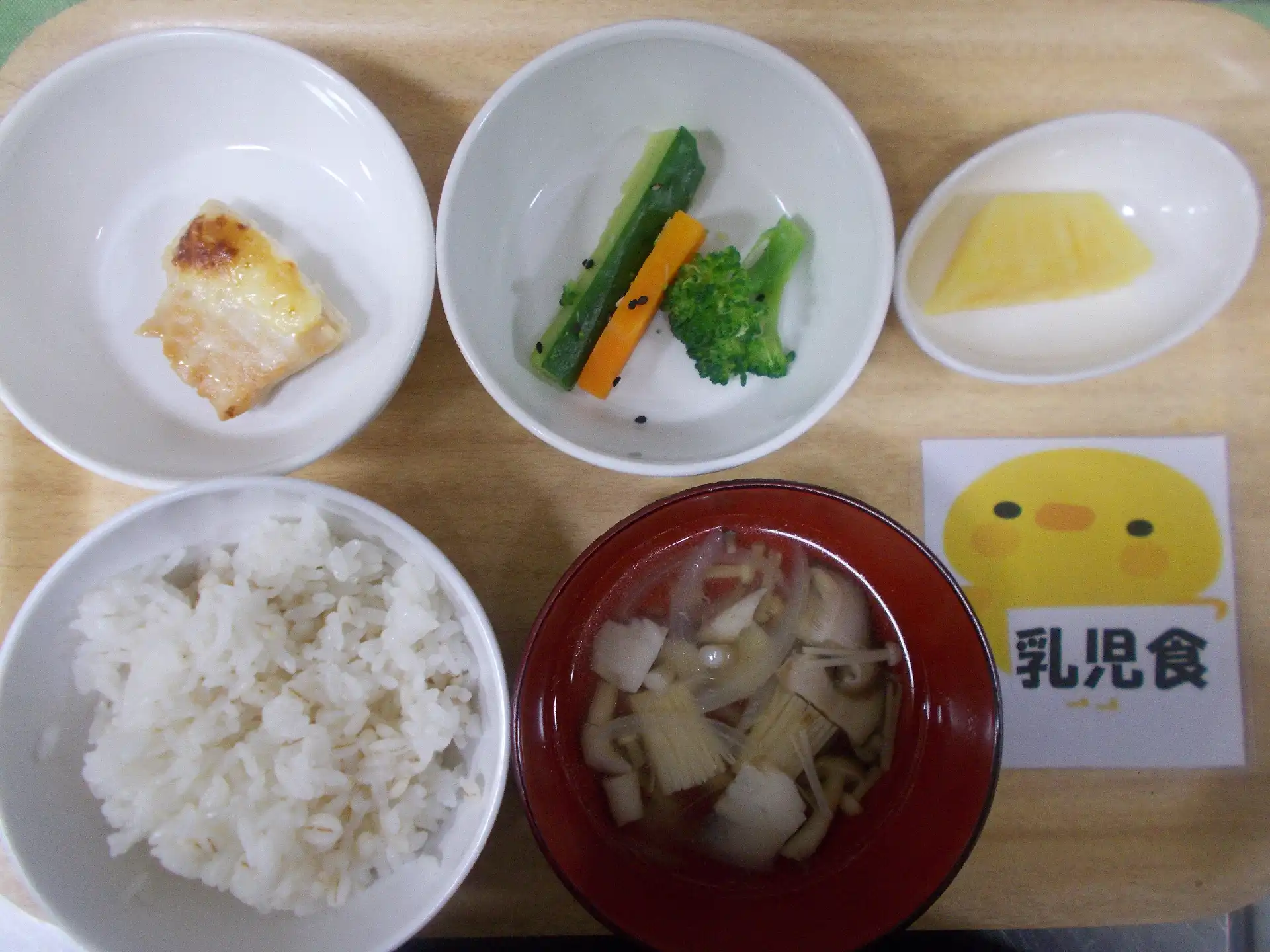 給食 | 麦入りご飯、かじきの味噌マヨ焼き、きゅうりの黒ごまサラダ、 きのこスープ、パイナップル 離乳食:軟飯、かじきの味噌マヨ焼き、スティック野菜、きのこスープ | ||