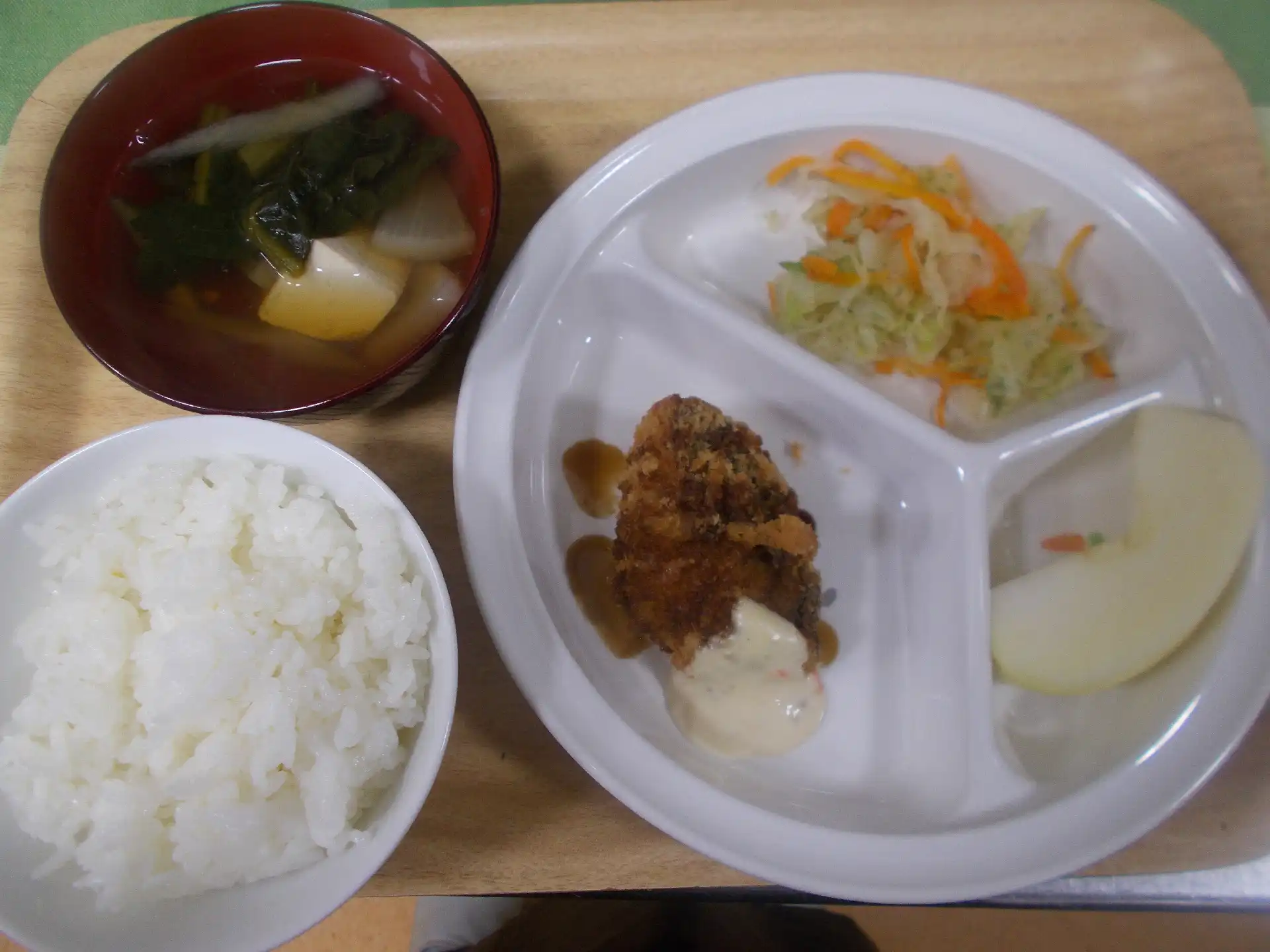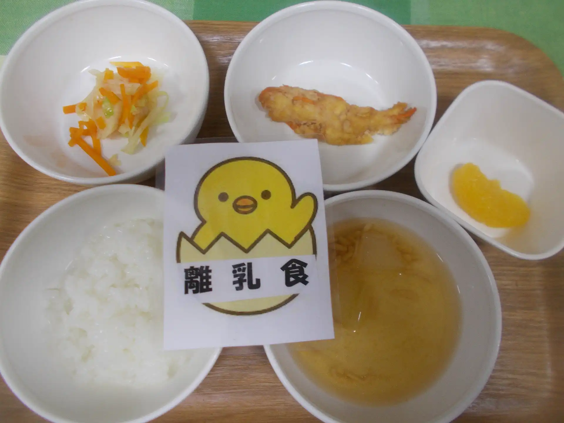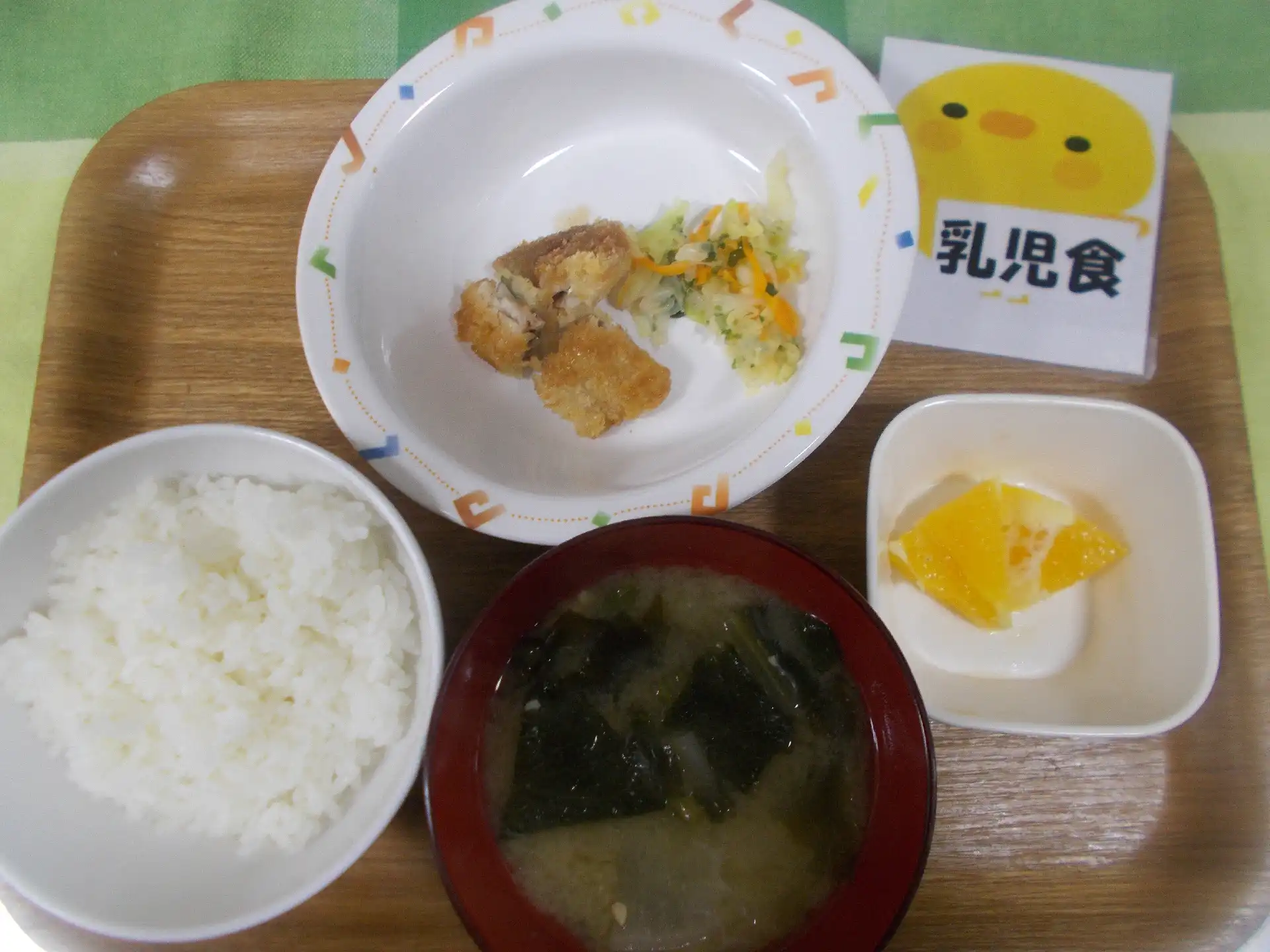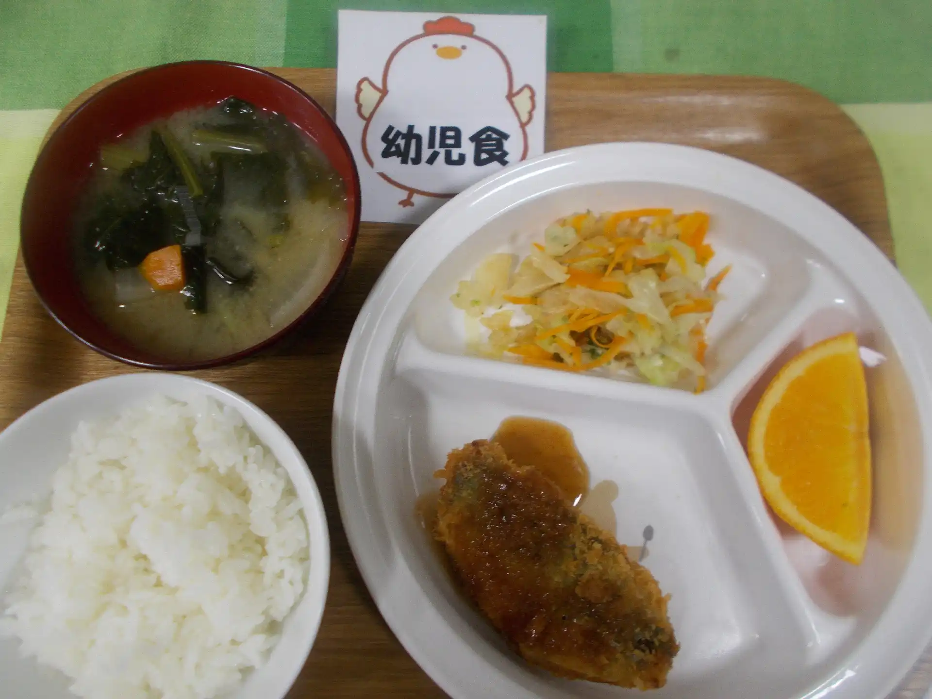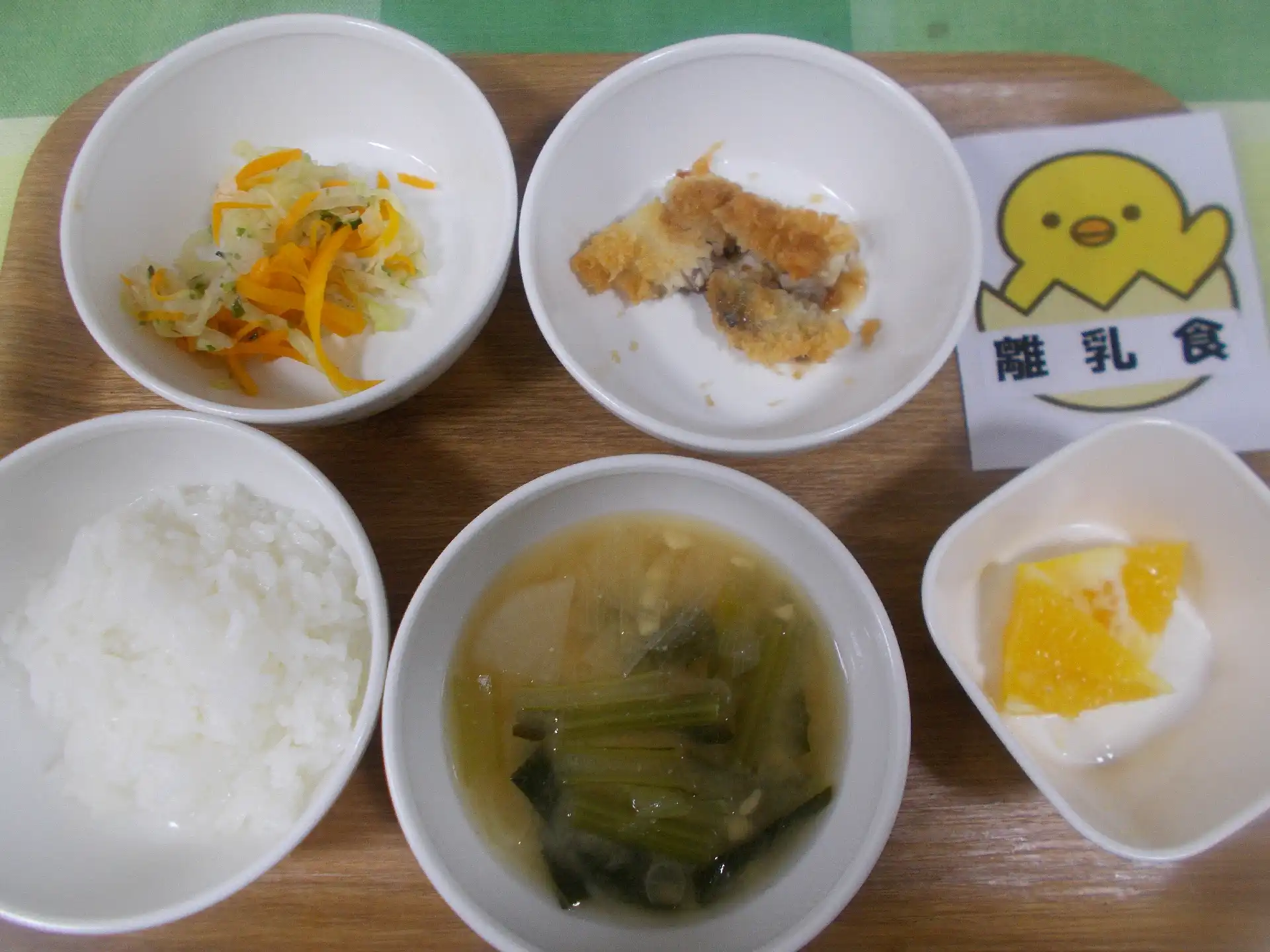 給食 | ご飯、アジフライ、キャベツの磯和え、野菜と納豆の味噌汁、オレンジ 離乳完了食:乳児と同じ | ||