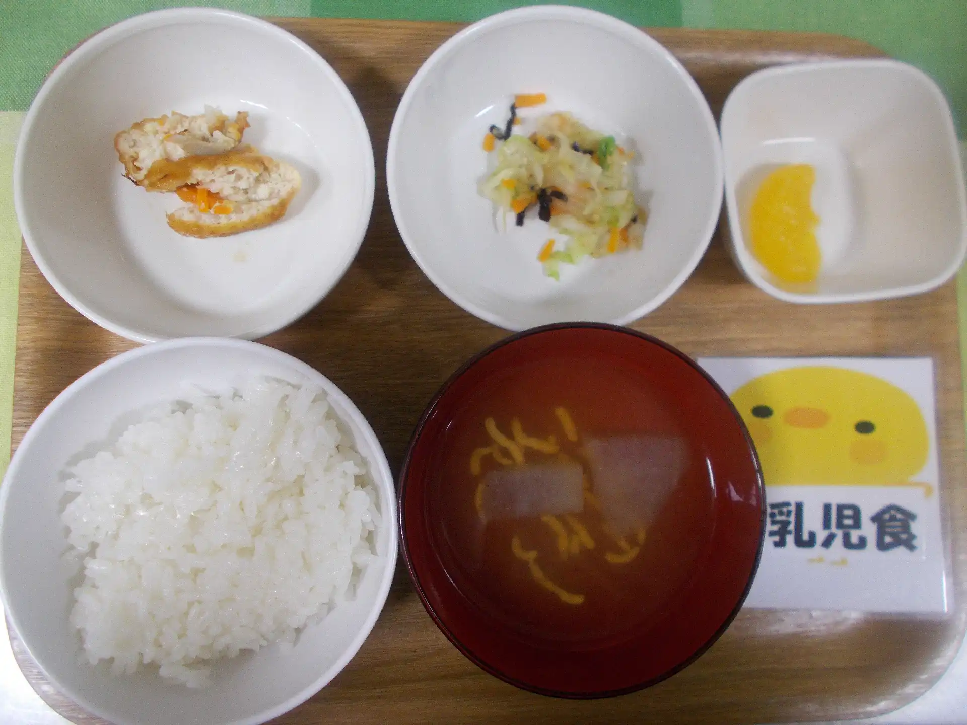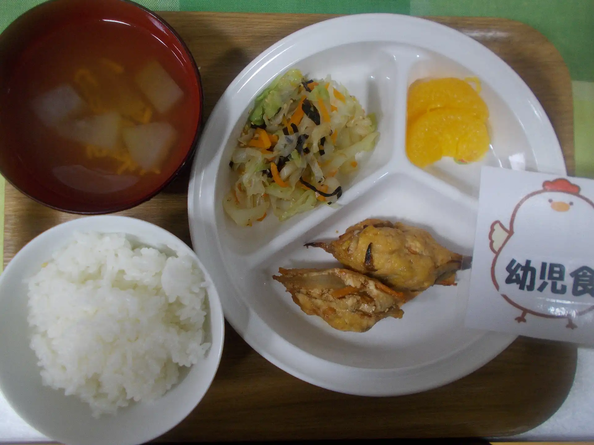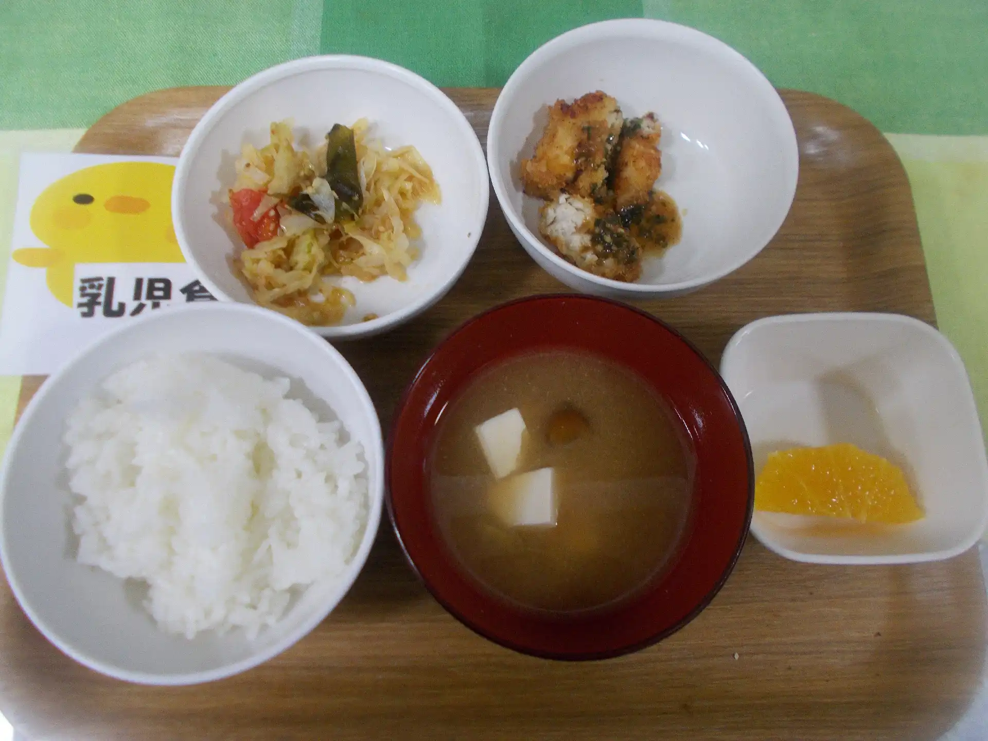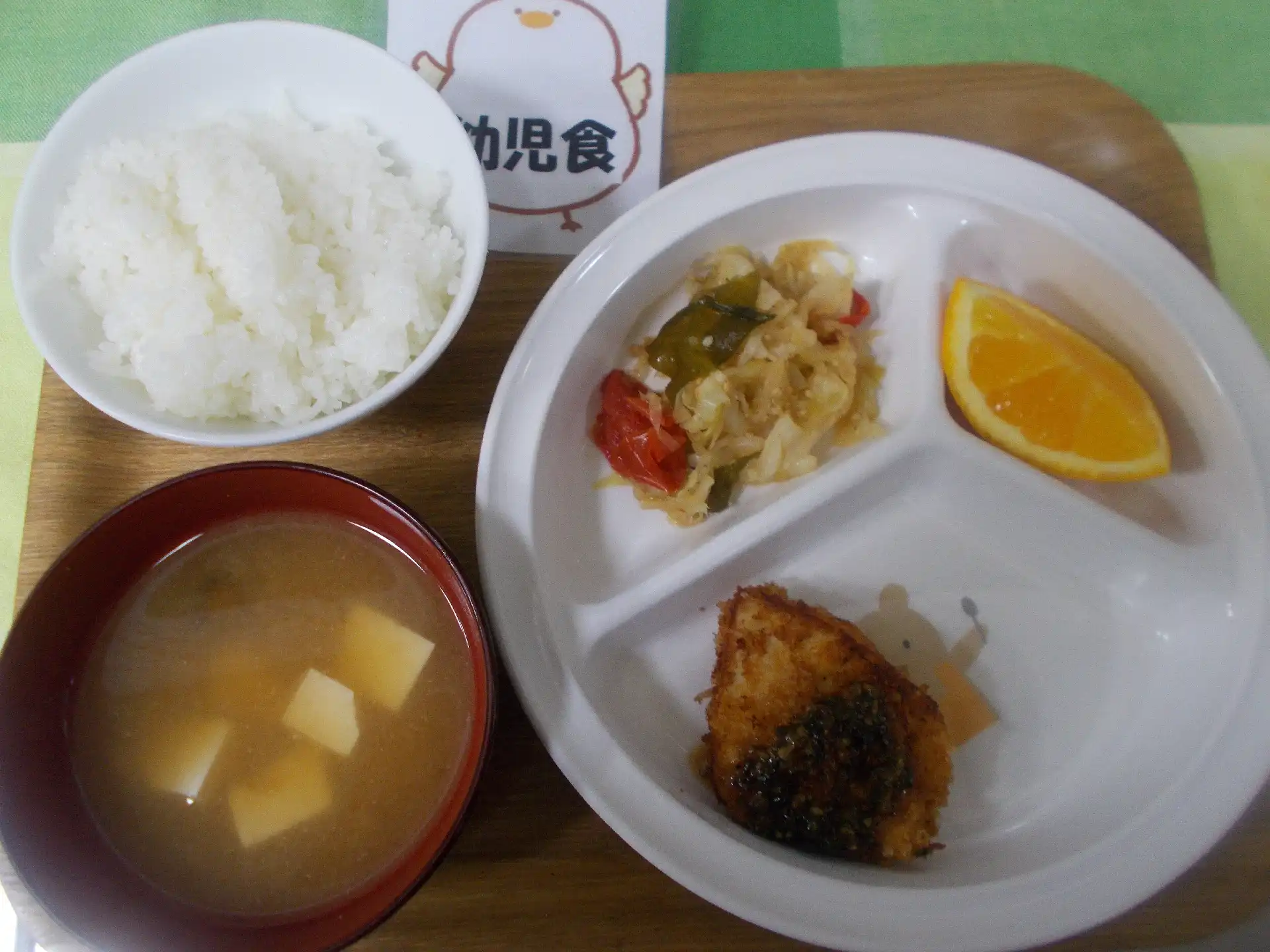 給食 | しそふりかけご飯、かじきの和風フライ、キャベツとじゃこの酢和え、豚汁、 みかん 離乳食(完了):乳児と同じ |