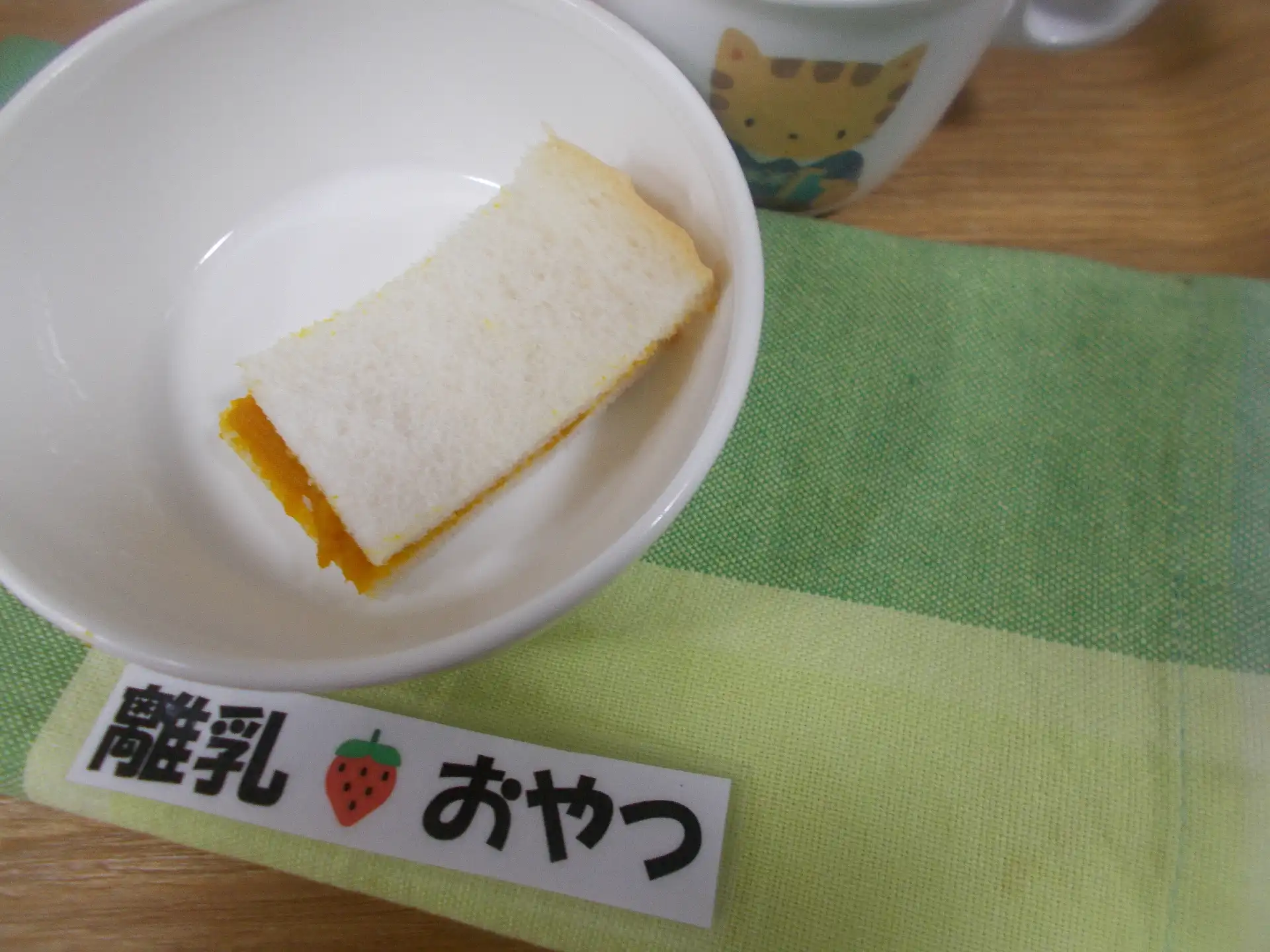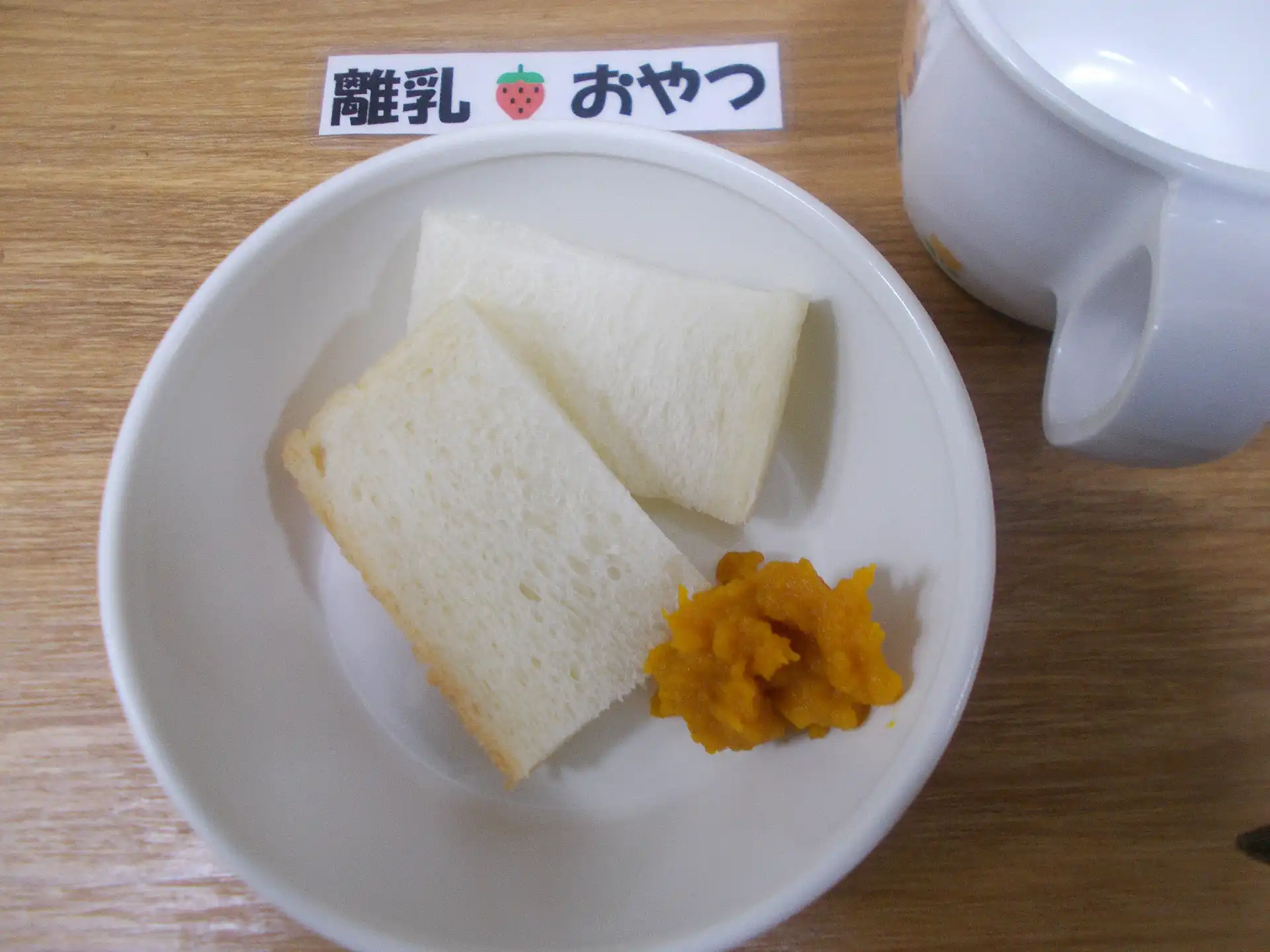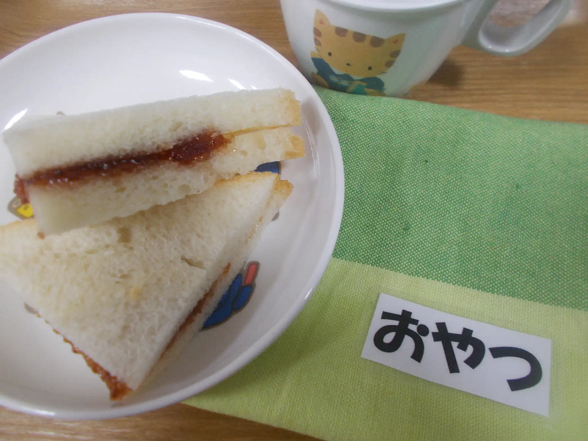おやつ | ジャムサンドイッチ、牛乳 離乳(完了):パン&お芋チーズ、牛乳 |