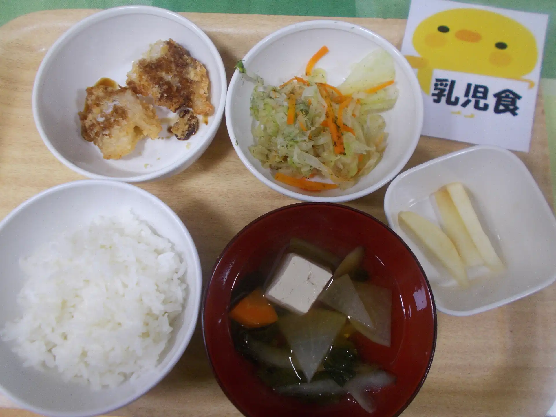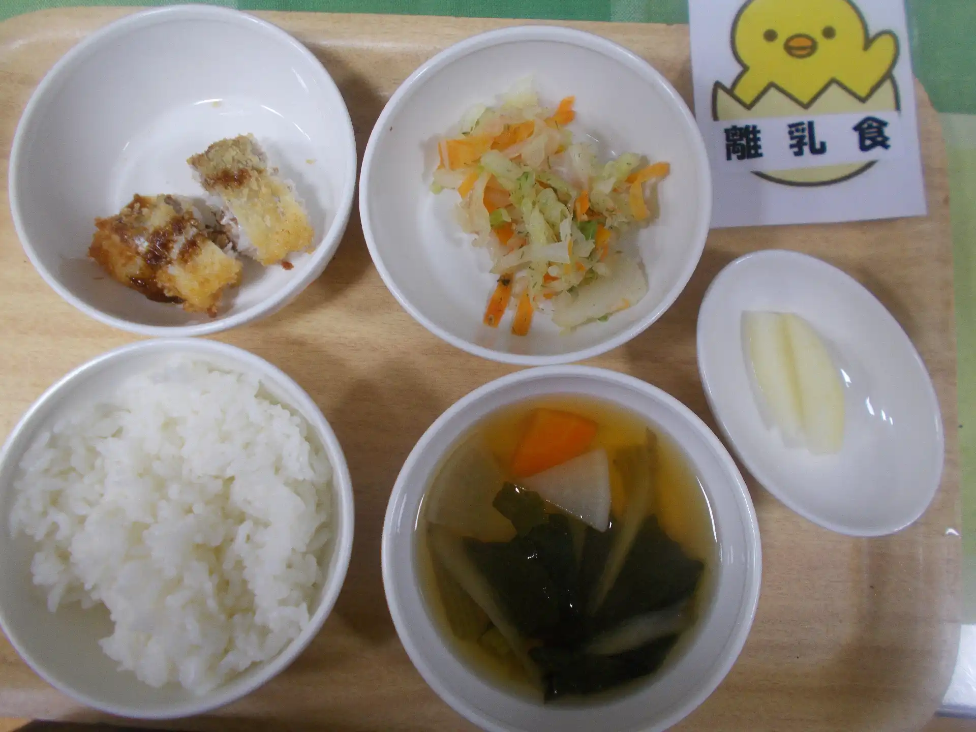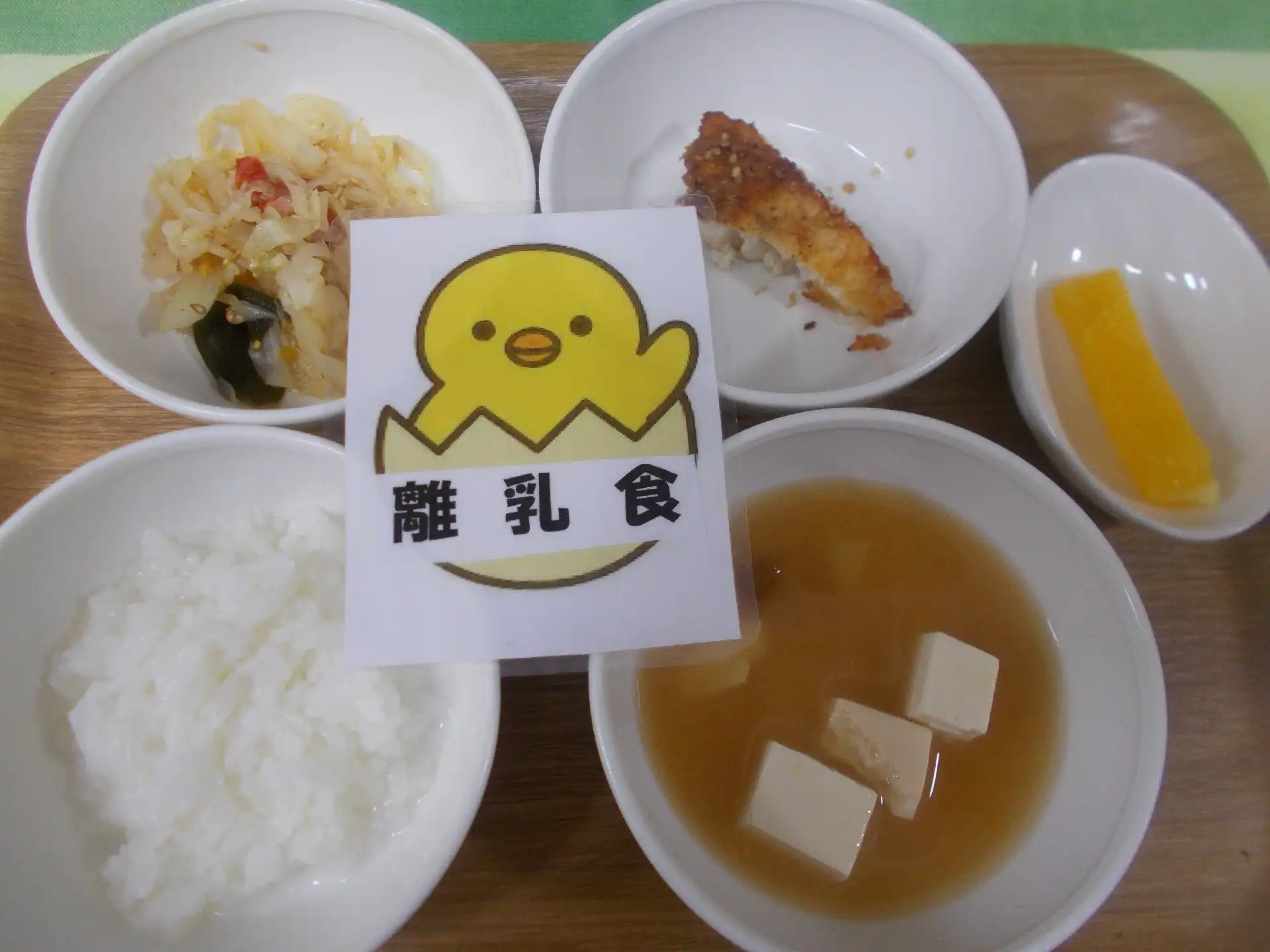 給食 | ご飯、白身魚のフライ、キャベツの磯和え、五目汁、りんご 離乳:乳児と同じ | ||