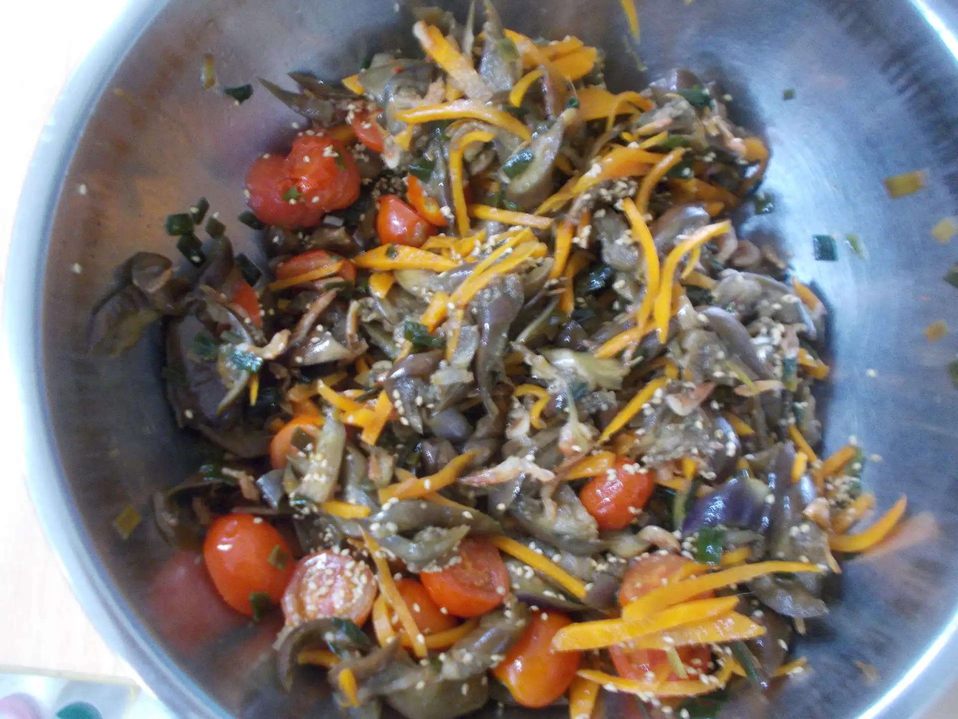 説明 | コールスローサラダには、緑のキャベツと紫のキャベツが入りました。 紫のキャベツの色はアントシアニンという色素です。 生でも加熱しても食べられます。ビタミンC、リン、ビタミンK、カロテンが 豊富に含まれています。園では、酢を少量入れて茹でました。 とってもきれいなピンク色のサラダになりました。 |