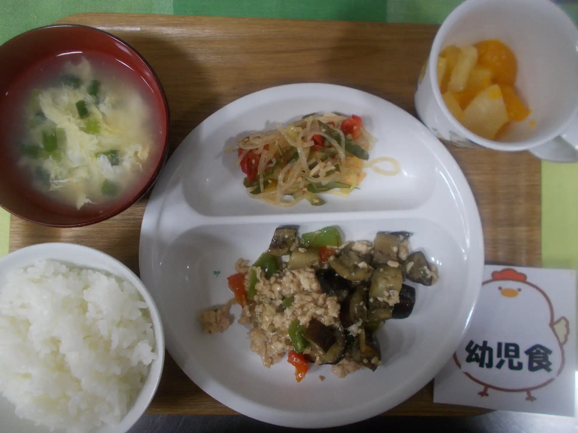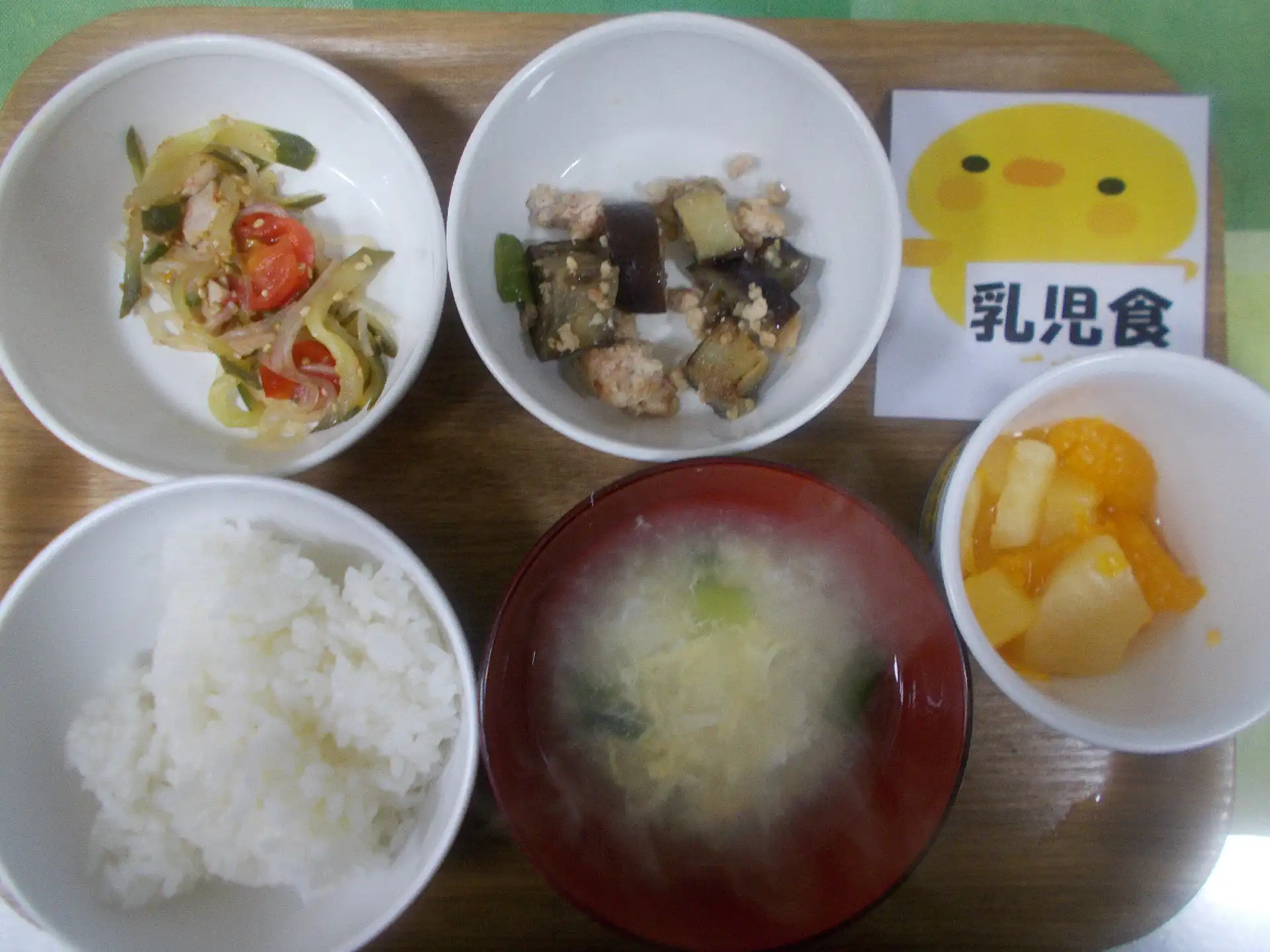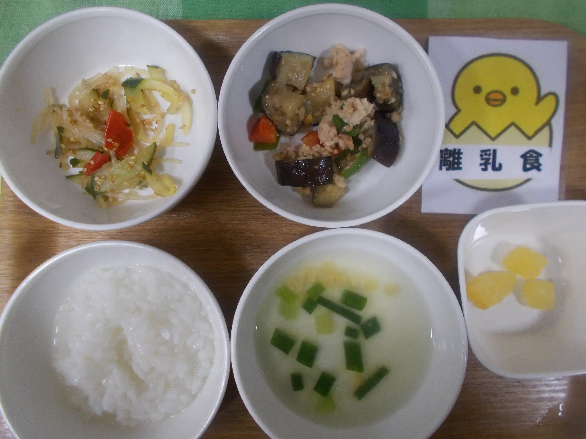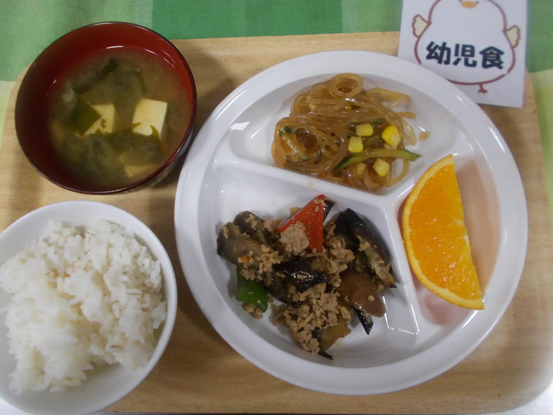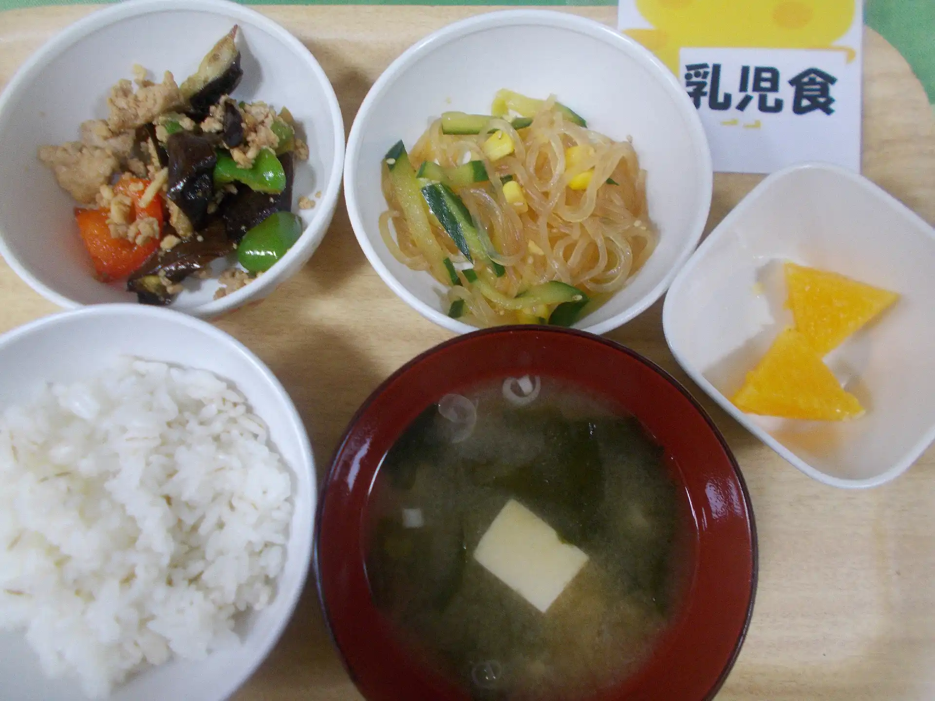 給食 | ご飯、鶏ひき肉となすのみそ炒め、春雨サラダ、コーンスープ、フルーツポンチ ※一部変更しました。 離乳:乳児と同じ(白飯軟飯) | ||