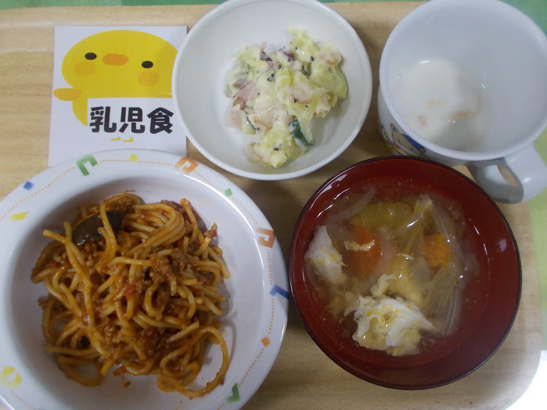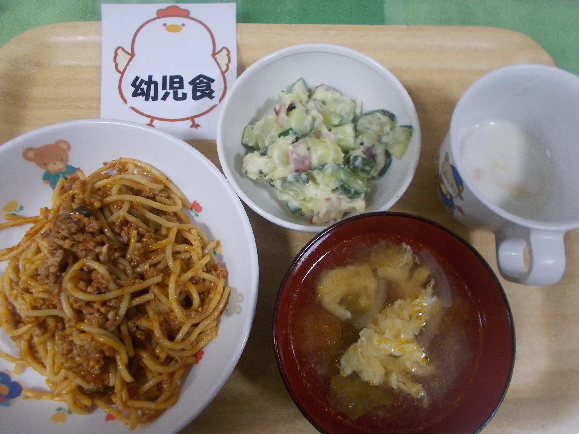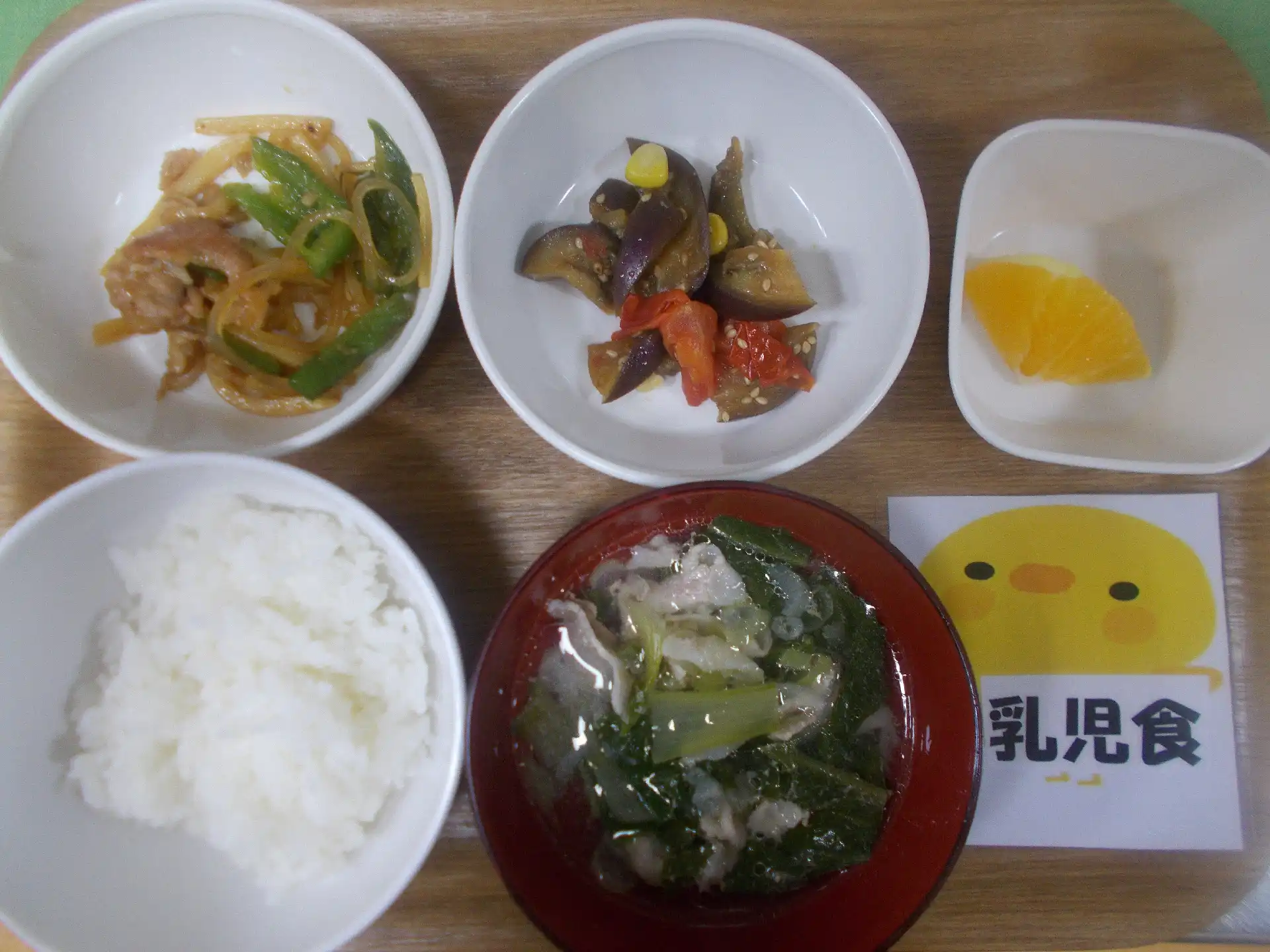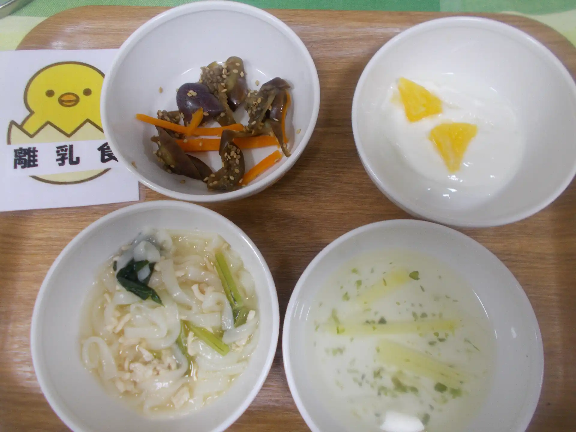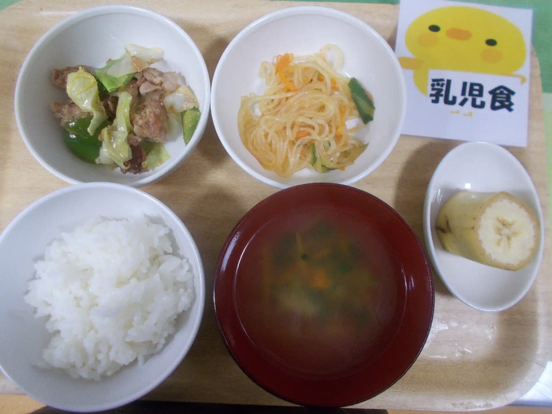 給食 | ご飯、鶏ひき肉となすのみそ炒め、春雨サラダ、コーンスープ、フルーツポンチ ※一部変更しました。 離乳:乳児と同じ(白飯軟飯) | ||