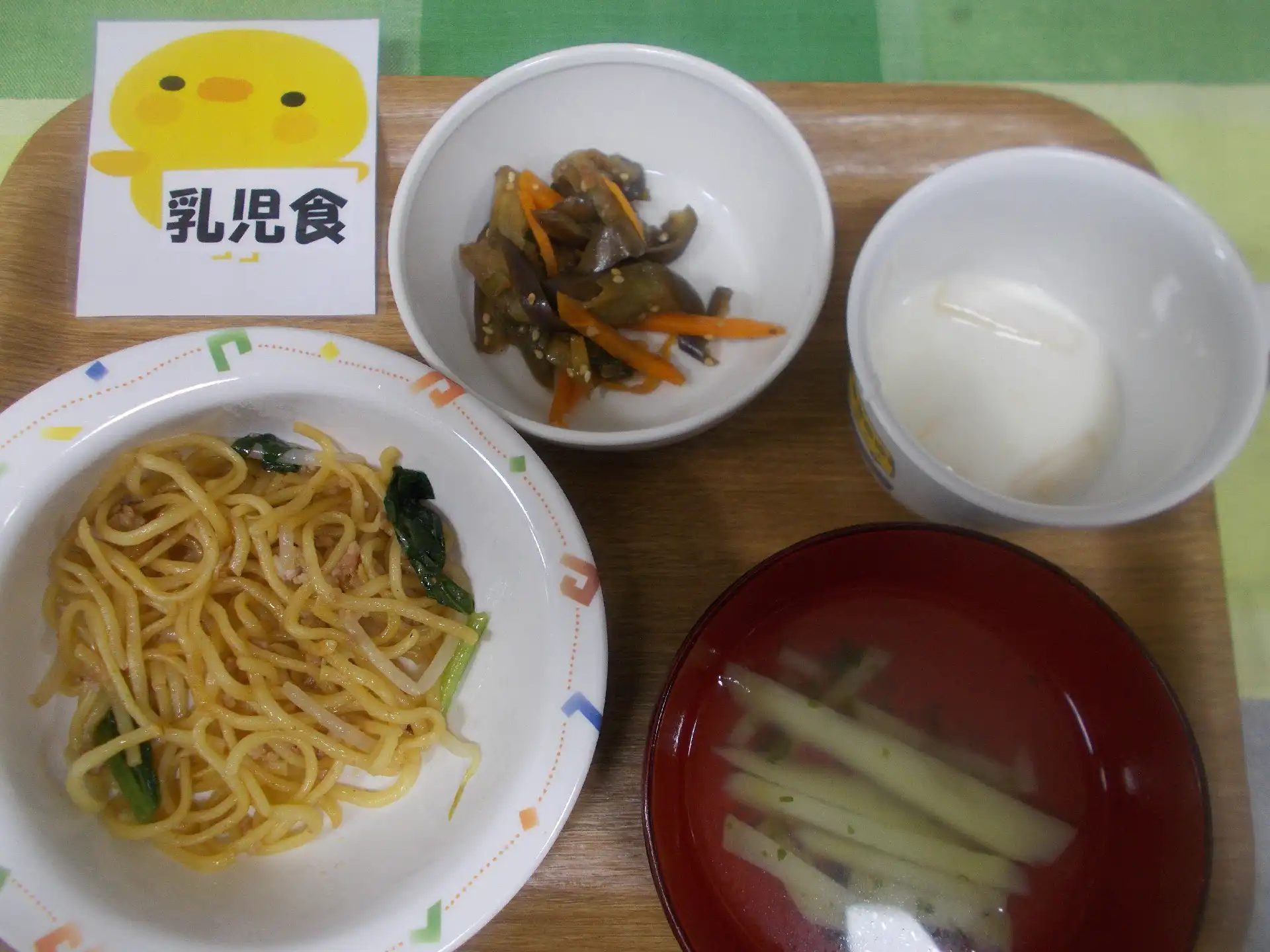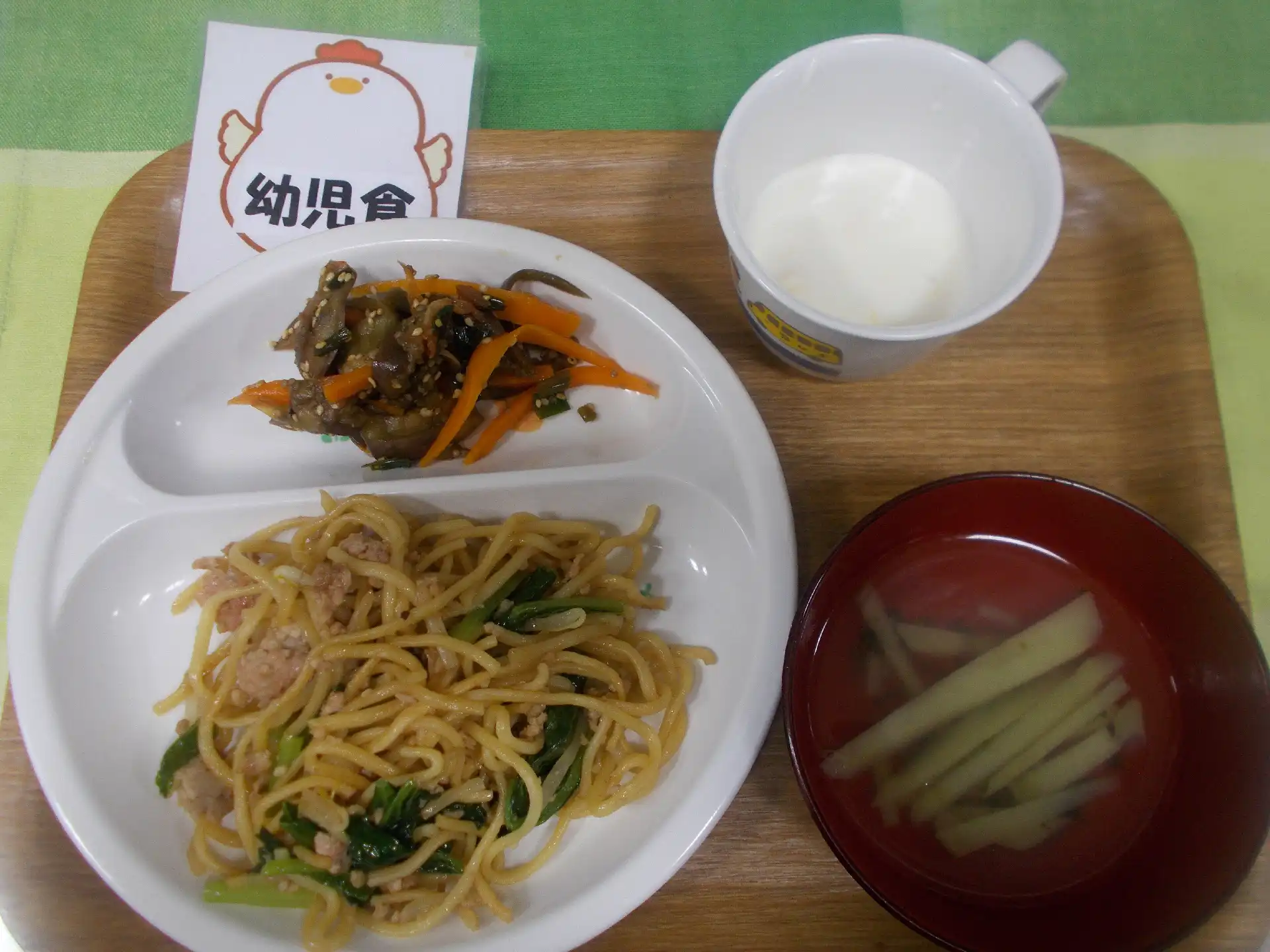 給食 | ハオユー焼きそば、なすの酢油和え、大根中華スープ、杏仁豆腐 離乳食(完了):ソース焼きそば、なすおかか和え、大根スープ、バナナ |