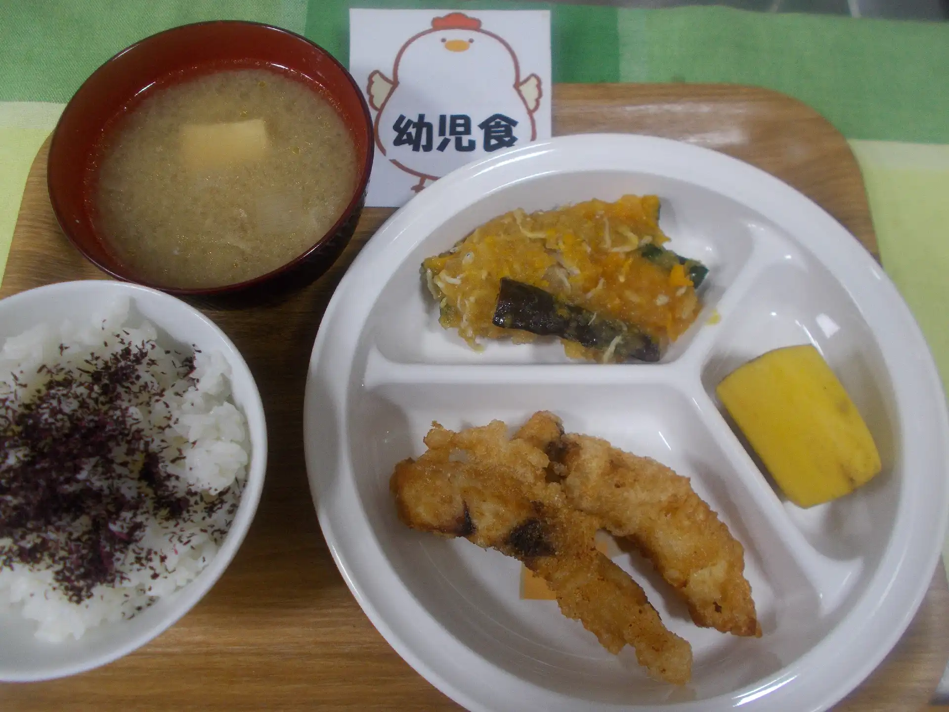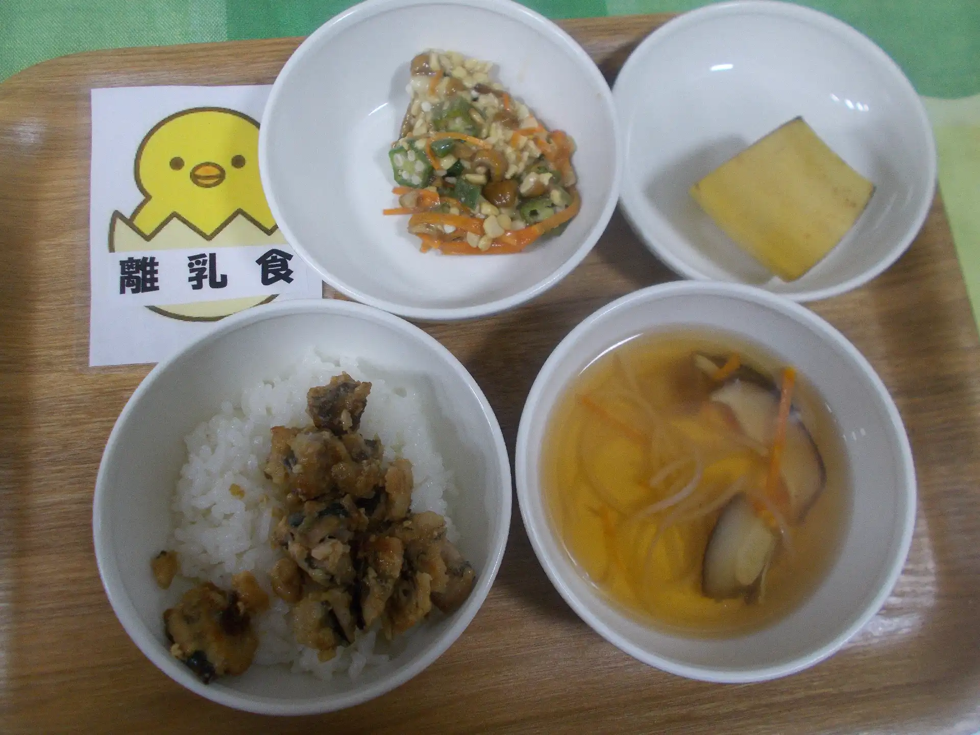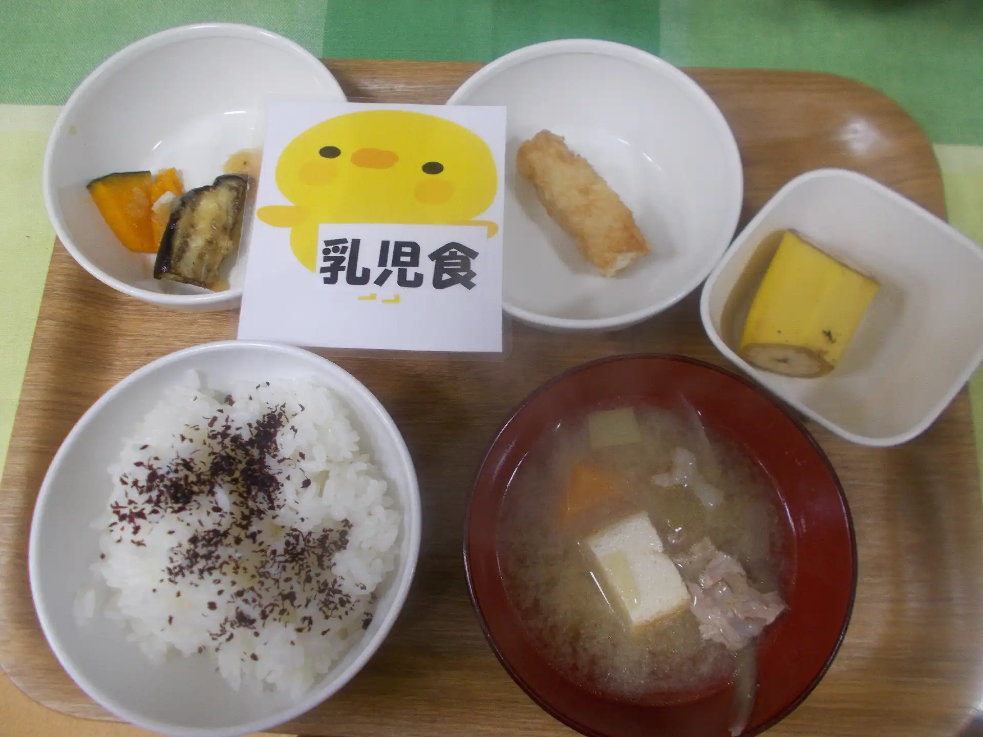給食 | しそふりかけご飯、かじきの竜田揚げ、なすとかぼちゃのじゃこおろし、豚汁、バナナ 離乳:乳児と同じ(白飯軟飯) | ||