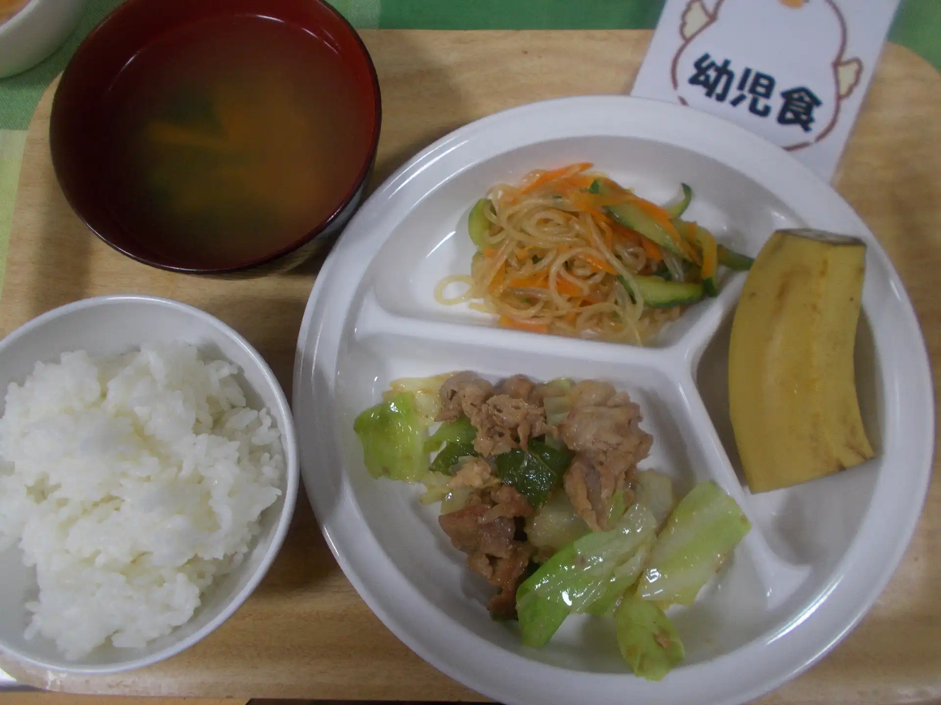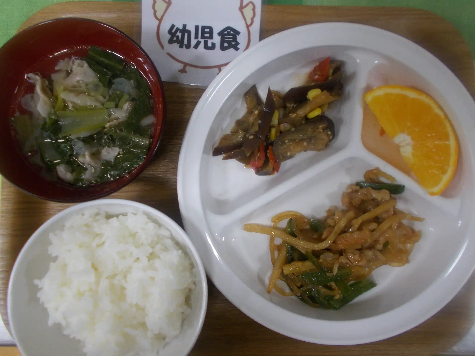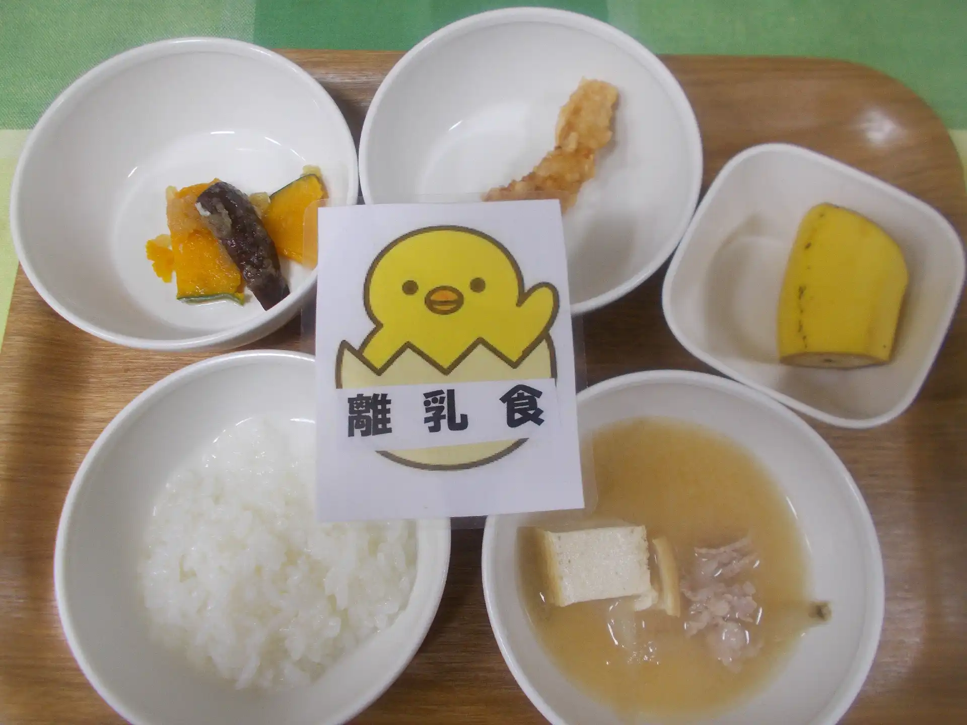 給食 | しそふりかけご飯、かじきの竜田揚げ、なすとかぼちゃのじゃこおろし、豚汁、バナナ 離乳:乳児と同じ(白飯軟飯) | ||