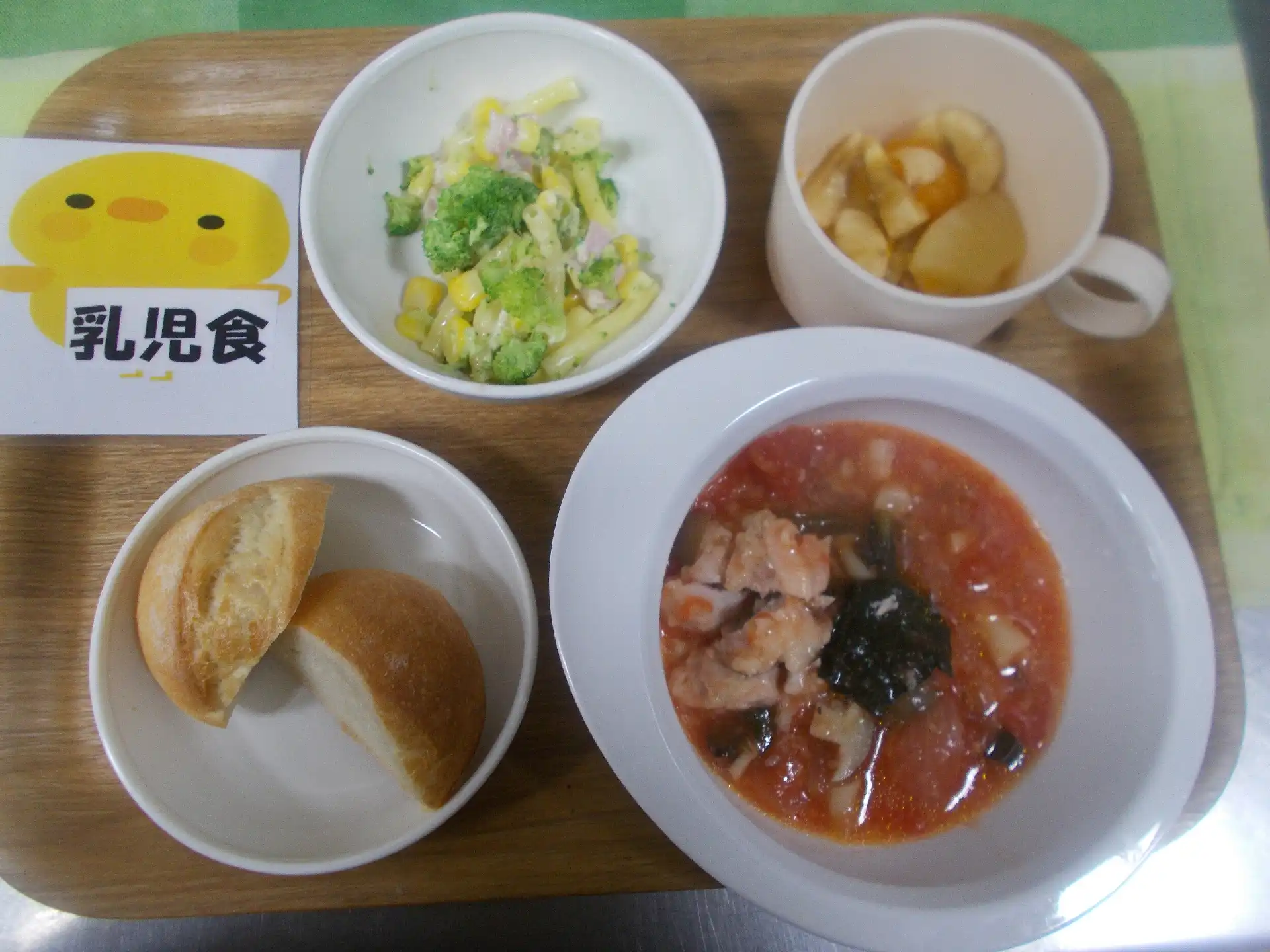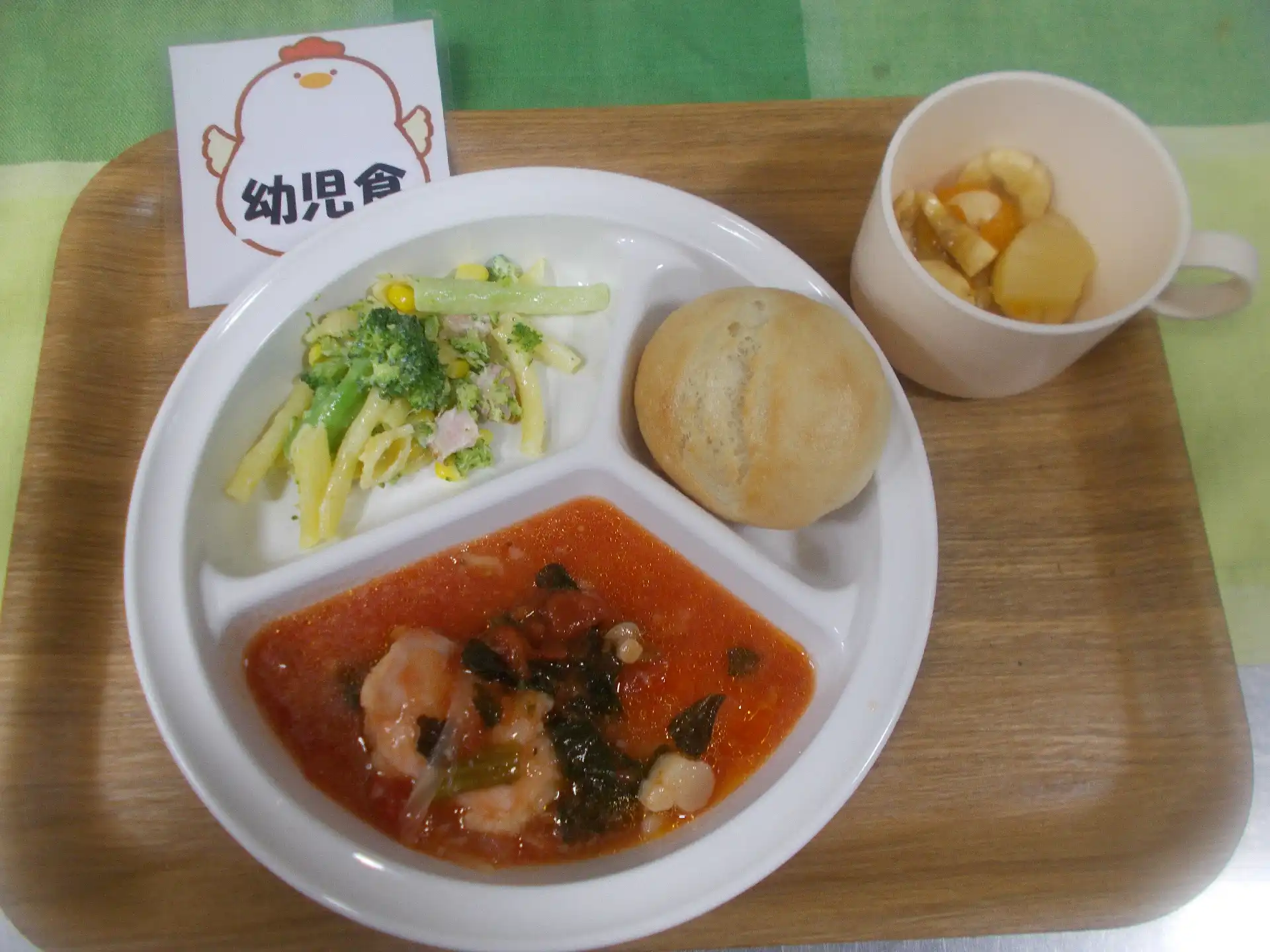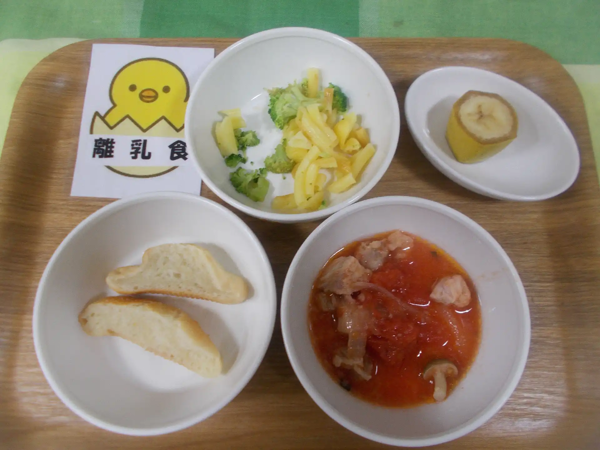 給食 | 丸パン、鶏肉のトマト煮込み、マカロニサラダ、フルーツポンチ 離乳:乳児と同じ、バナナ | ||
