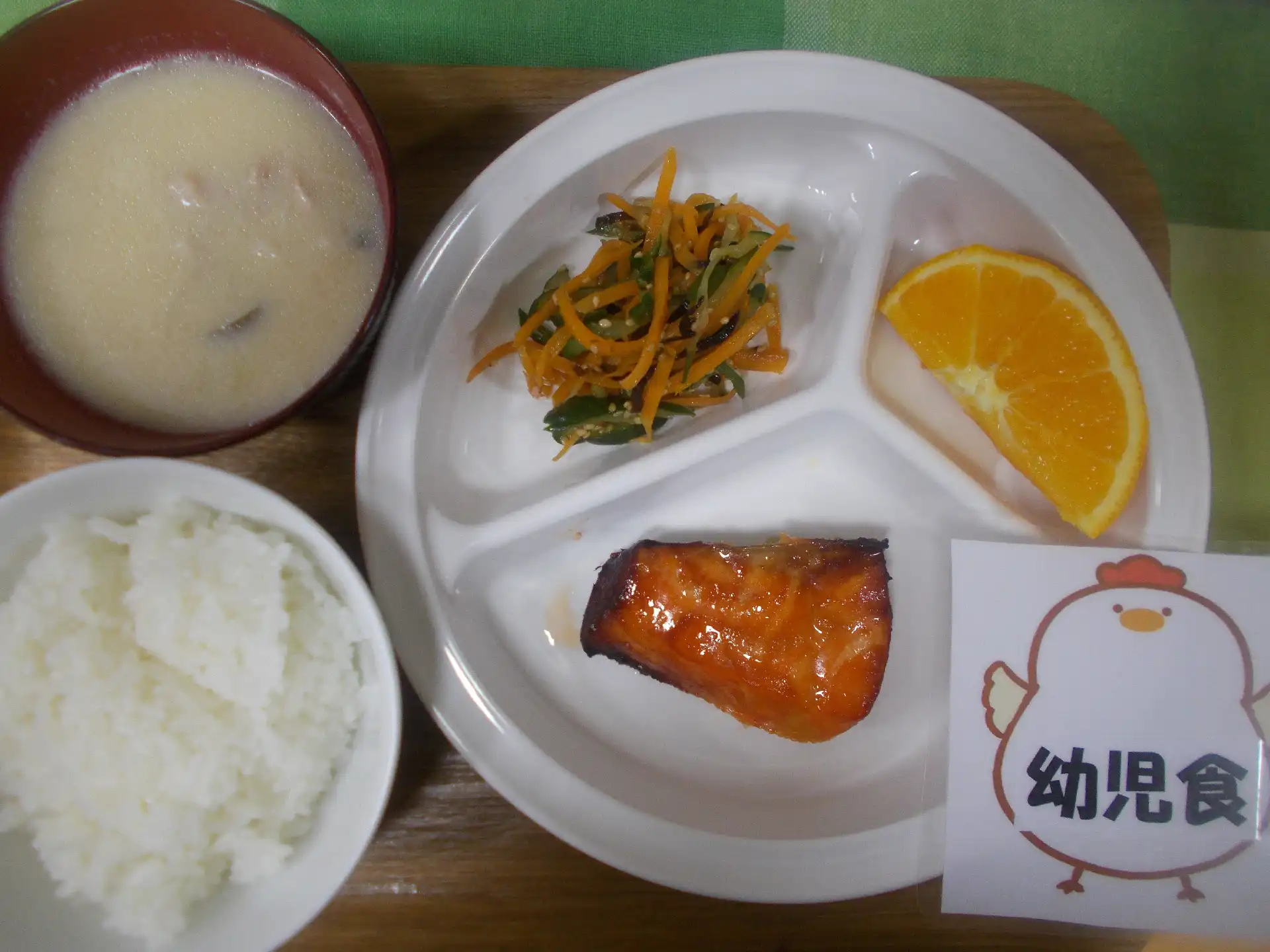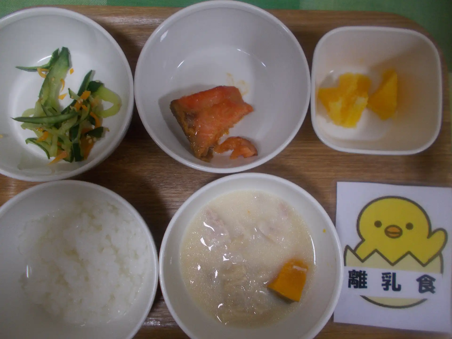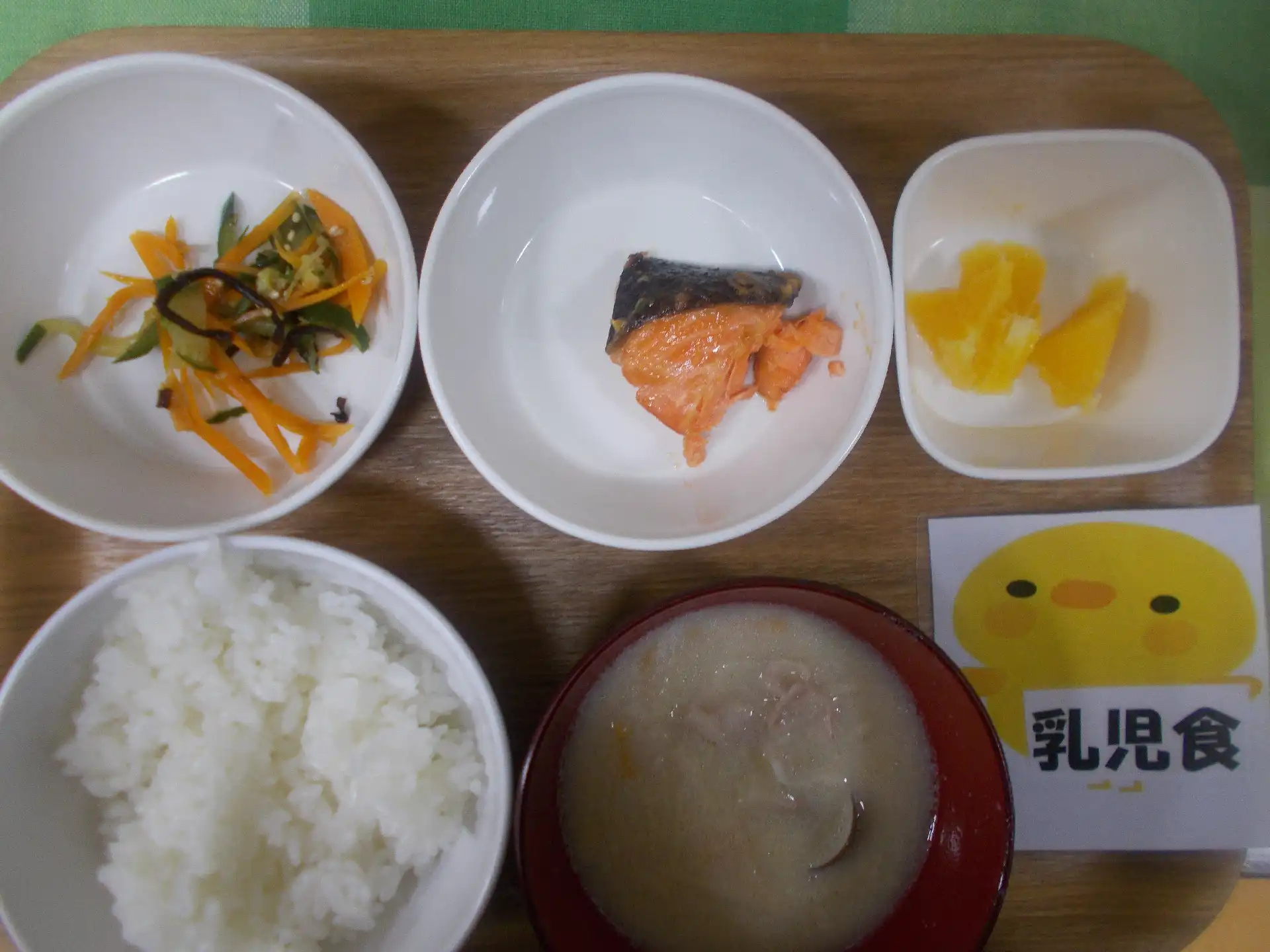 給食 | ご飯、鮭の西京焼き、きゅうりの昆布和え、豆乳みそ汁、オレンジ 離乳:乳児と同じ | ||