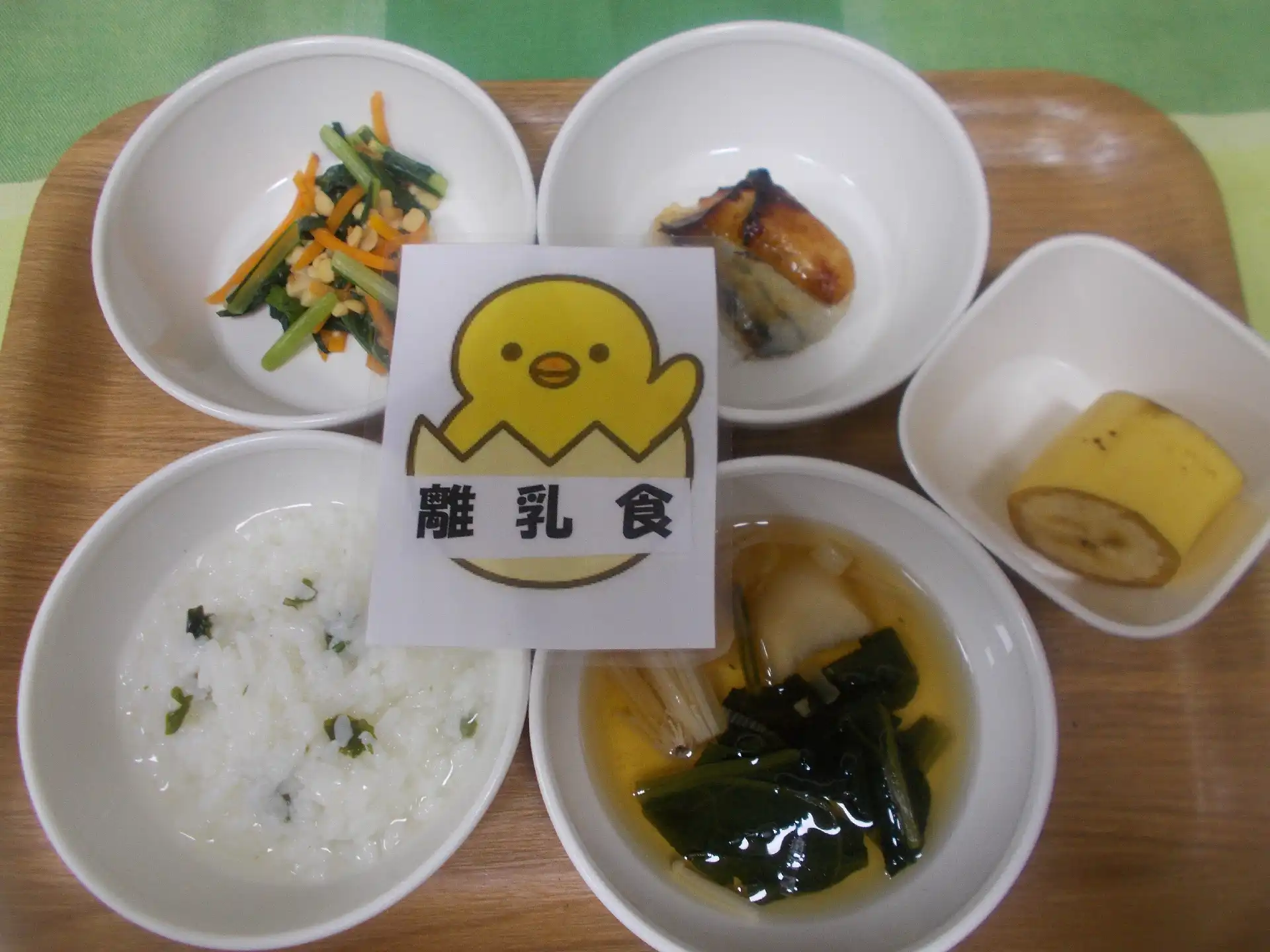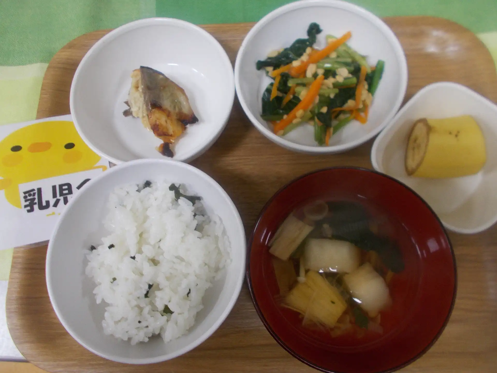 給食 | わかめご飯、さばの塩こうじ焼き、小松菜納豆和え、すまし汁、バナナ 離乳:乳児と同じ | ||