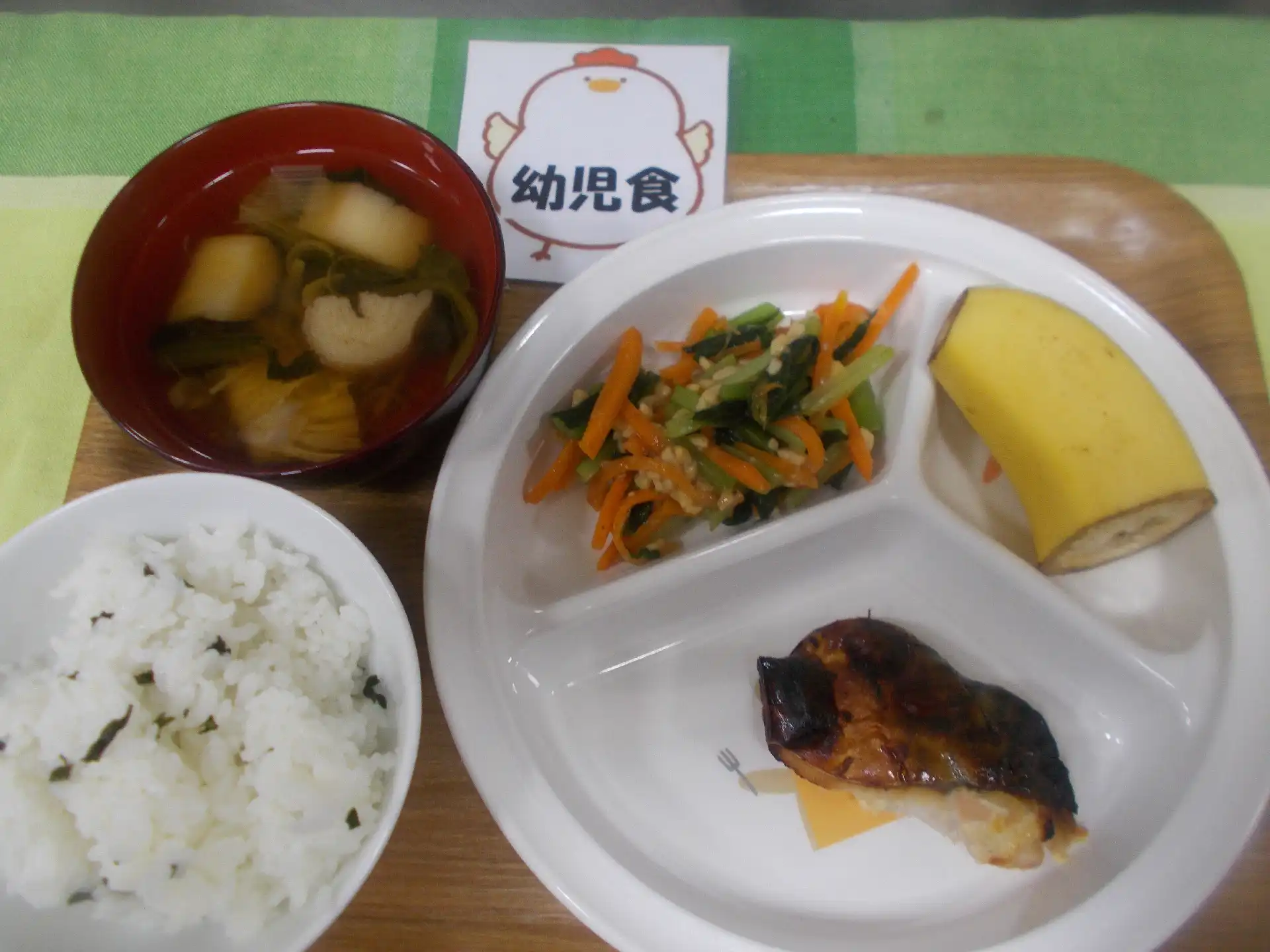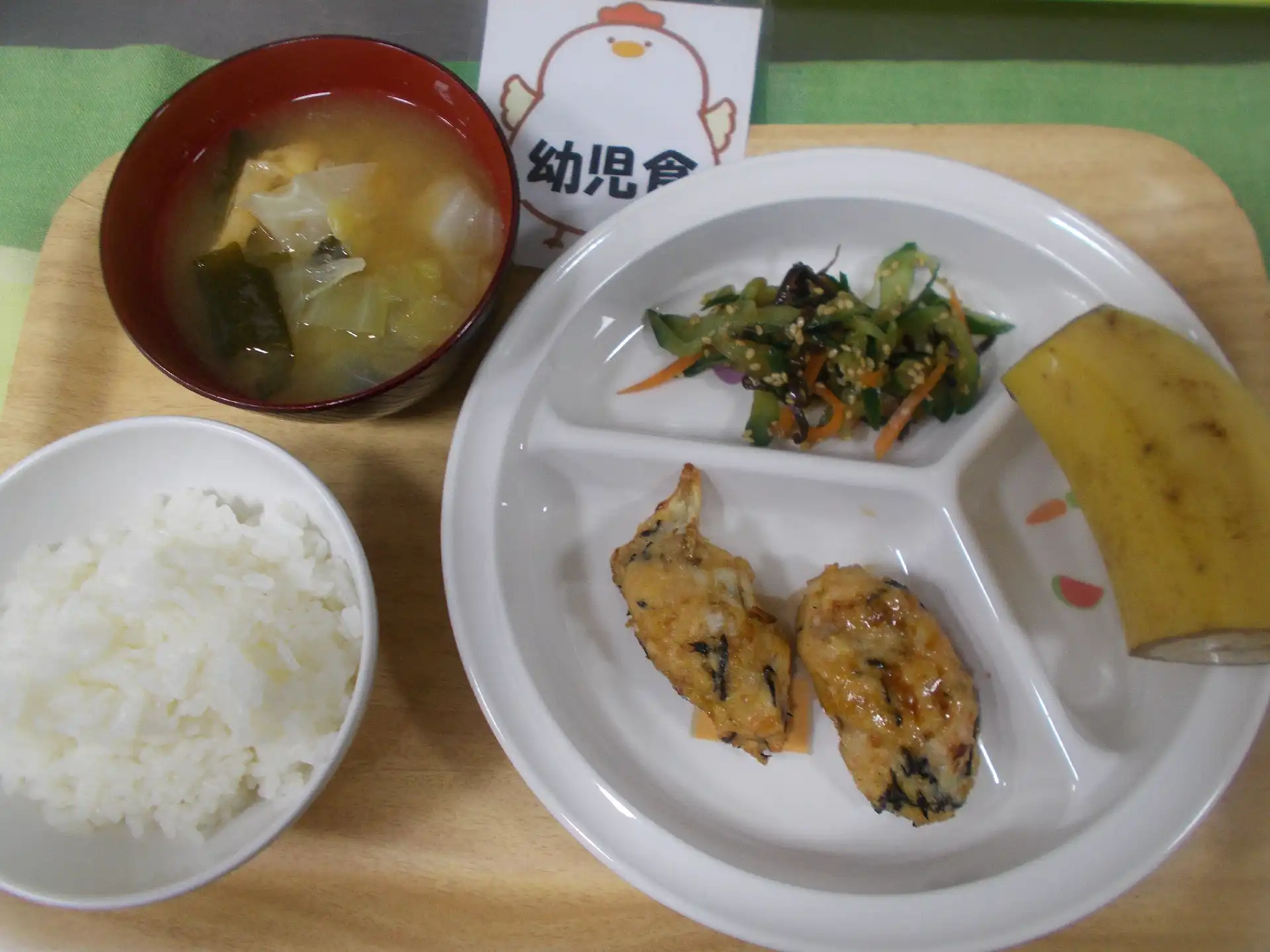給食 | ふりかけご飯、鶏肉のごまみそ焼き、大根と昆布の酢の物、すまし汁、バナナ 離乳食(完了):ご飯、鶏肉のごまみそ焼き、大根のおかか和え、すまし汁、バナナ |