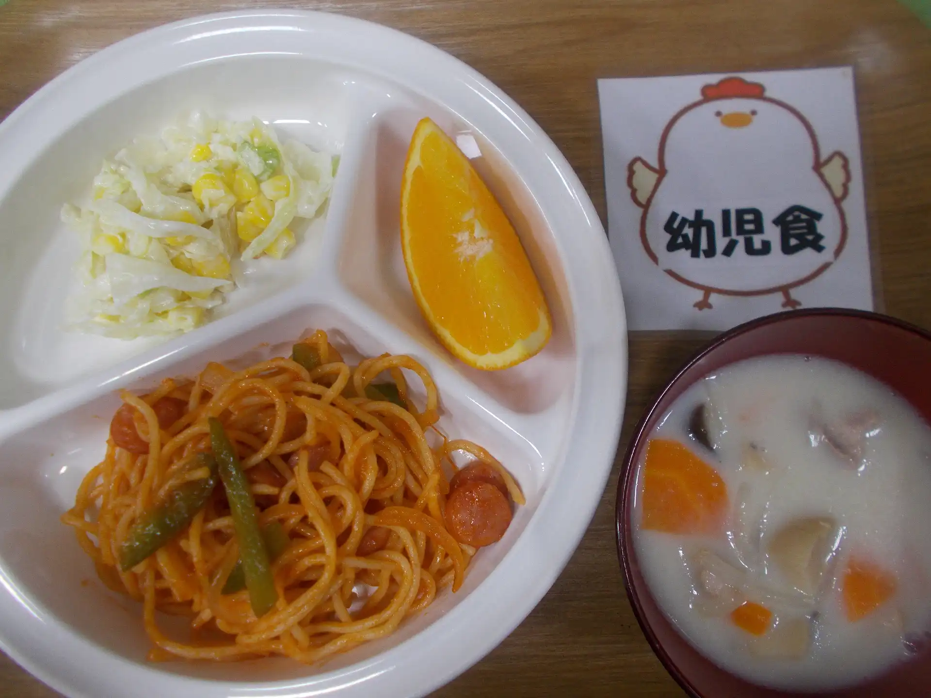 給食 | ナポリタン、コーンサラダ、秋野菜の豆乳スープ、オレンジ | ||