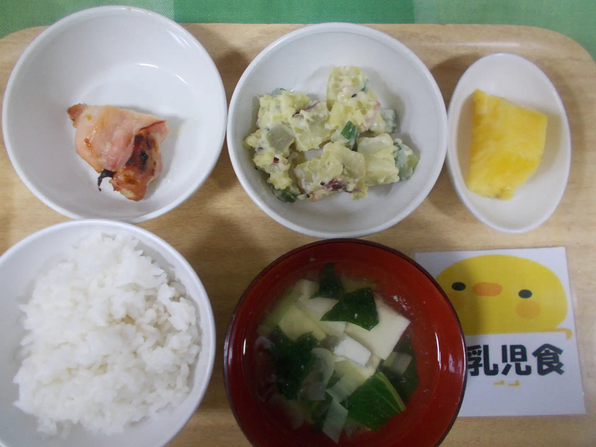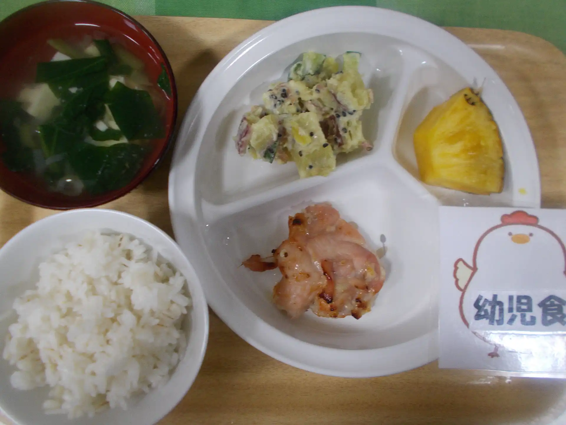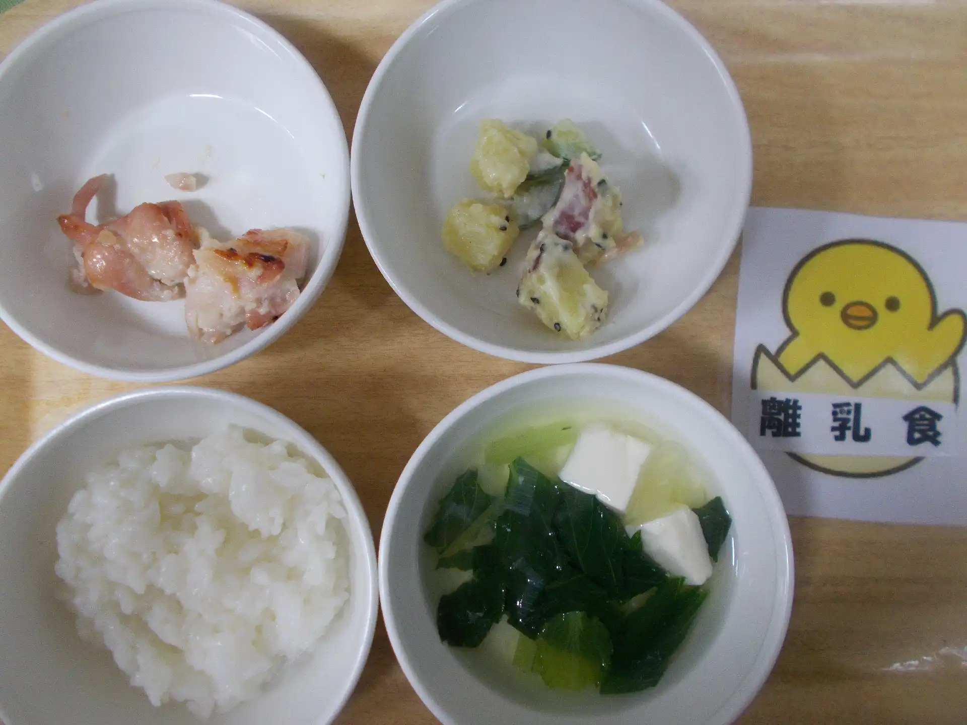 給食 | 麦入りご飯、鶏肉の塩こうじ焼き、さつま芋サラダ、豆腐スープ、 パイナップル 離乳:軟飯、鶏肉の塩こうじ焼き、さつま芋サラダ、豆腐スープ | ||
