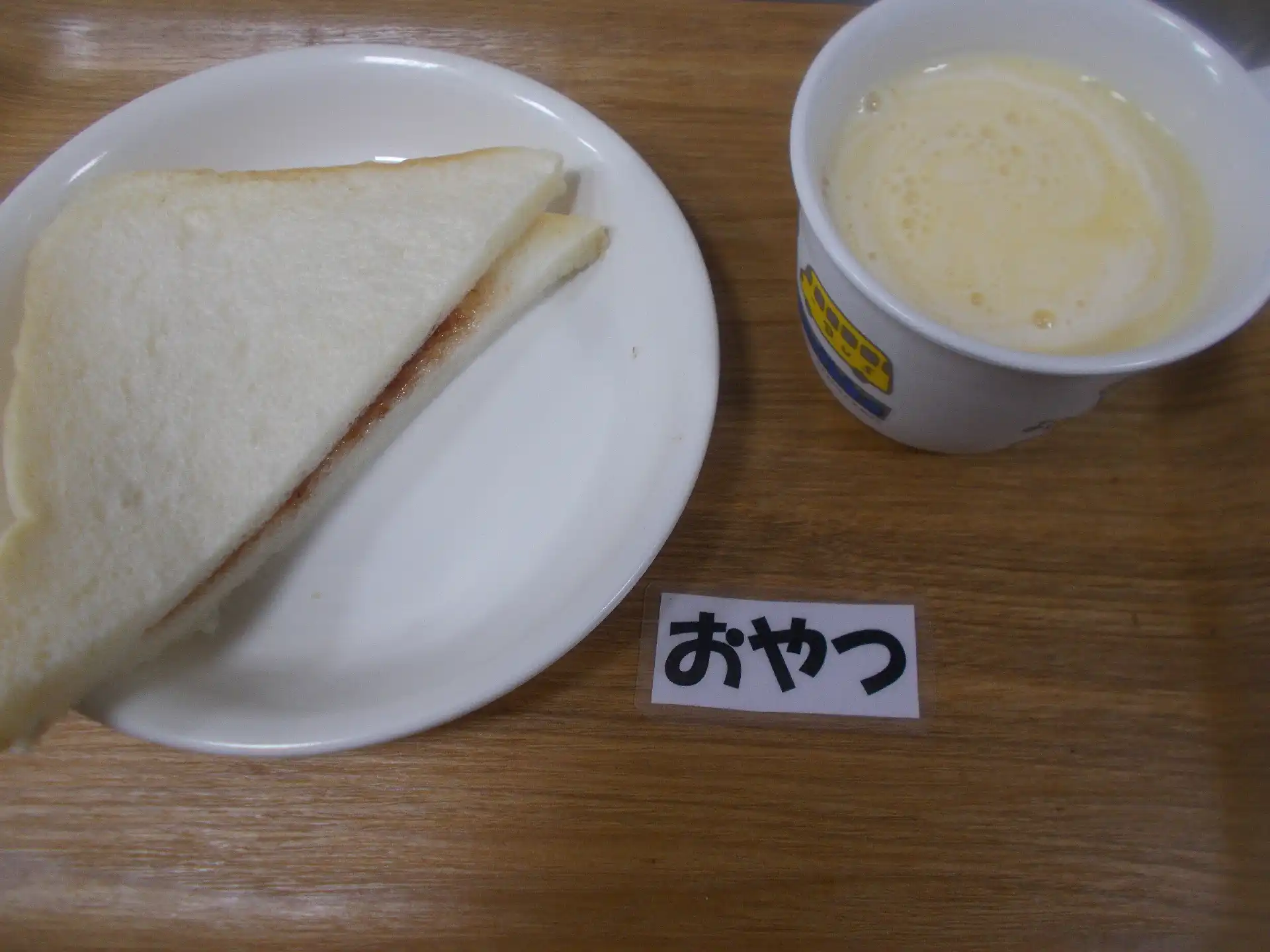 おやつ | ジャムサンド、牛乳 (離乳PM)かぼちゃのサンドイッチ、温牛乳 |