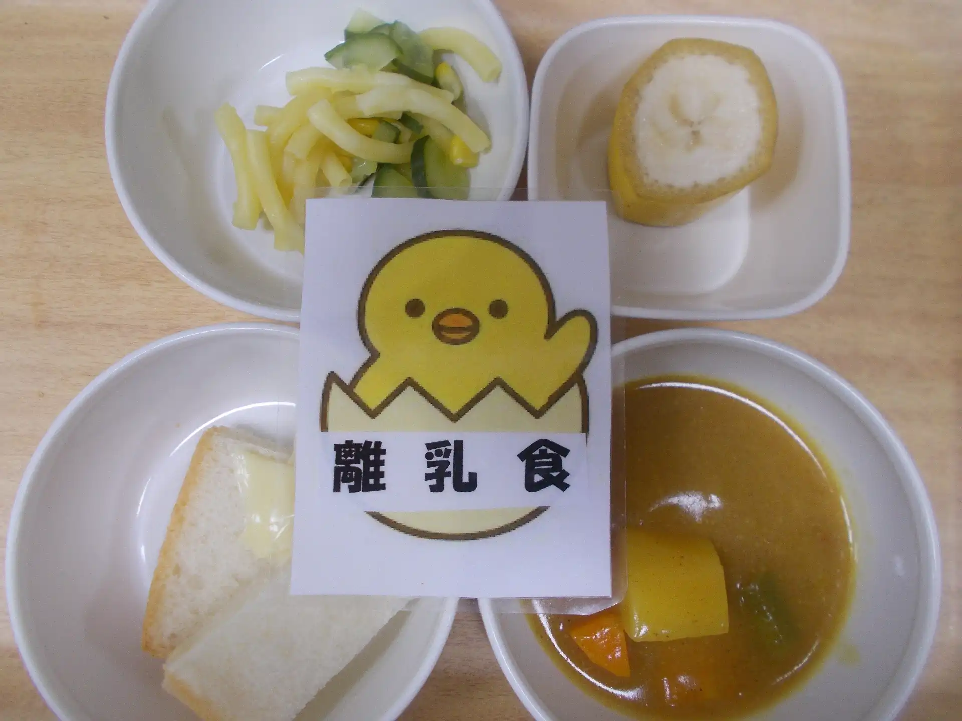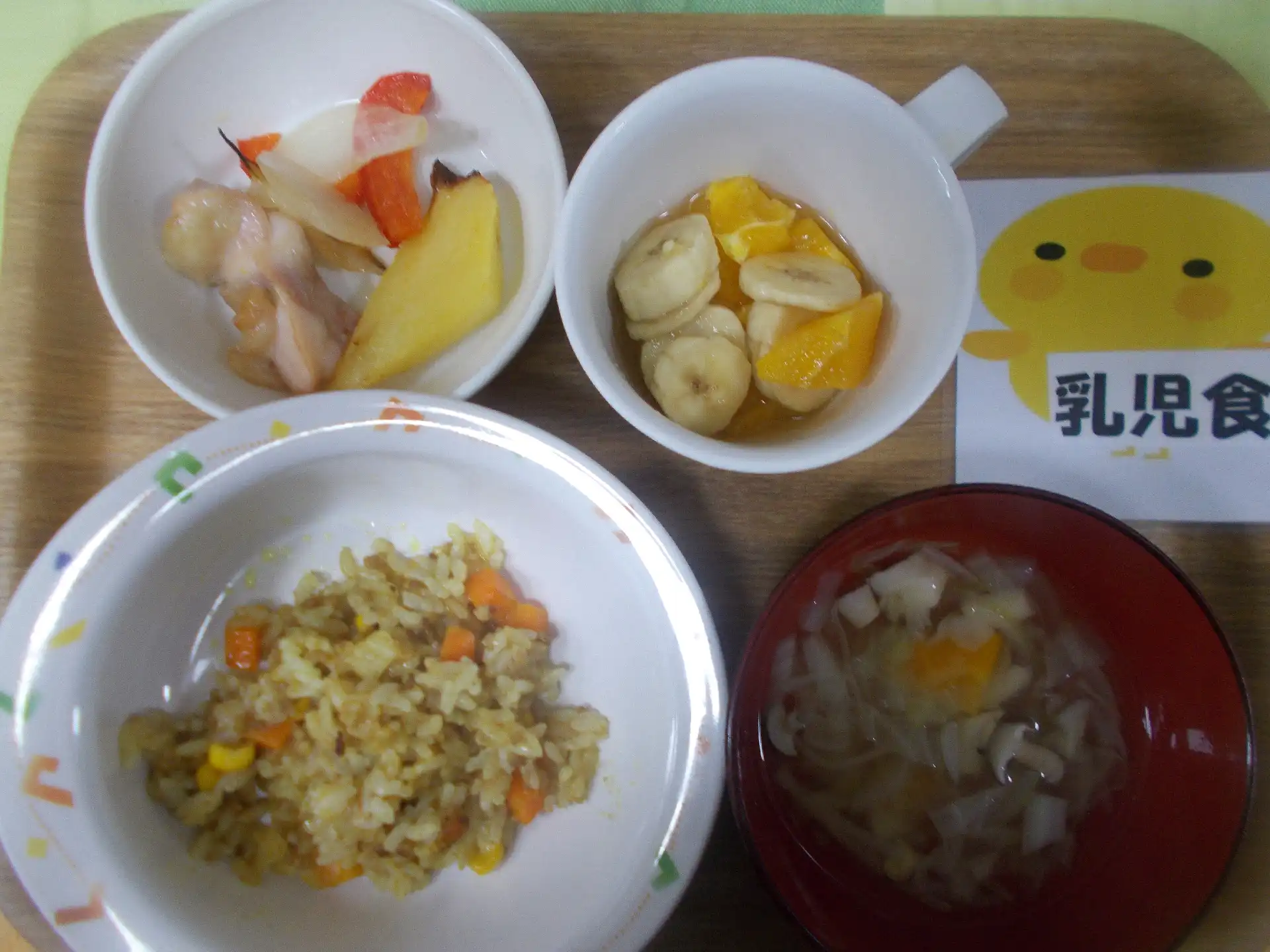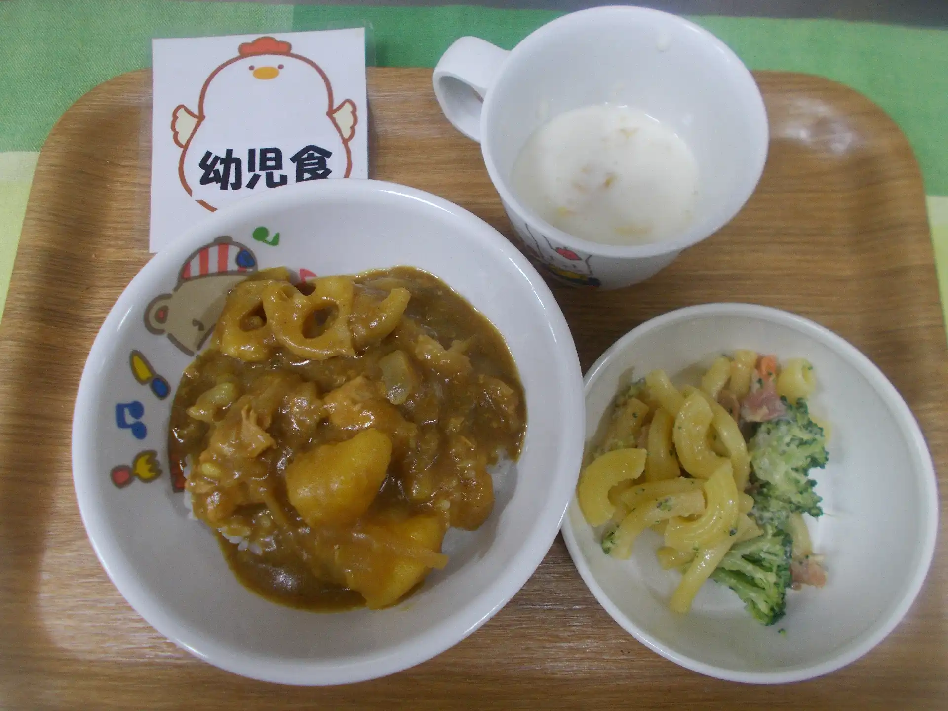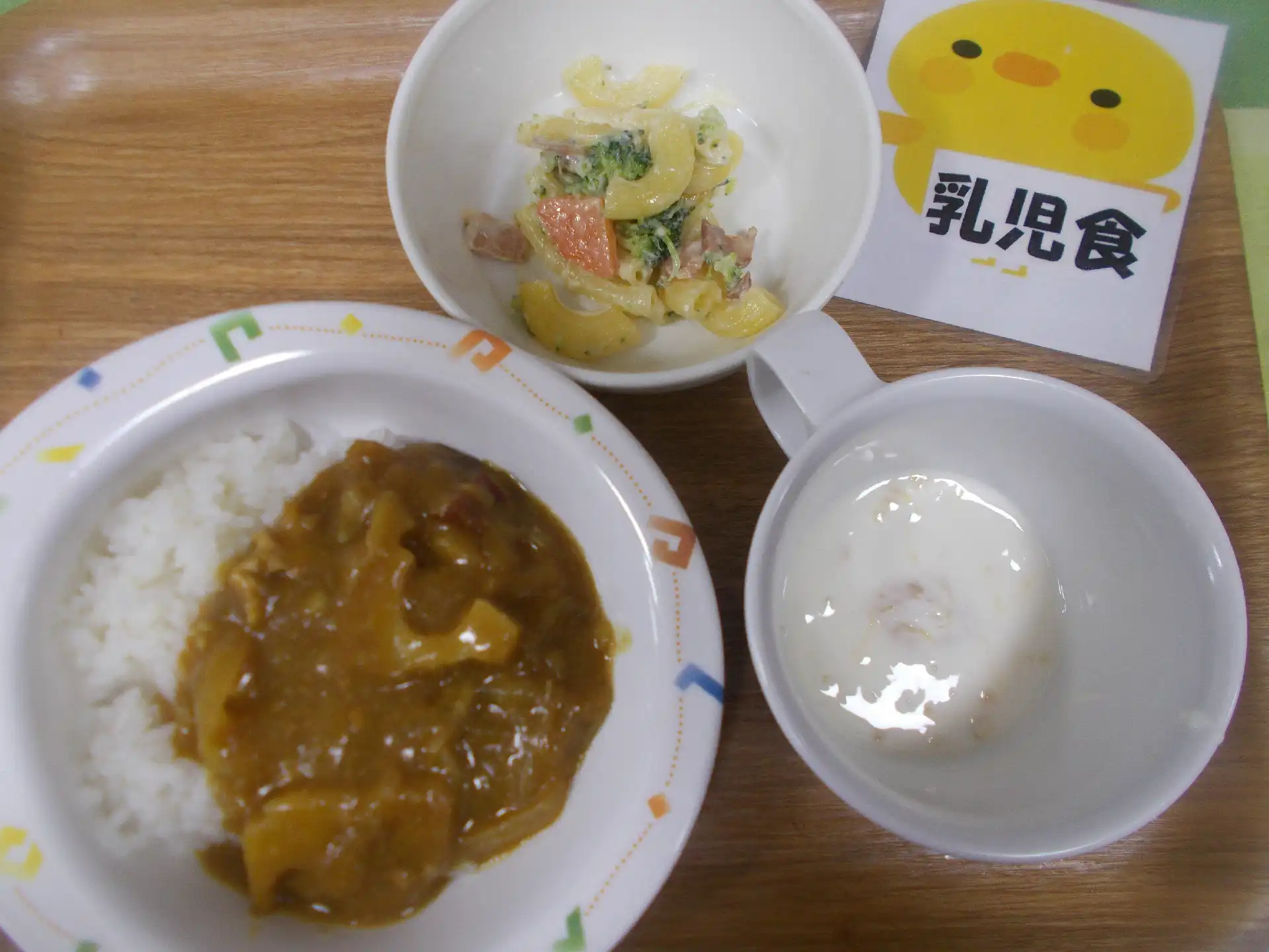 給食 | 根野菜のカレーライス、マカロニサラダ、フルーツヨーグルト 離乳食:乳児と同じ | ||