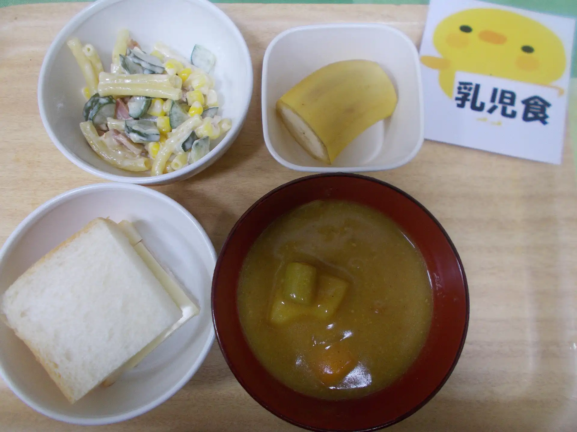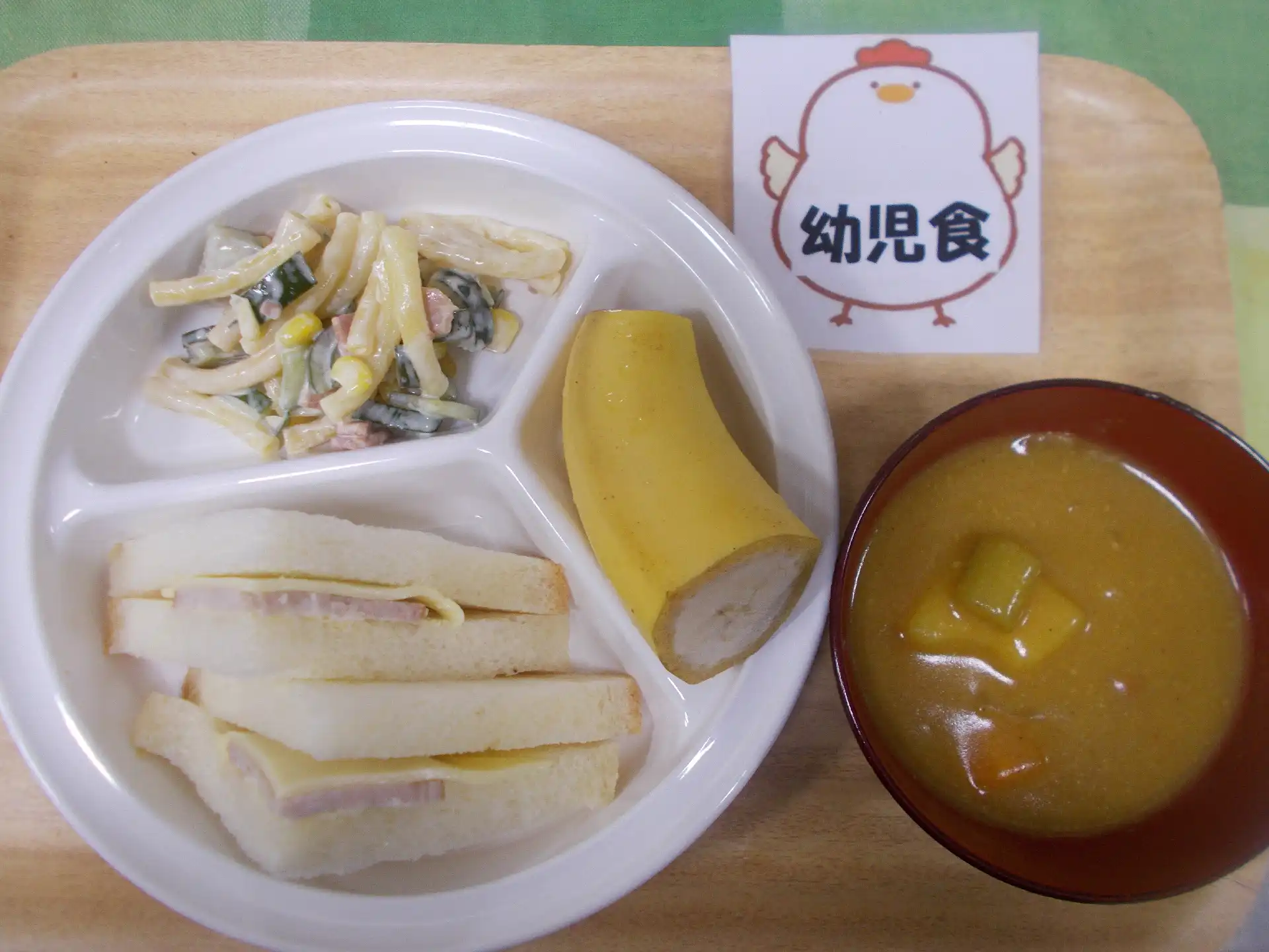 給食 | サンドイッチ(ハム&チーズ)、マカロニサラダ、豆乳カレースープ、バナナ 離乳:パン&チーズ、マカロニサラダ、豆乳カレースープ、バナナ | ||