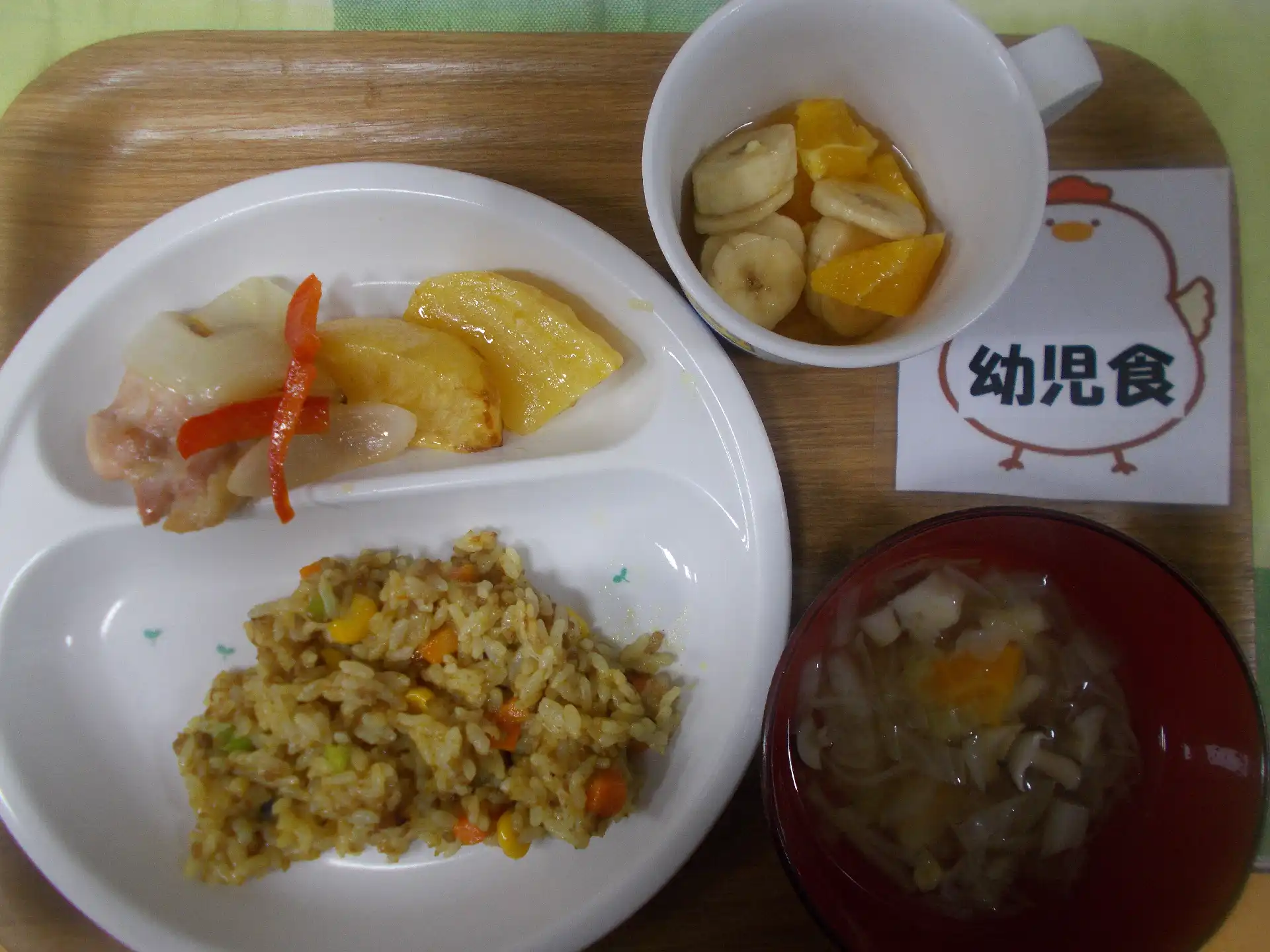 給食 | カレー炒飯、鶏肉と野菜のグリル、野菜スープ、フルーツポンチ | ||