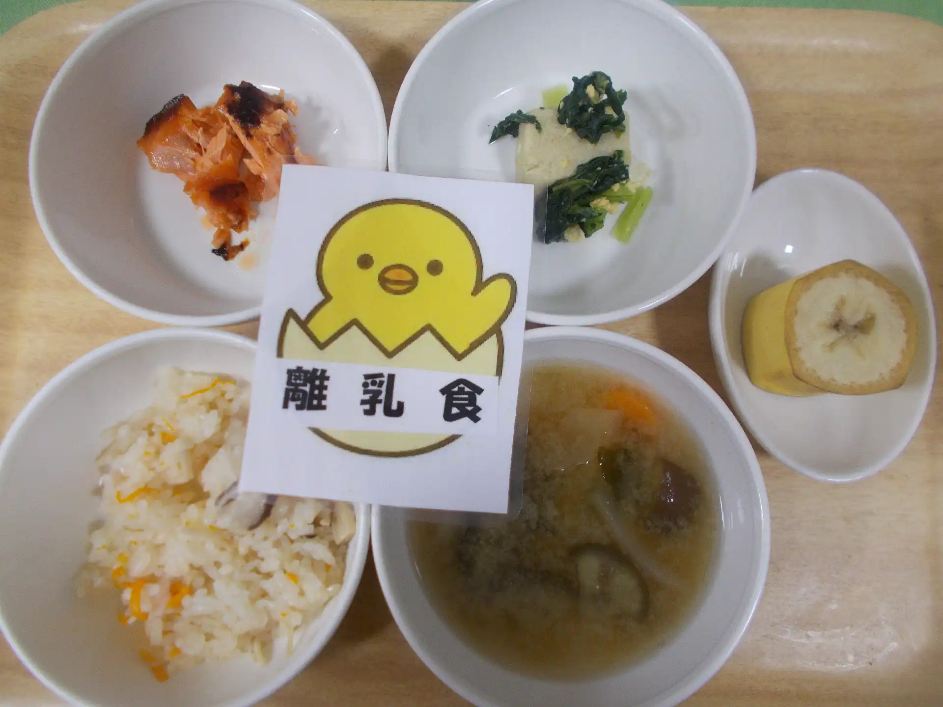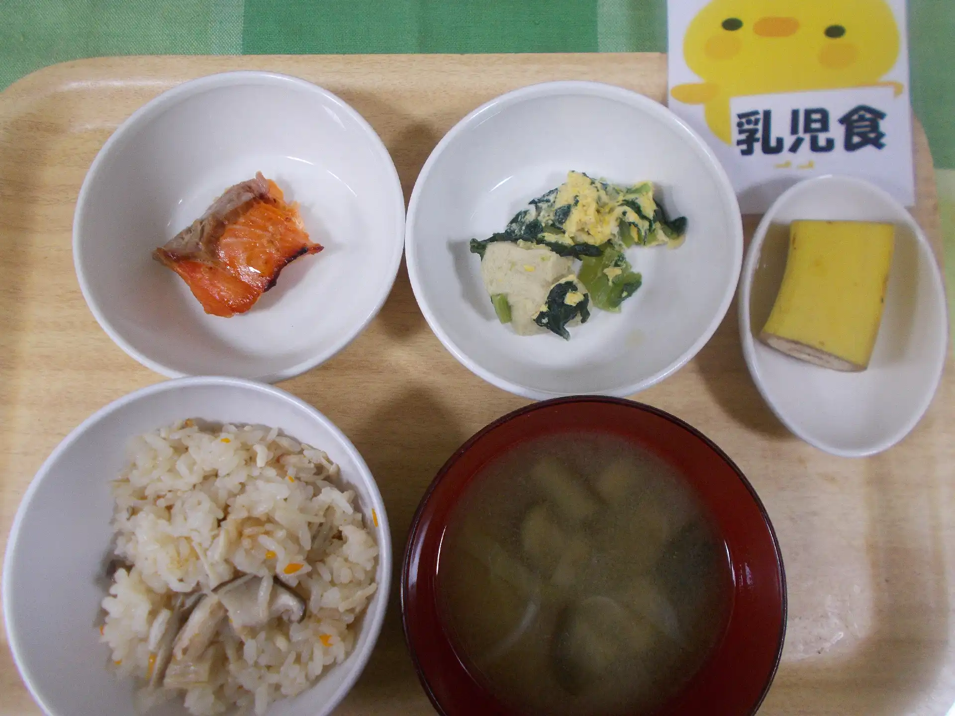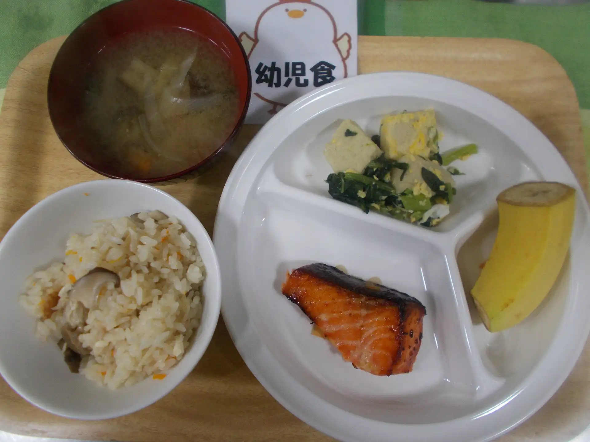 給食 | きのこご飯、鮭の塩こうじ焼き、凍り豆腐の卵とじ、みそ汁、バナナ 離乳食:乳児と同じ | ||