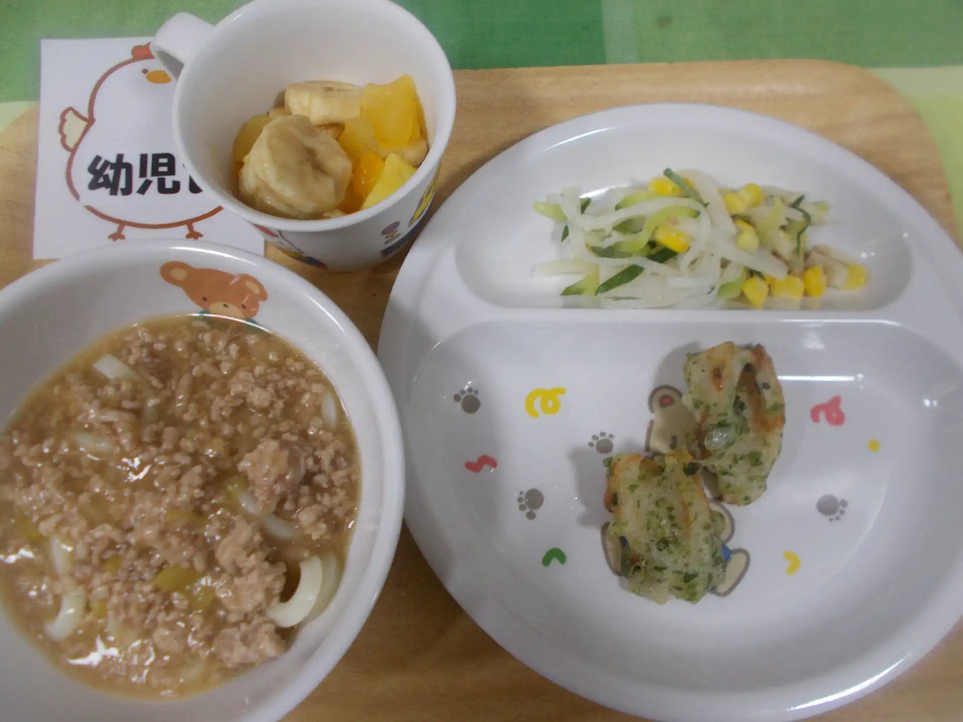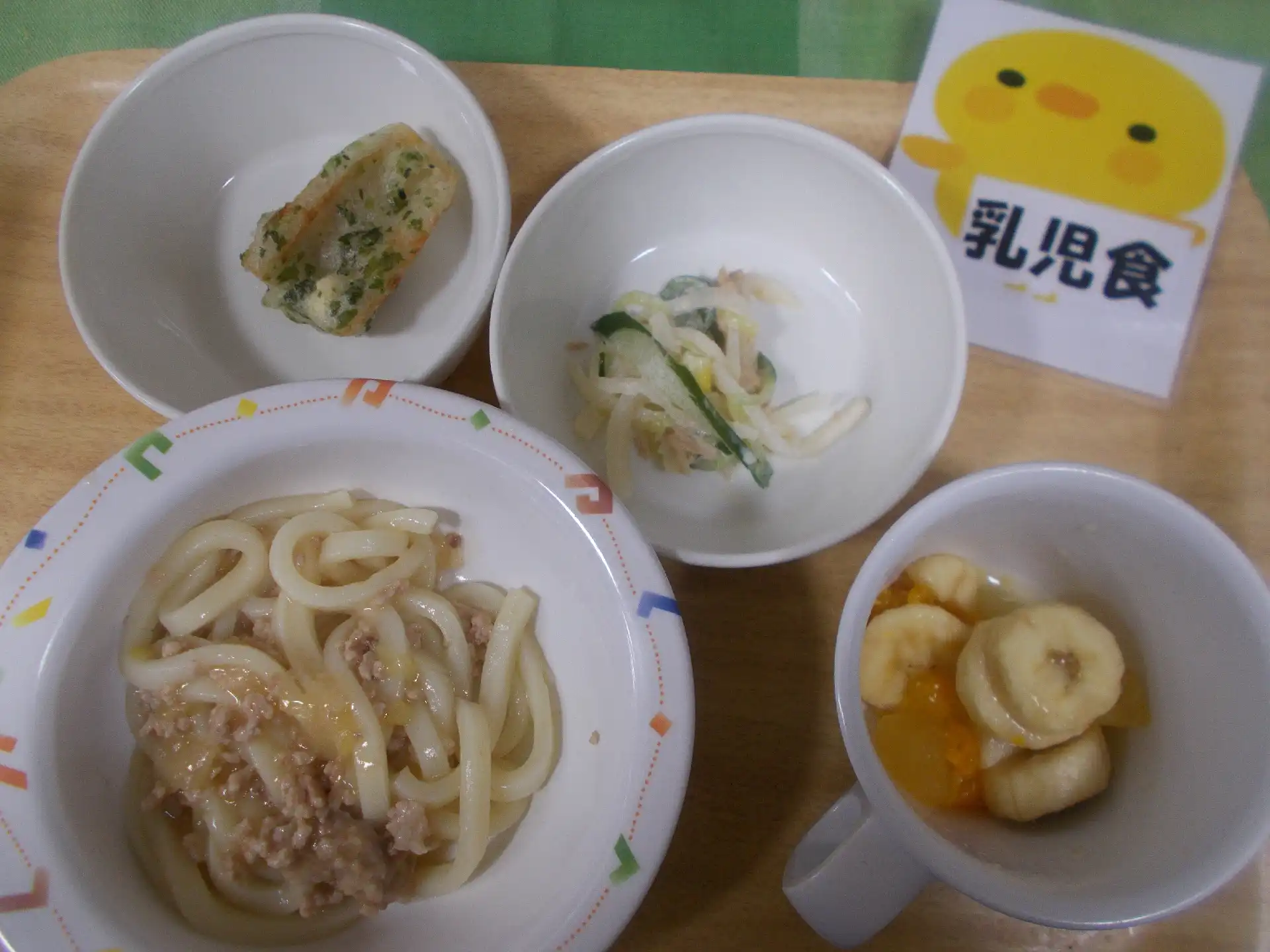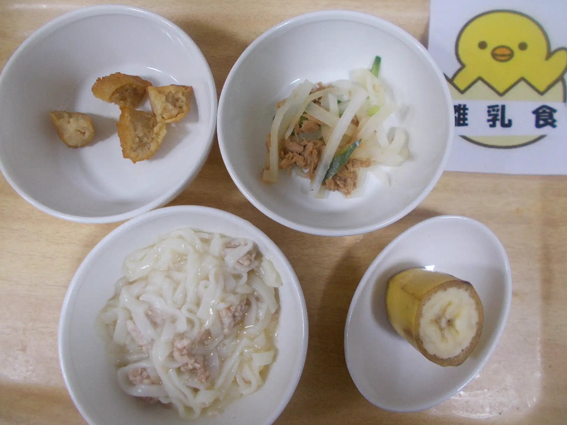 給食 | じゃーじゃーうどん、ちくわの磯部揚げ、大根とツナのサラダ、フルーツポンチ 離乳食:そぼろうどん、さかなのから揚げ、大根とツナの和え物、バナナ | ||