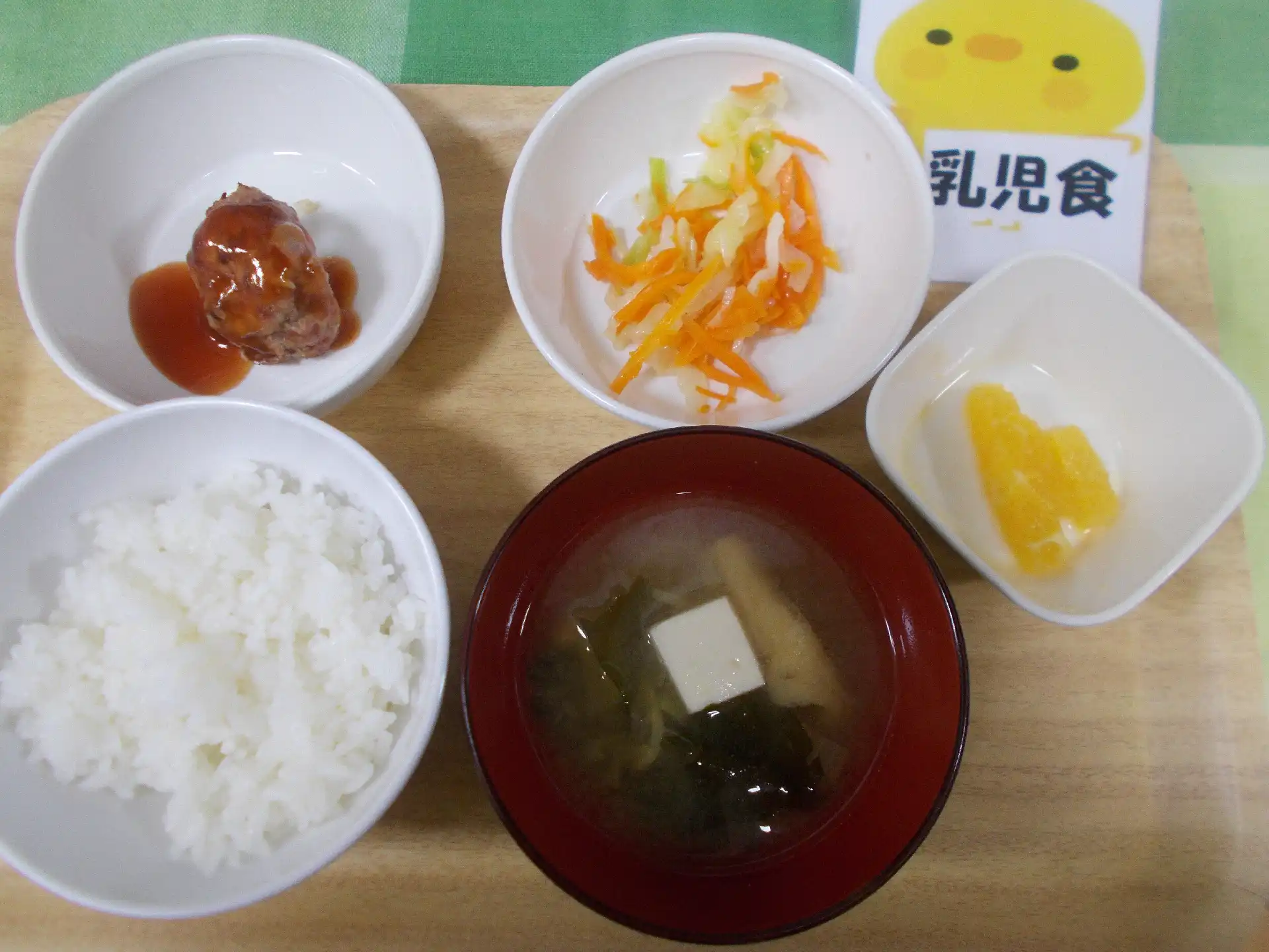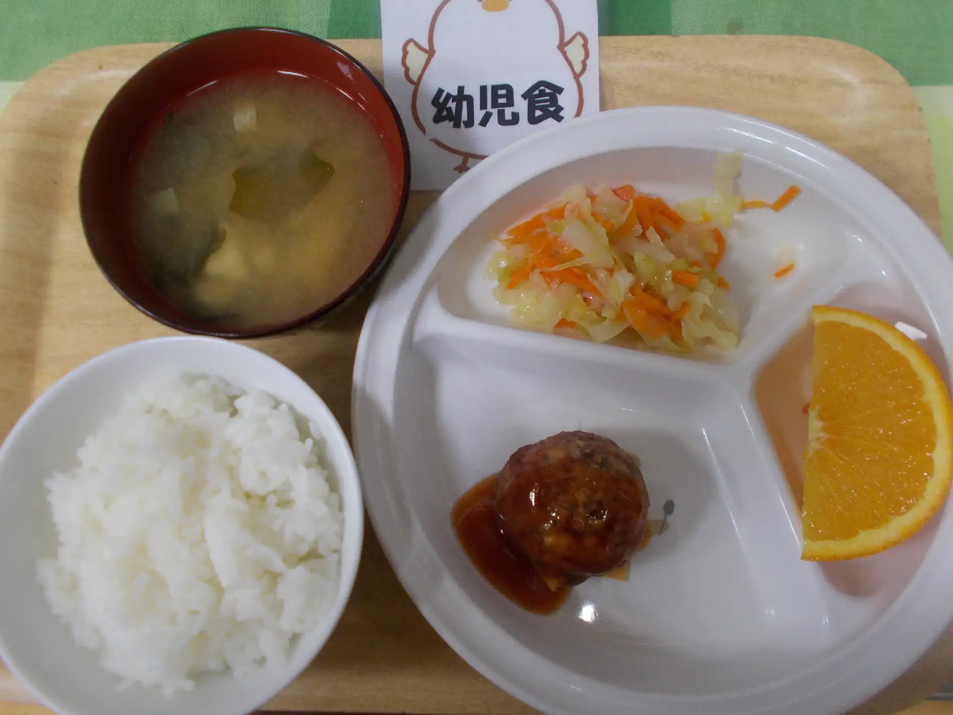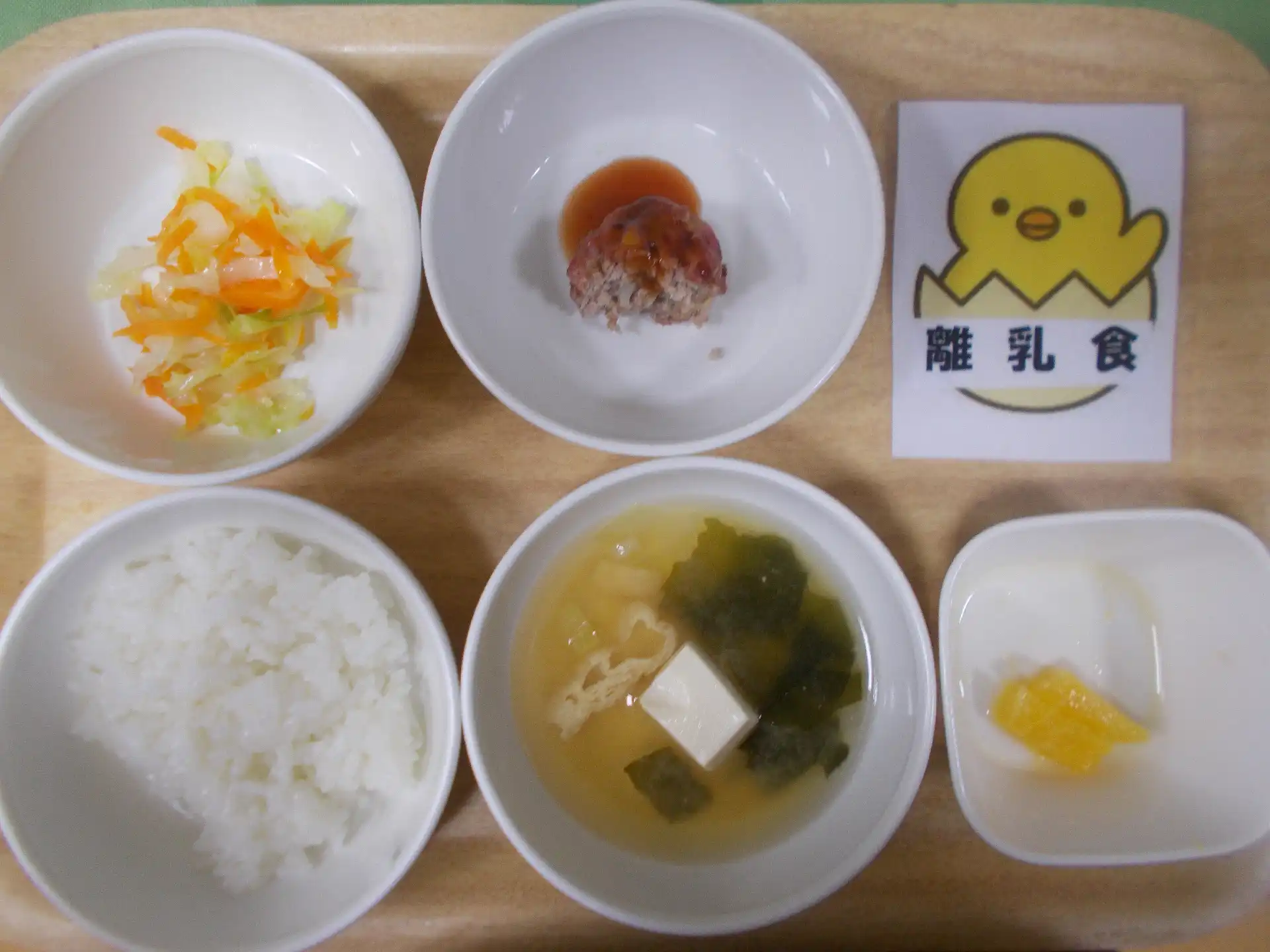 給食 | ご飯、ハンバーグ、キャベツサラダ、みそ汁、オレンジ 離乳食:乳児と同じ | ||