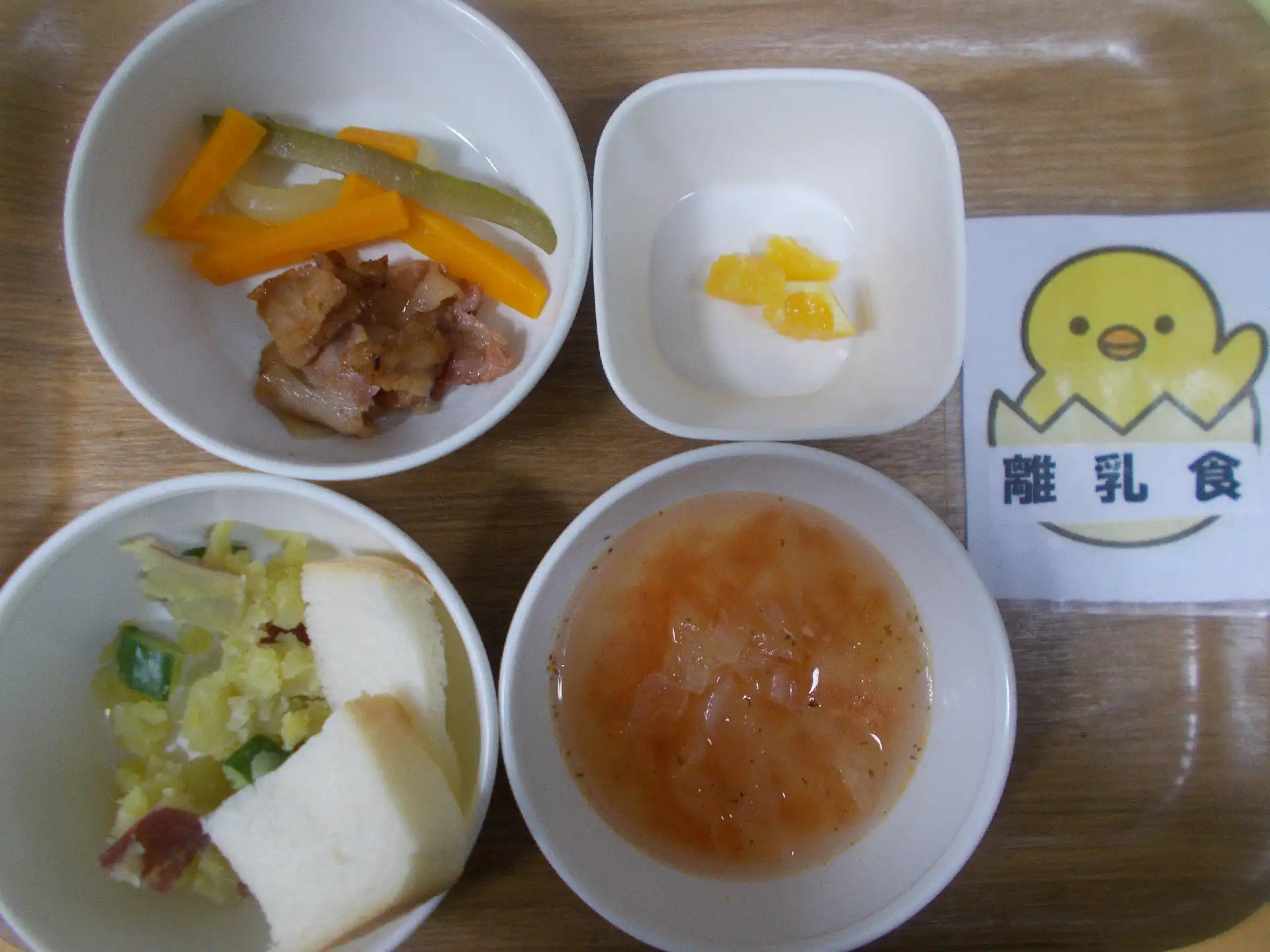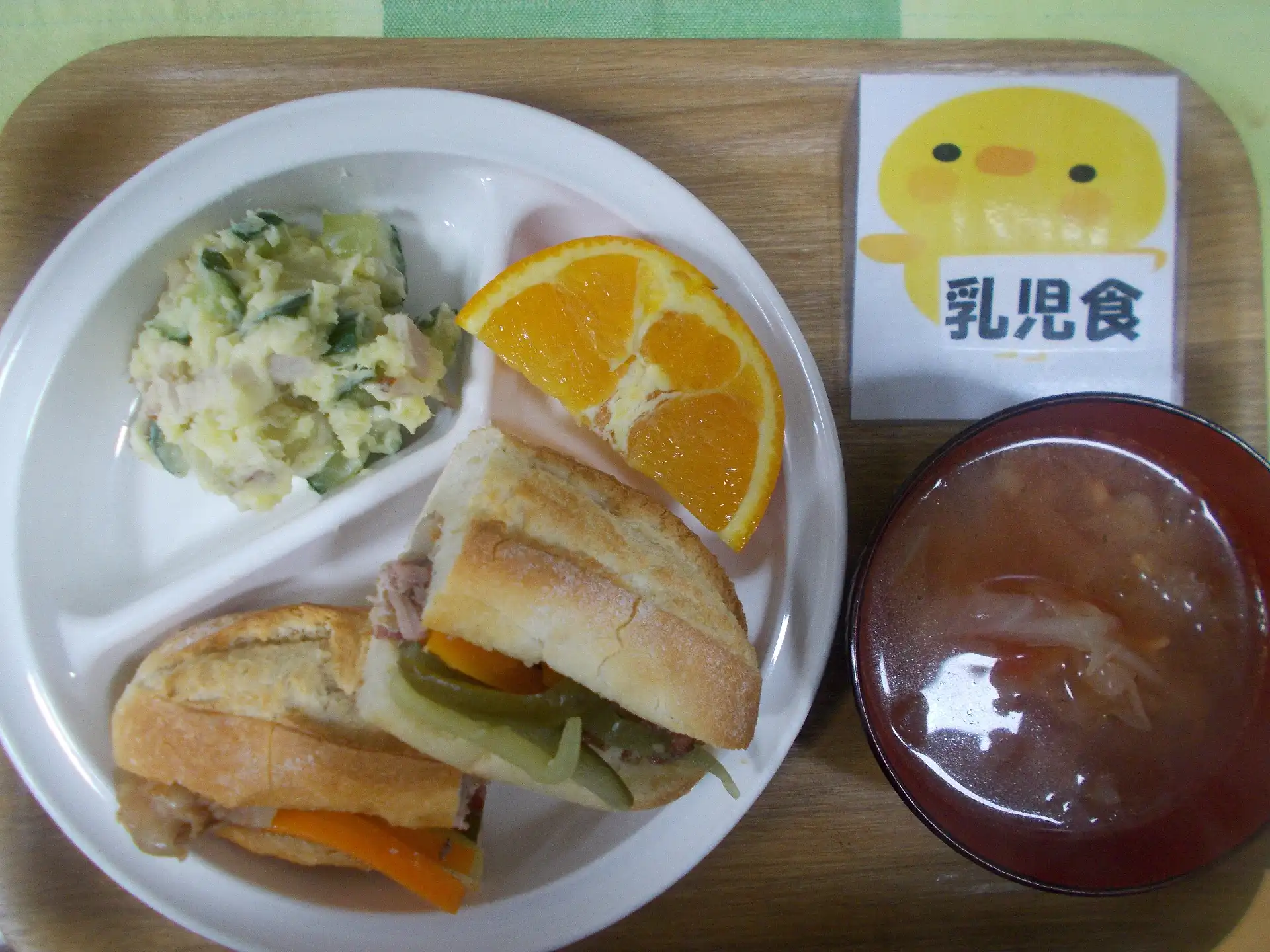 給食 | バインミー風サンド、さつま芋のサラダ、野菜スープ、オレンジ 離乳食:スティックパン、乳児と同じ | ||
