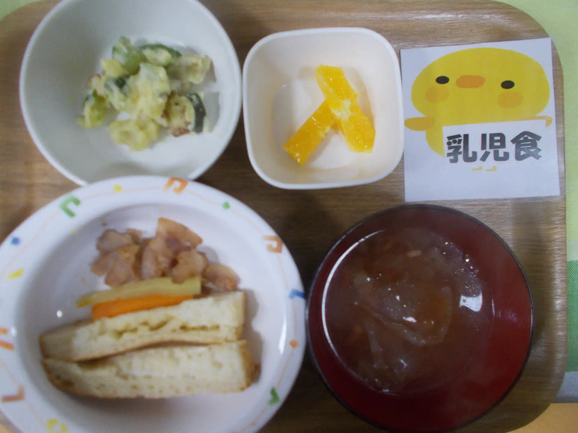 おやつ | ジャムサンド、オレンジ豆乳 離乳PM:パン&かぼちゃペースト、温牛乳 | ||