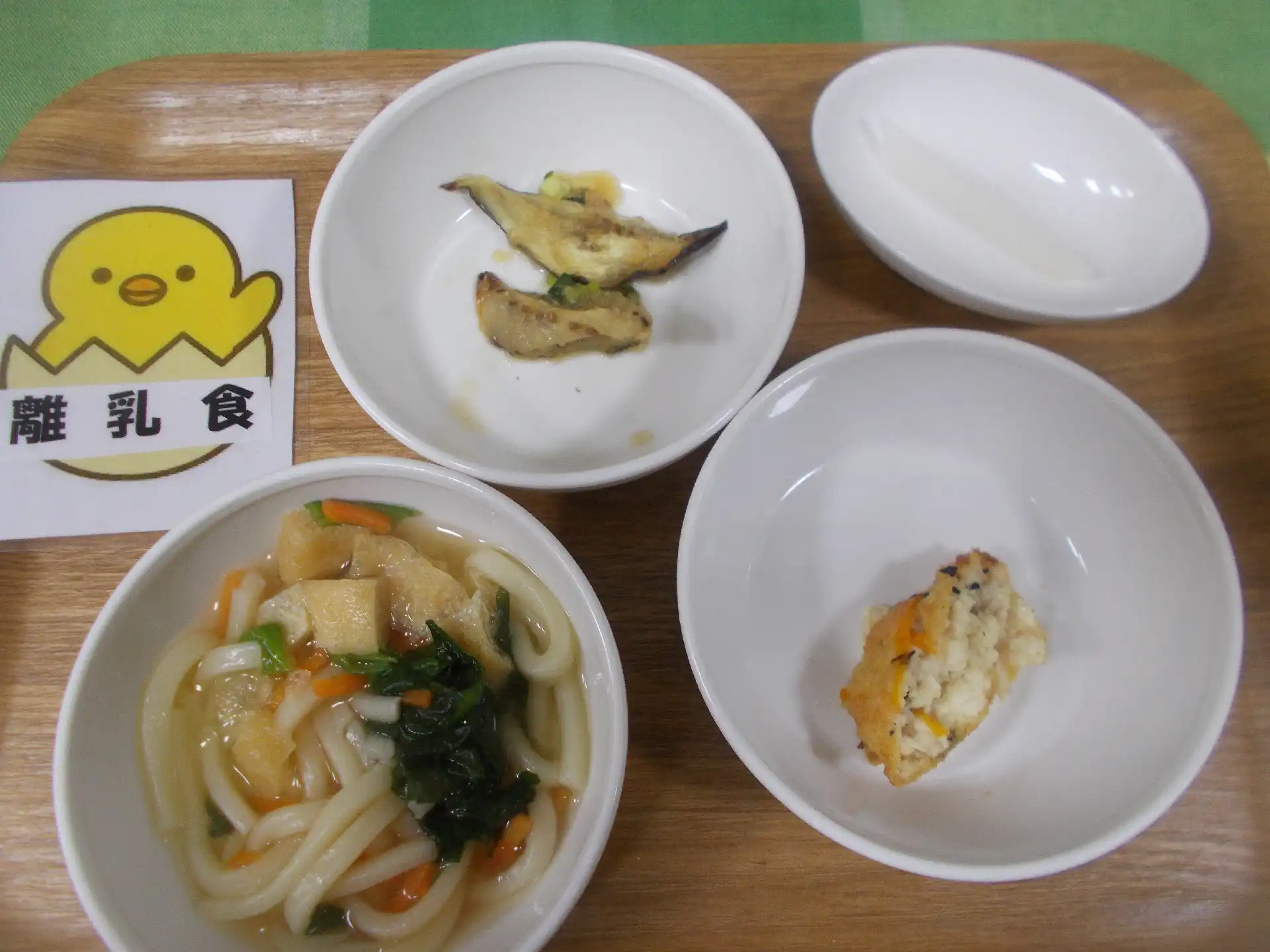 給食 | お彼岸メニュー/けんちんうどん、手作りがんもどき、なすのじゃこおろし、梨 離乳食:乳児と同じ | ||