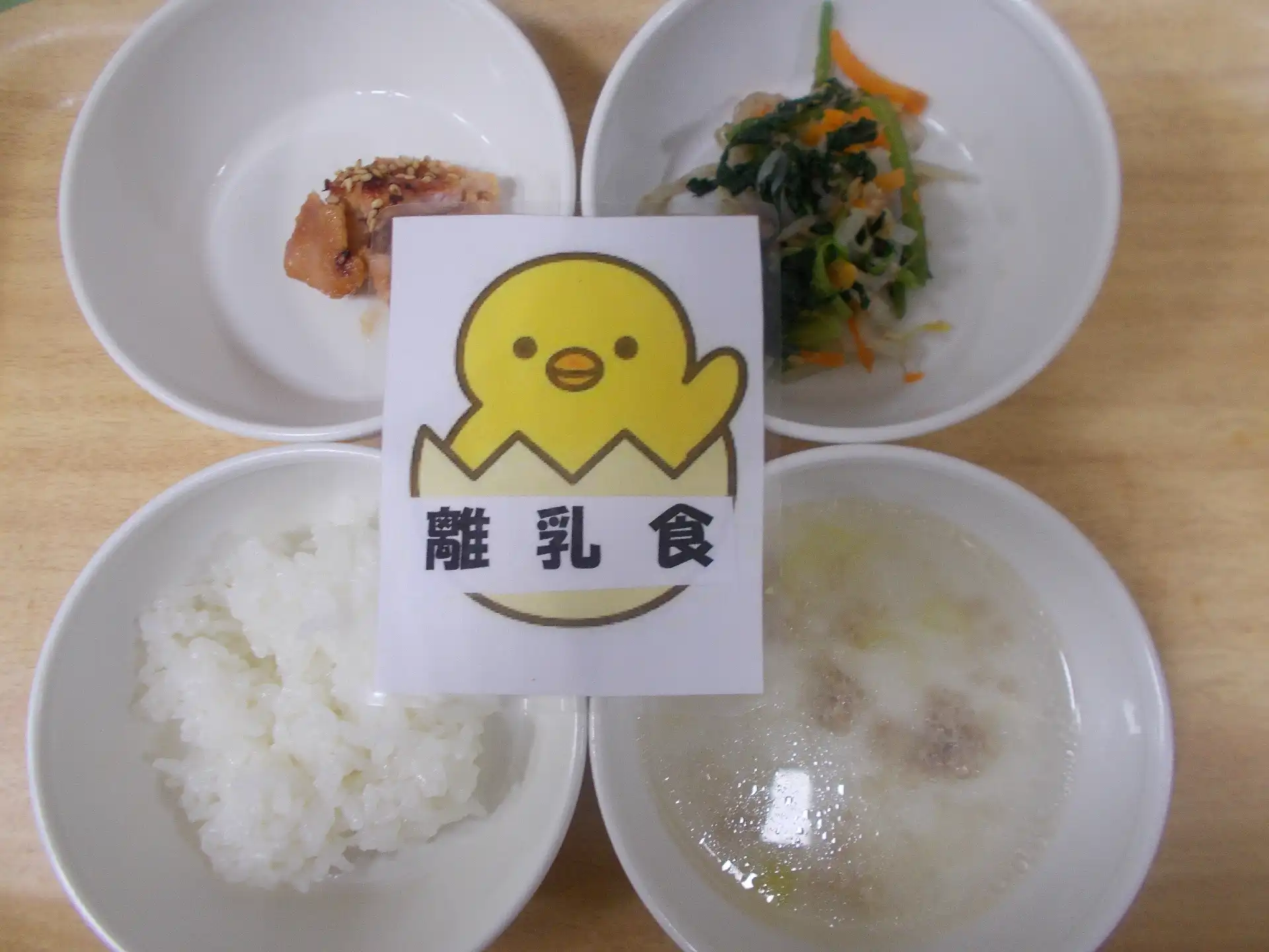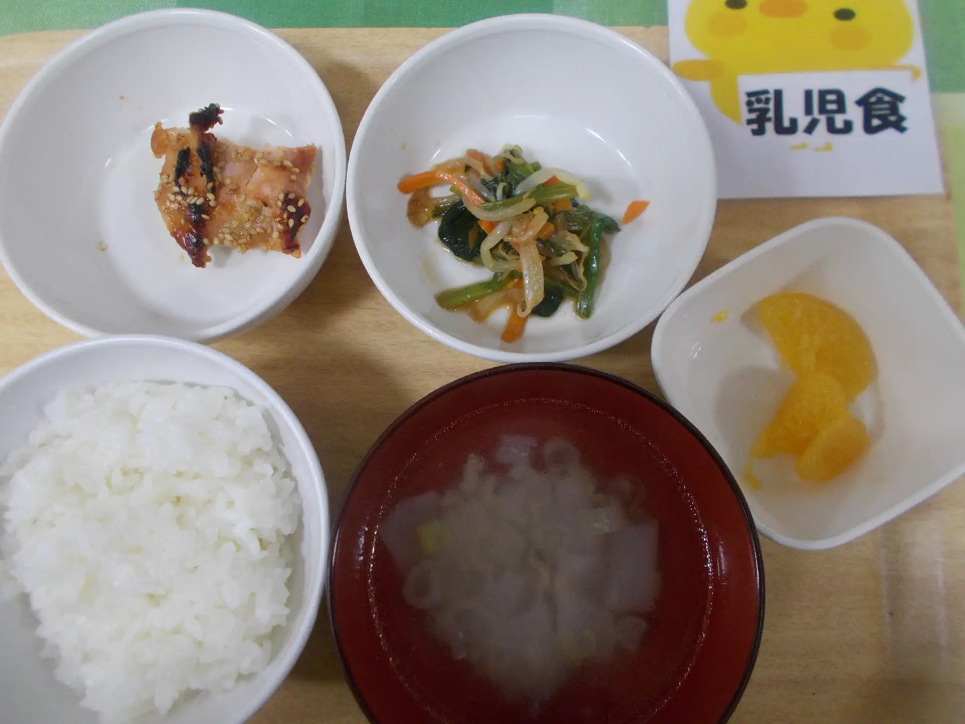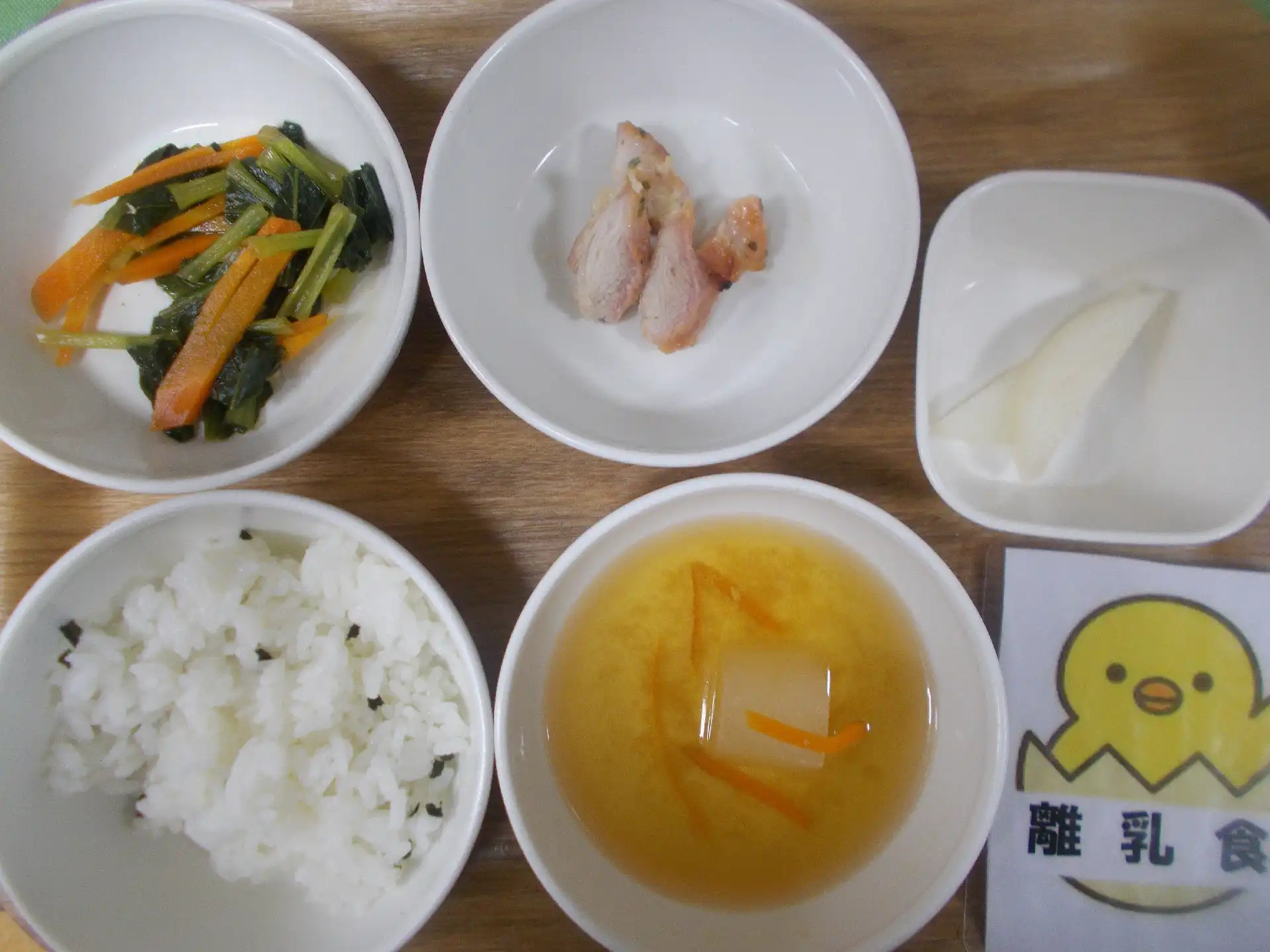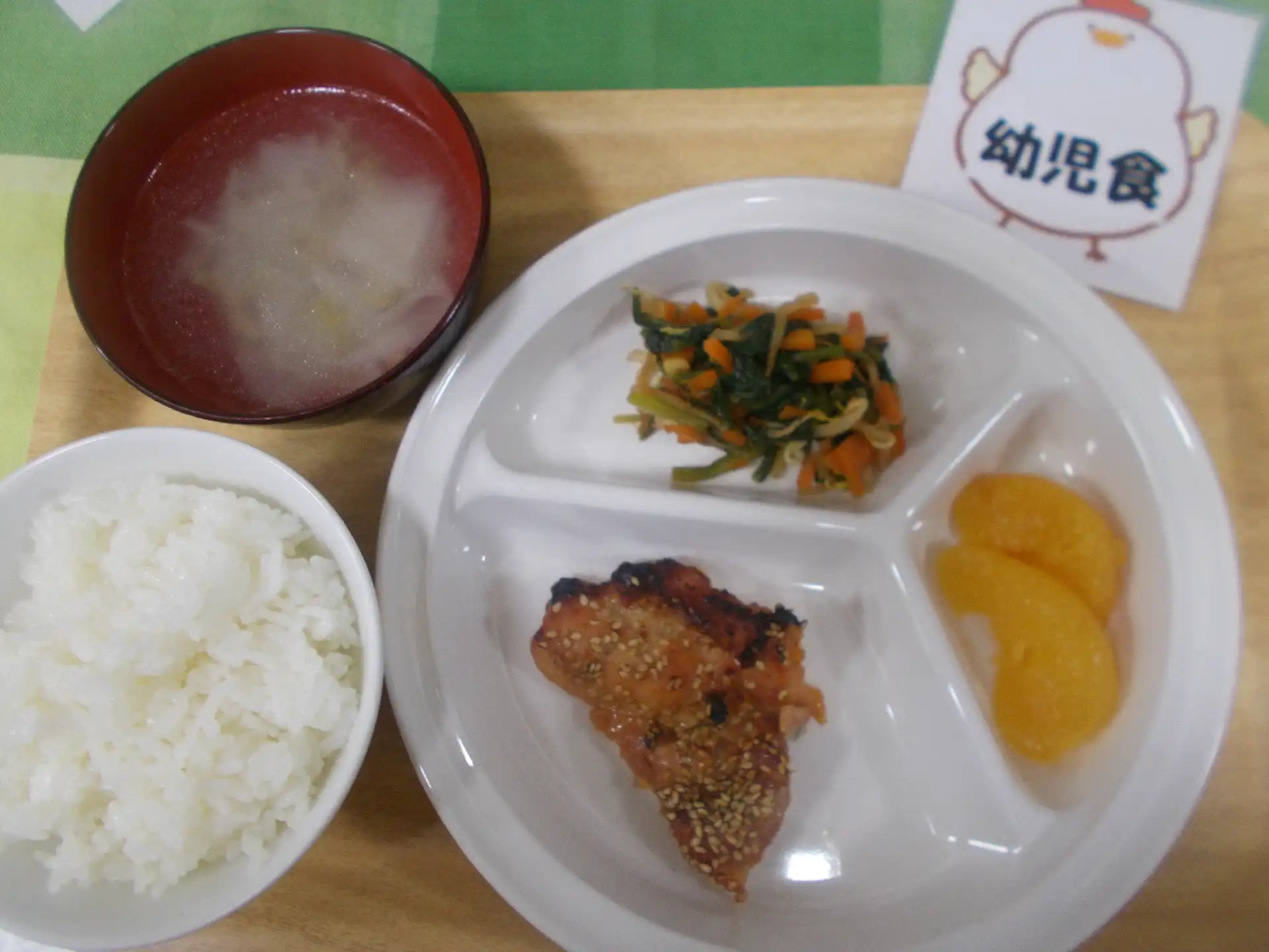 給食 | ご飯、鶏肉のごまみそ焼き、ほうれん草のナムル、ワンタンスープ、 夏みかん缶 離乳食:乳児と同じ(ほうれん草おかか和え) | ||