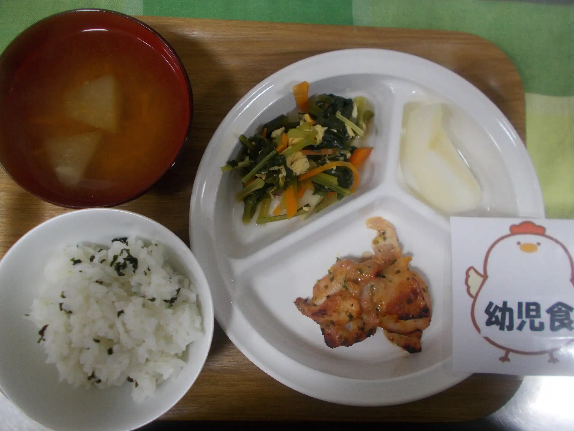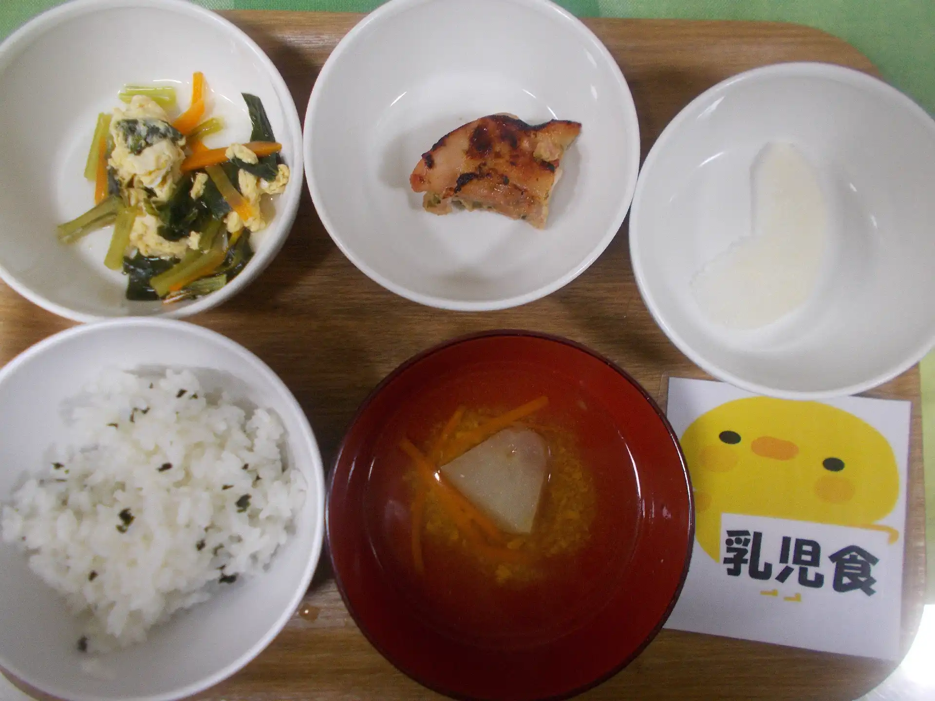 給食 | わかめご飯、鶏肉の磯みそ焼き、小松菜の卵とじ、とうがん汁、梨 離乳:乳児と同じ | ||