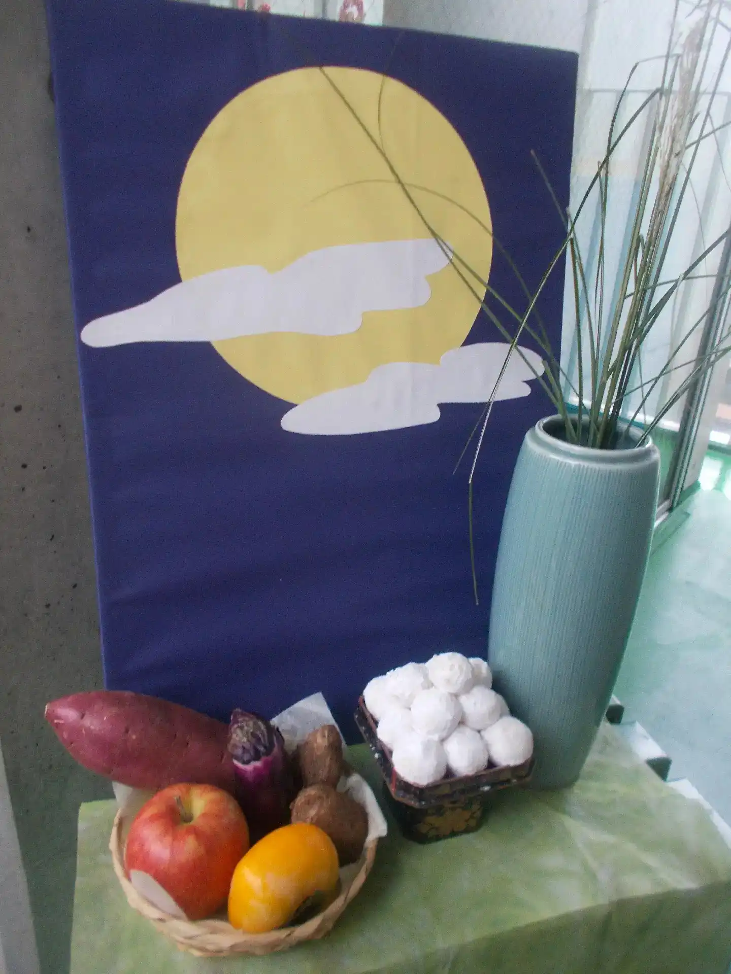 説明 | お月見は日本の伝統行事です。「中秋の名月」や「十五夜」と呼ばれています。すすきや団子を供えます。お月見団子は収穫された米を使って作られるのが一般的で供えた団子を食べることで月の力をわけてもらい、健やかに過ごせるようにという意味がこめられています。 |
