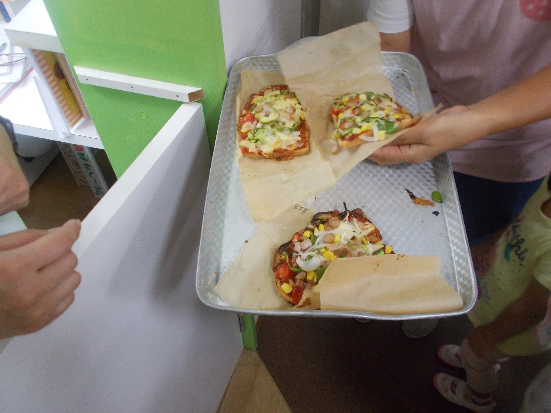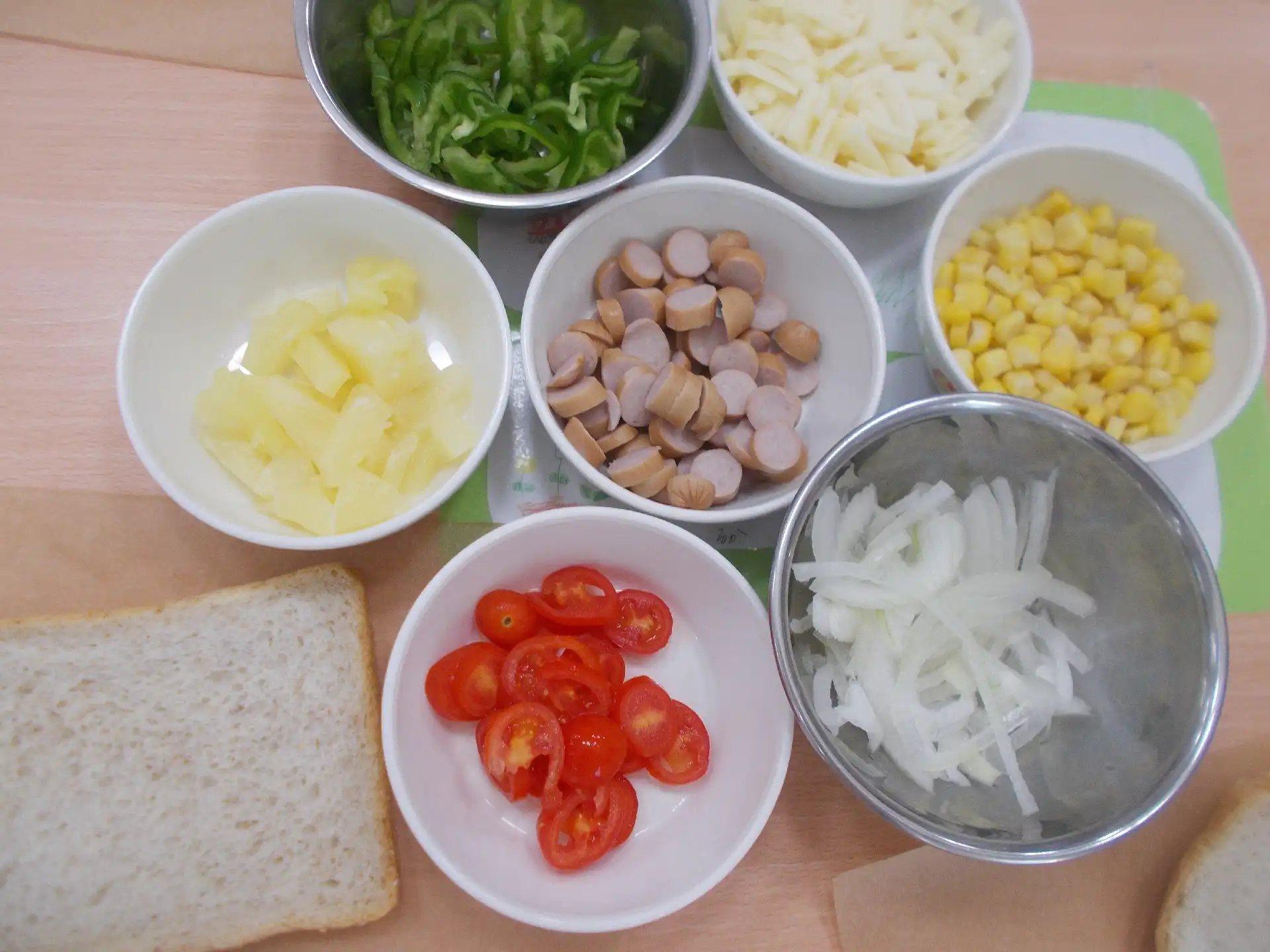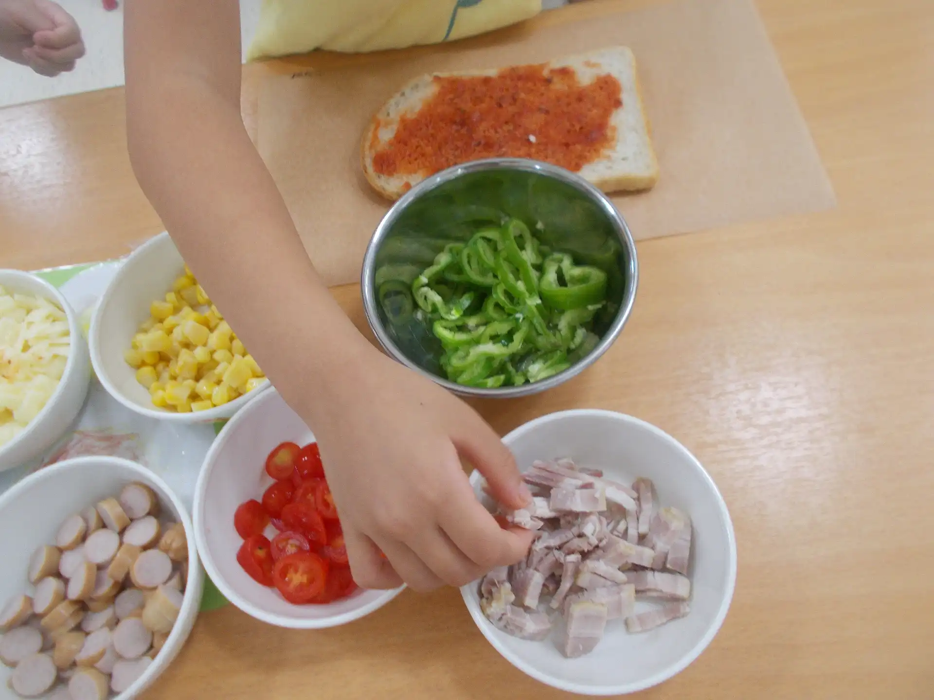 説明 | 今日は、すみれの食育活動「ピザ作り」でした。みんなで何をのせようか?と話し合い、たくさんの具材を用意しました。楽しく活動できました! |