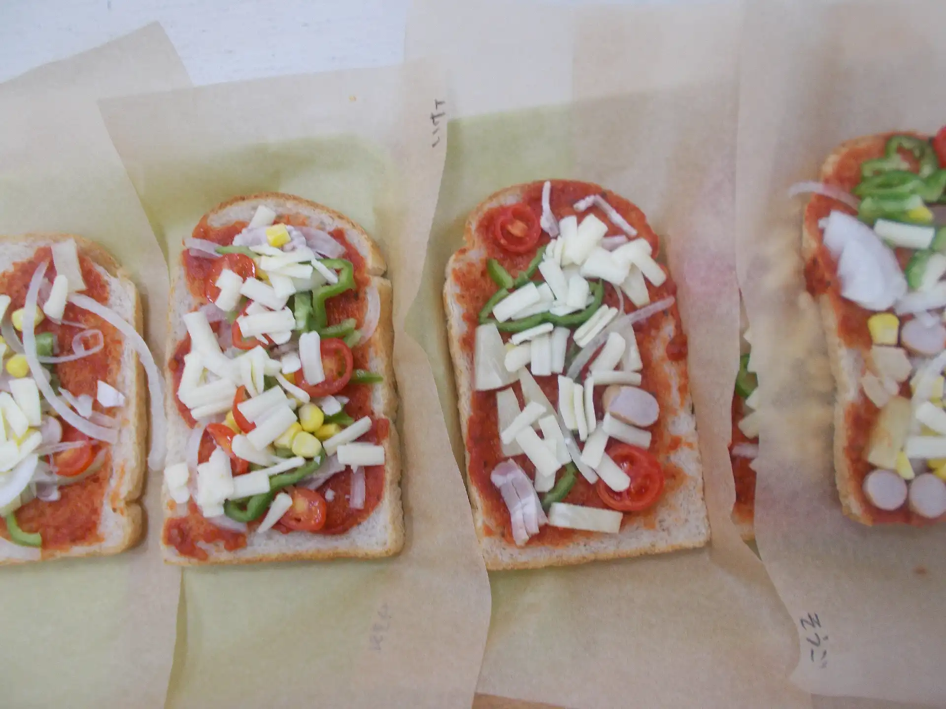 説明 | おやつの「ねばねばトースト」は、味付けした納豆を食パンにのせ、 ピザ用チーズをかけて焼きました。意外な組み合わせですが、食べやすく おやつだけでなく、朝食にもぴったりです。 |