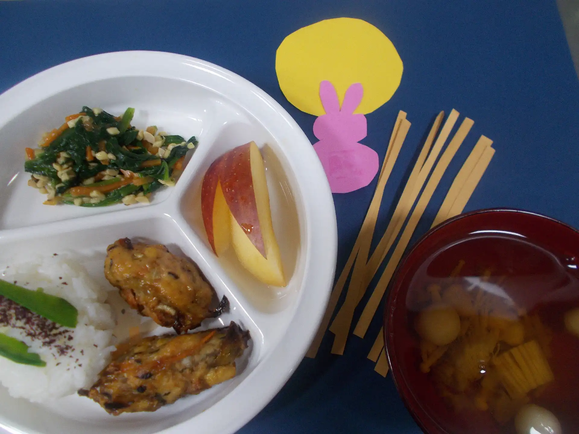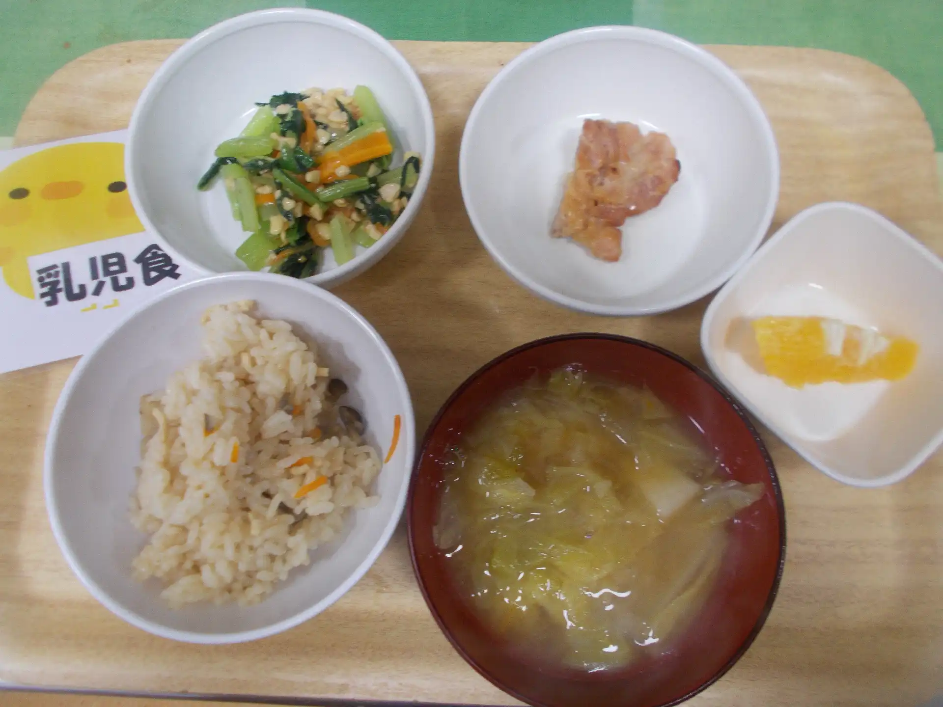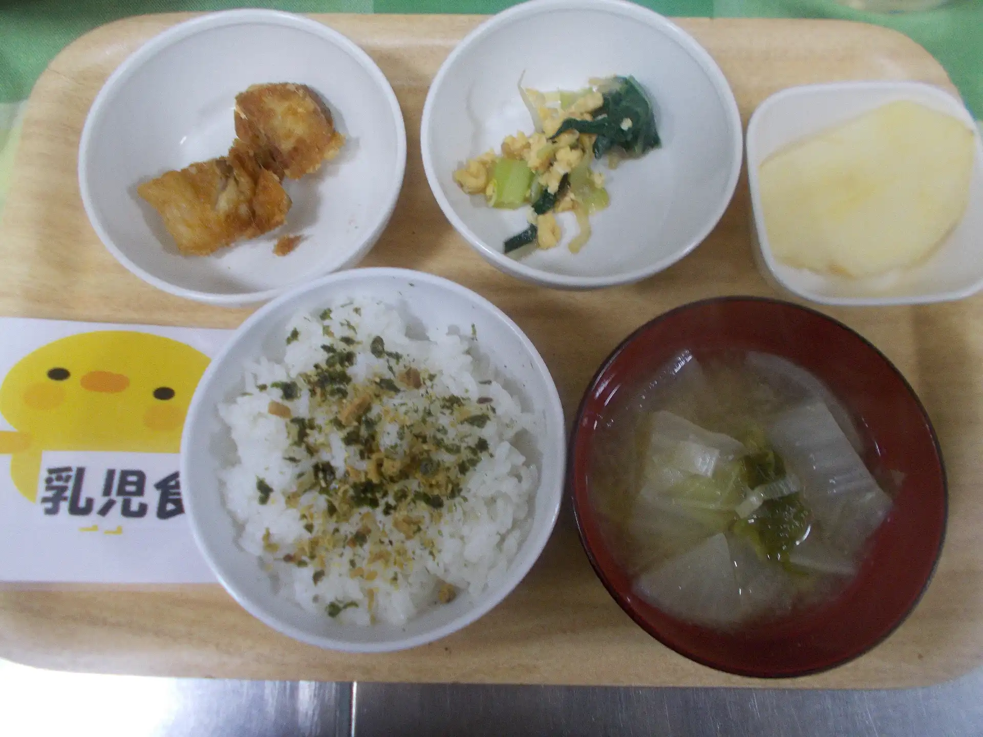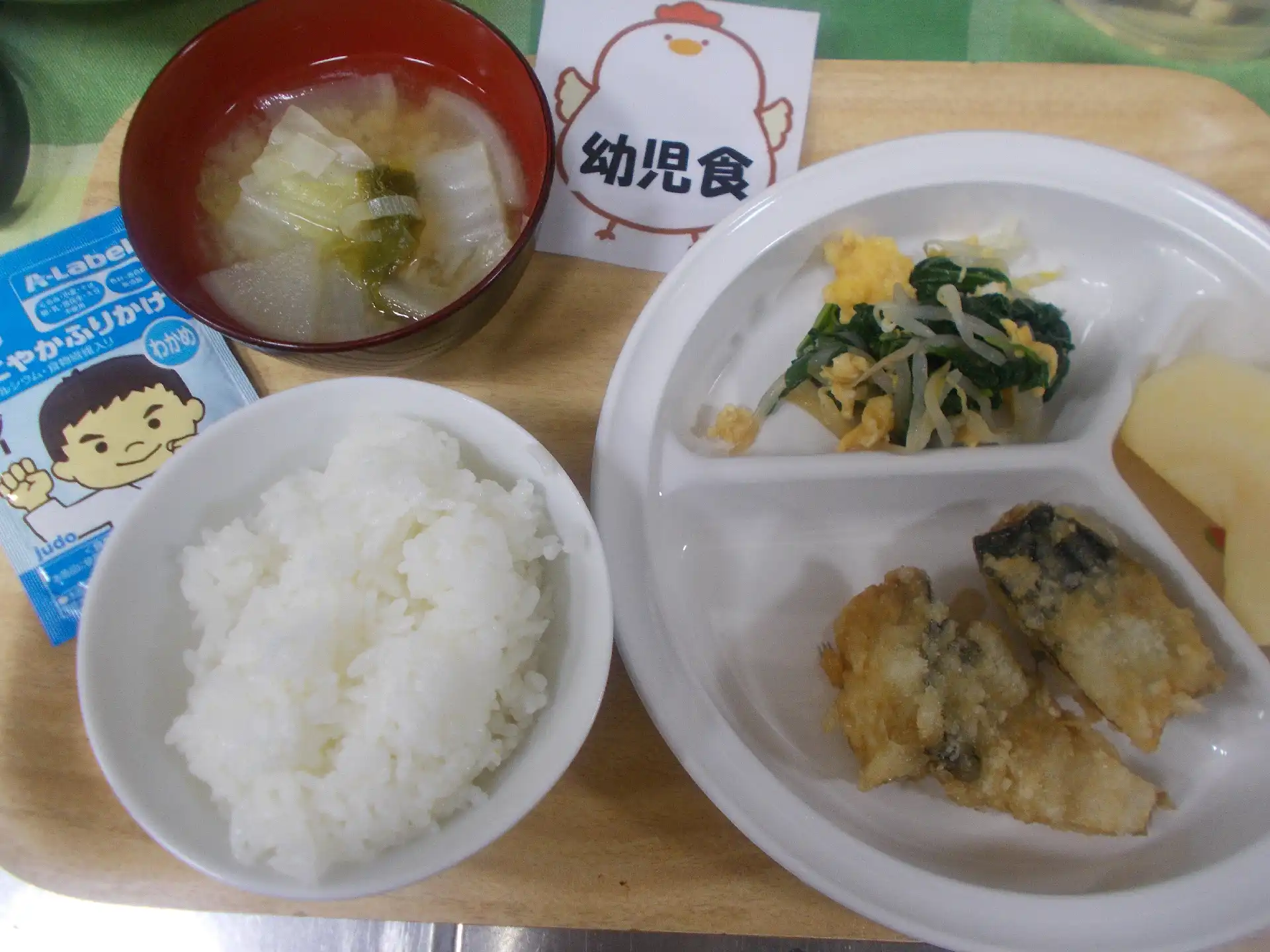 給食 | ふりかけご飯、さばの竜田揚げ、チンゲン菜の卵和え、五目汁、りんご 離乳:乳児と同じ | ||