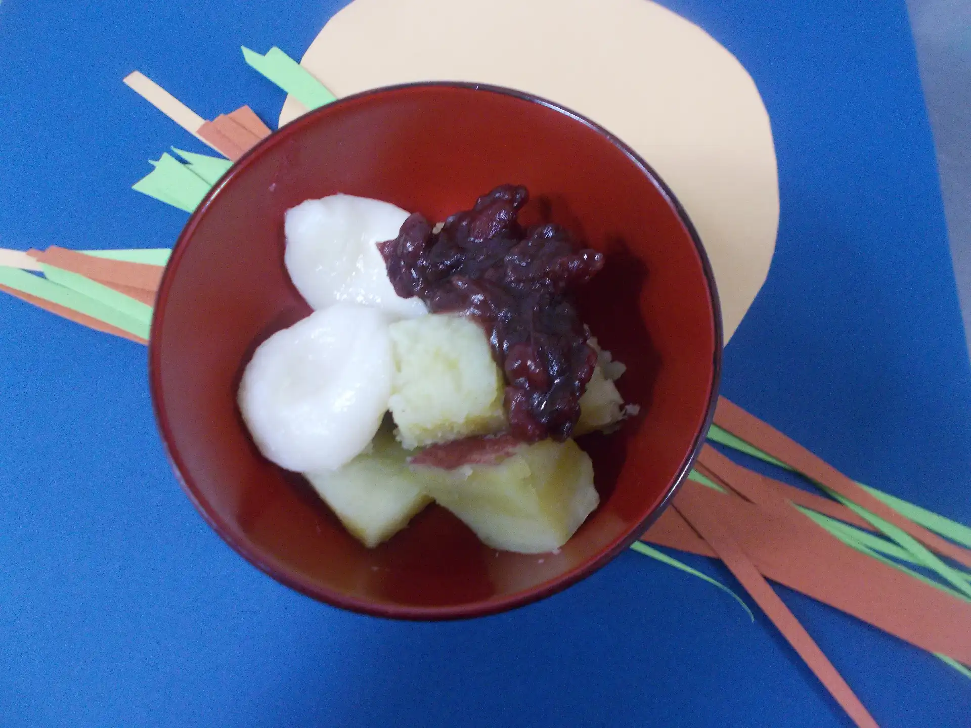 給食 | 行事食/お月見:うさぎごはん、つくね照り焼き、ほうれん草の納豆和え、すまし汁、うさぎりんご 離乳:乳児と同じ | ||