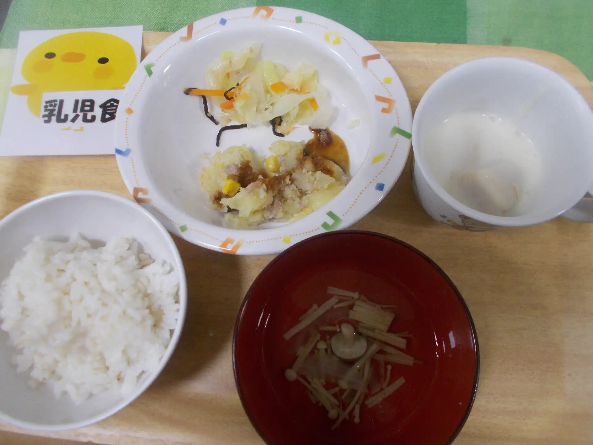 給食 | 麦入りご飯、カップコロッケ、キャベツの昆布和え、きのこスープ、フルーツヨーグルト 離乳:乳児と同じ | ||