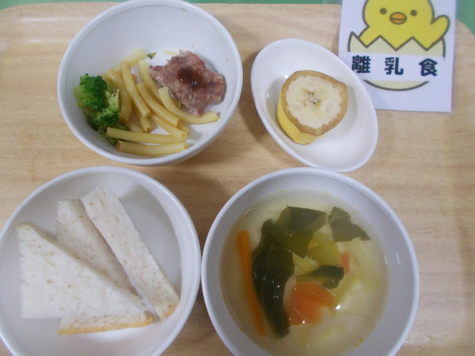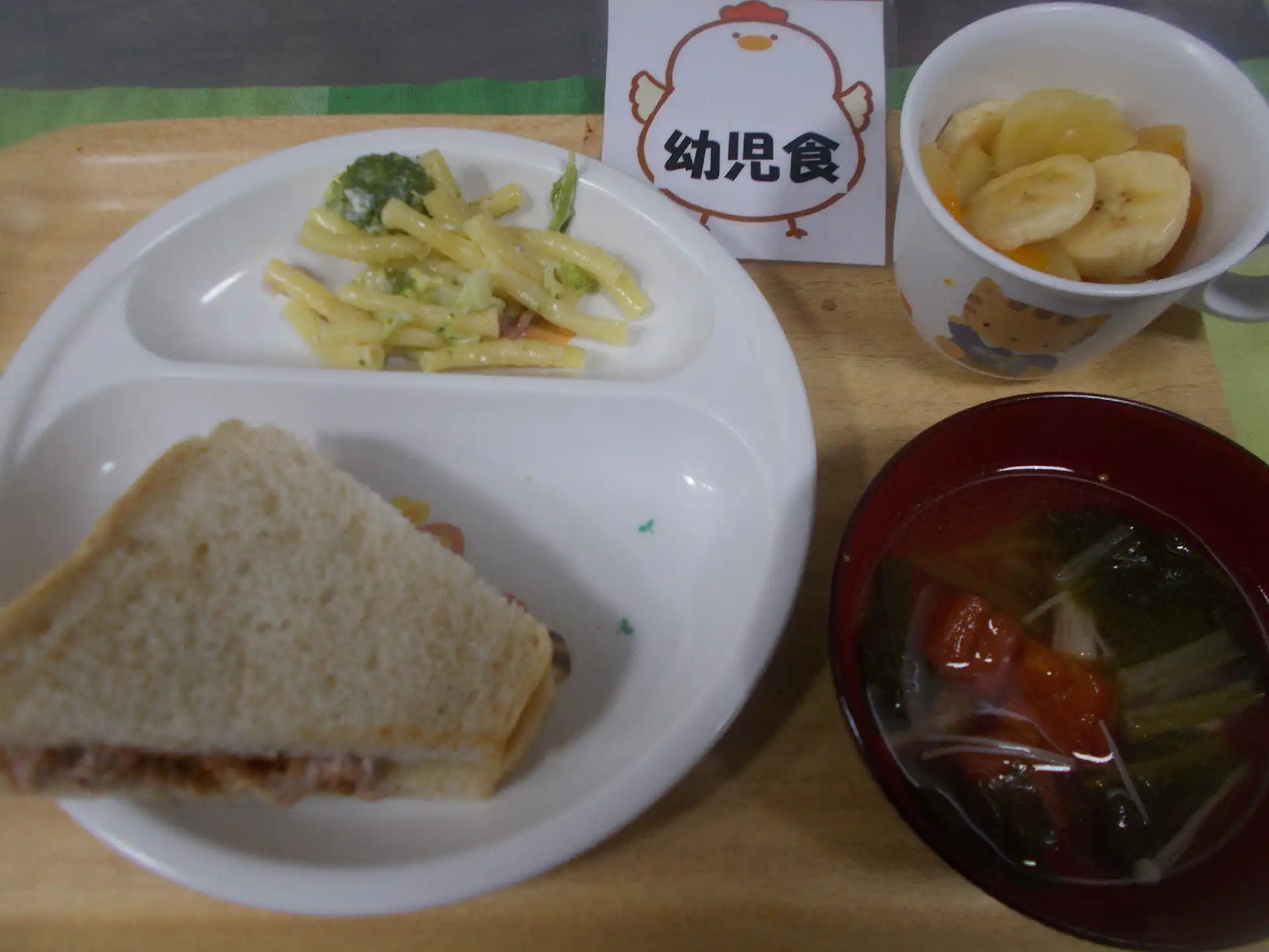 給食 | ハムカツサンド、マカロニサラダ、野菜スープ、ヨーグルト(ジャム) 離乳食(完了):パン、ツナディップ、マカロニサラダ、野菜スープ、ヨーグルト |