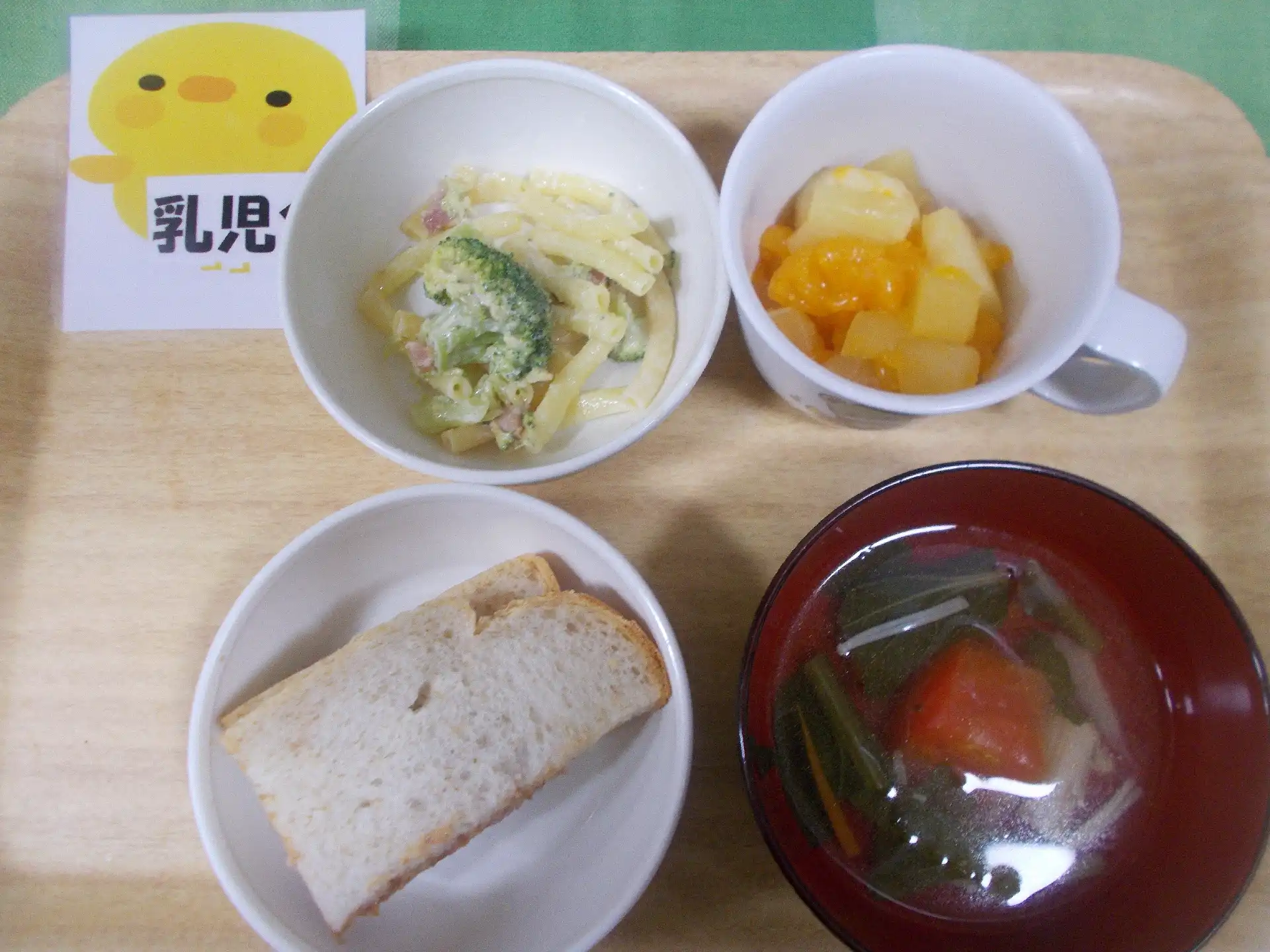 給食 | ベーコンエッグサンド、マカロニサラダ、豆乳シチュー、フルーツポンチ 離乳食(完了):パン、ツナ、マカロニサラダ、豆乳シチュー、バナナ |