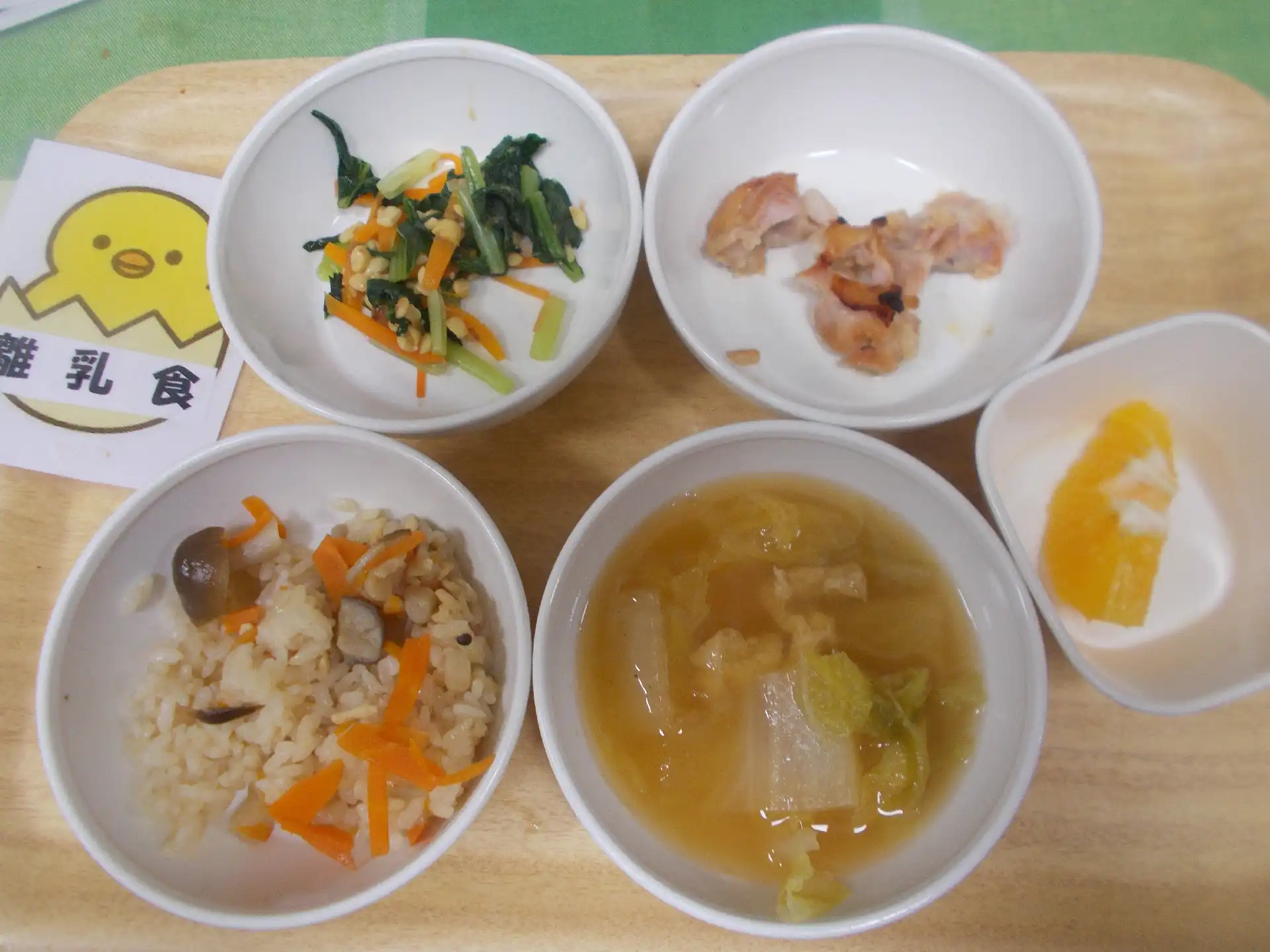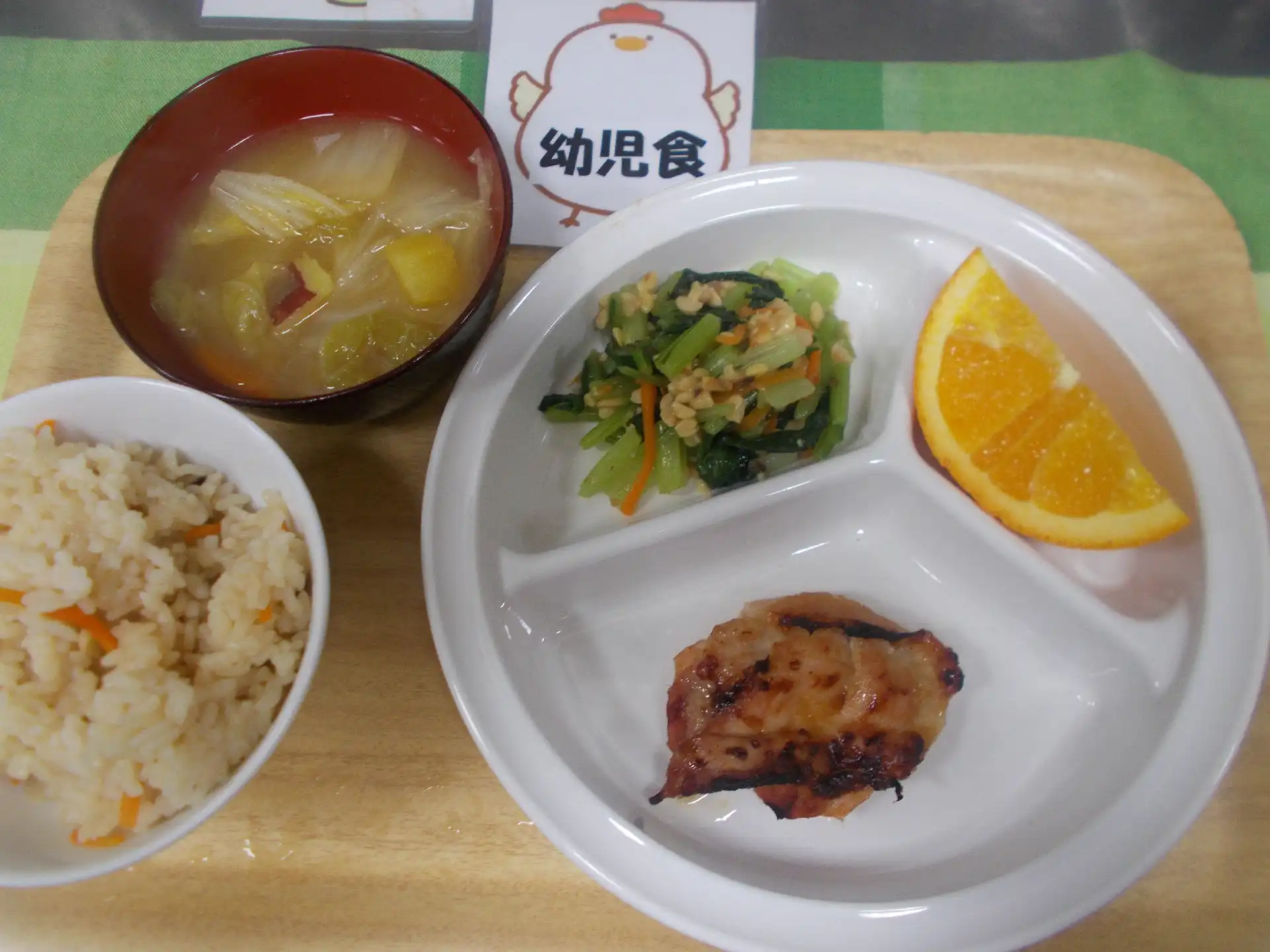 給食 | きのこおこわ、鶏肉のみそ焼き、小松菜納豆和え、薩摩汁、オレンジ 離乳:乳児と同じ ※鶏肉しょうゆこうじ焼きからみそ焼きに変更しました。 | ||